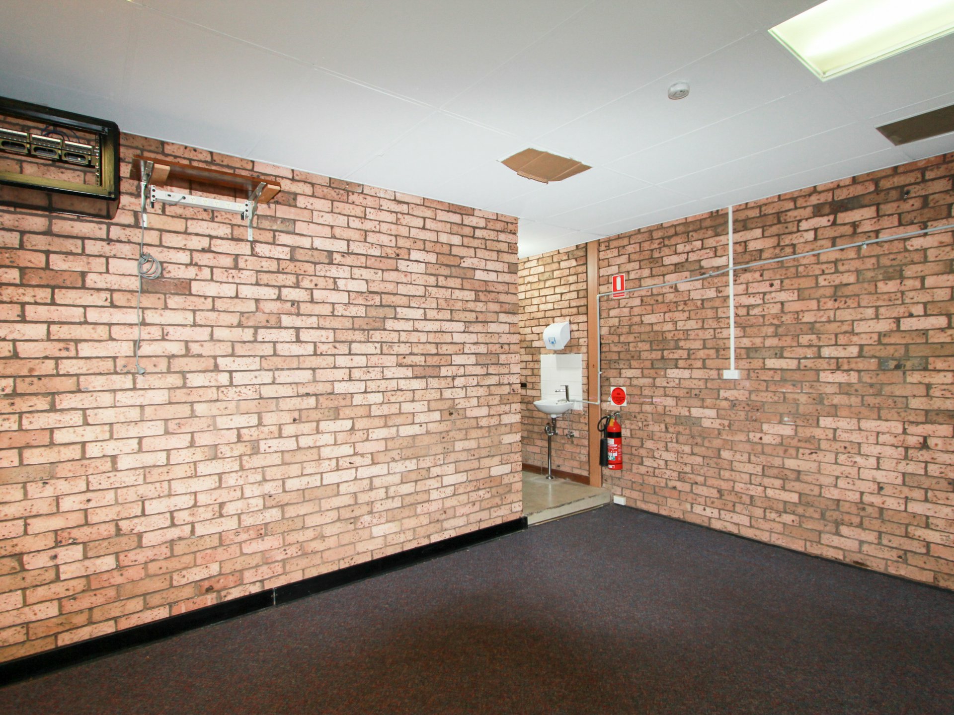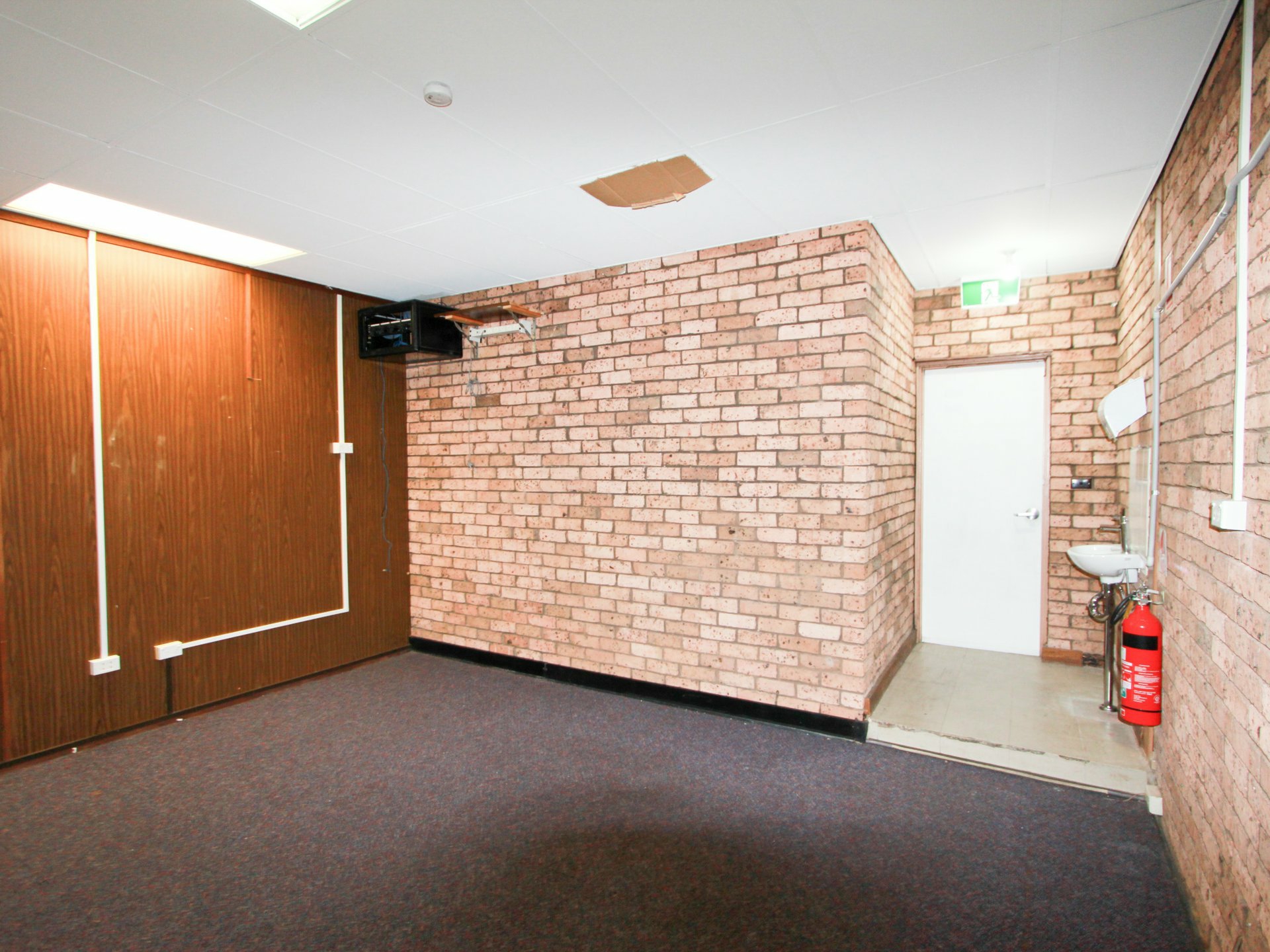 The interior is well-presented, featuring carpeted flooring, a suspended ceiling with integrated lighting, and a split-system air conditioning unit for consistent climate control. The layout includes a partitioned workspace suitable for private meetings or focused tasks, along with rear access that provides added flexibility for day-to-day operations.