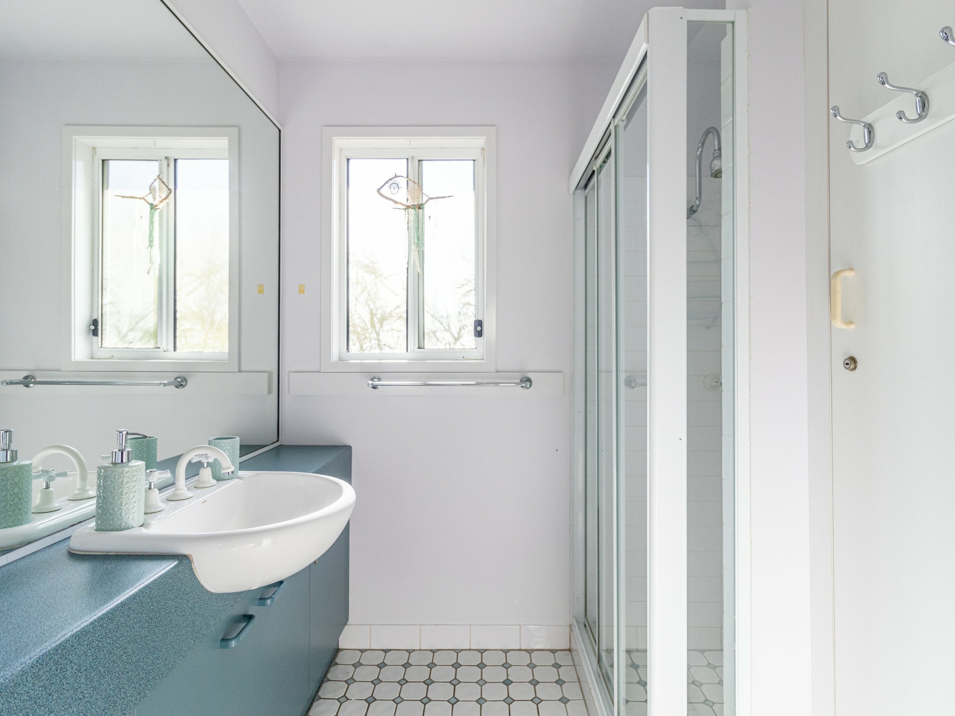 Continuing through the cabin, you'll find a bathroom with a shower and sink on the left, and a separate toilet on the right. The two bedrooms feature comfortable beds and extra blankets to ensure a restful night's sleep.