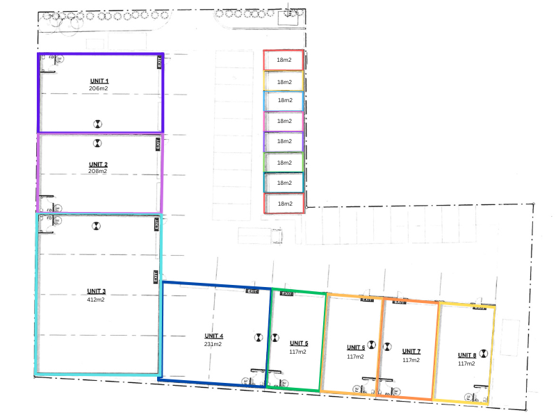 There are eight storage sheds with high roller doors. Each storage shed measures 3m x 6m approx.