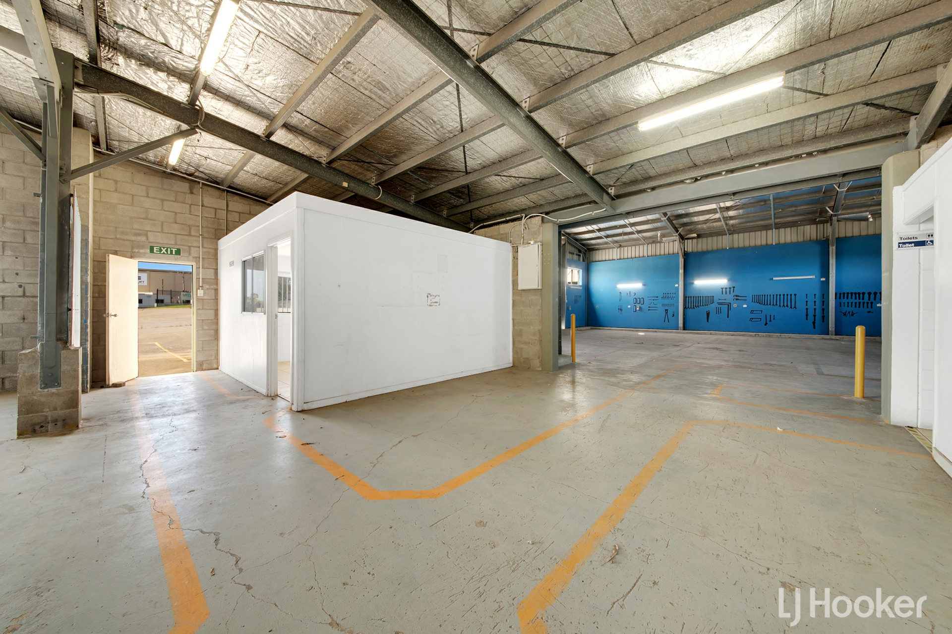 • One long large industrial shed suitable for plant, machinery, or workshop use with amenities in the centre seperating into two workshop areas