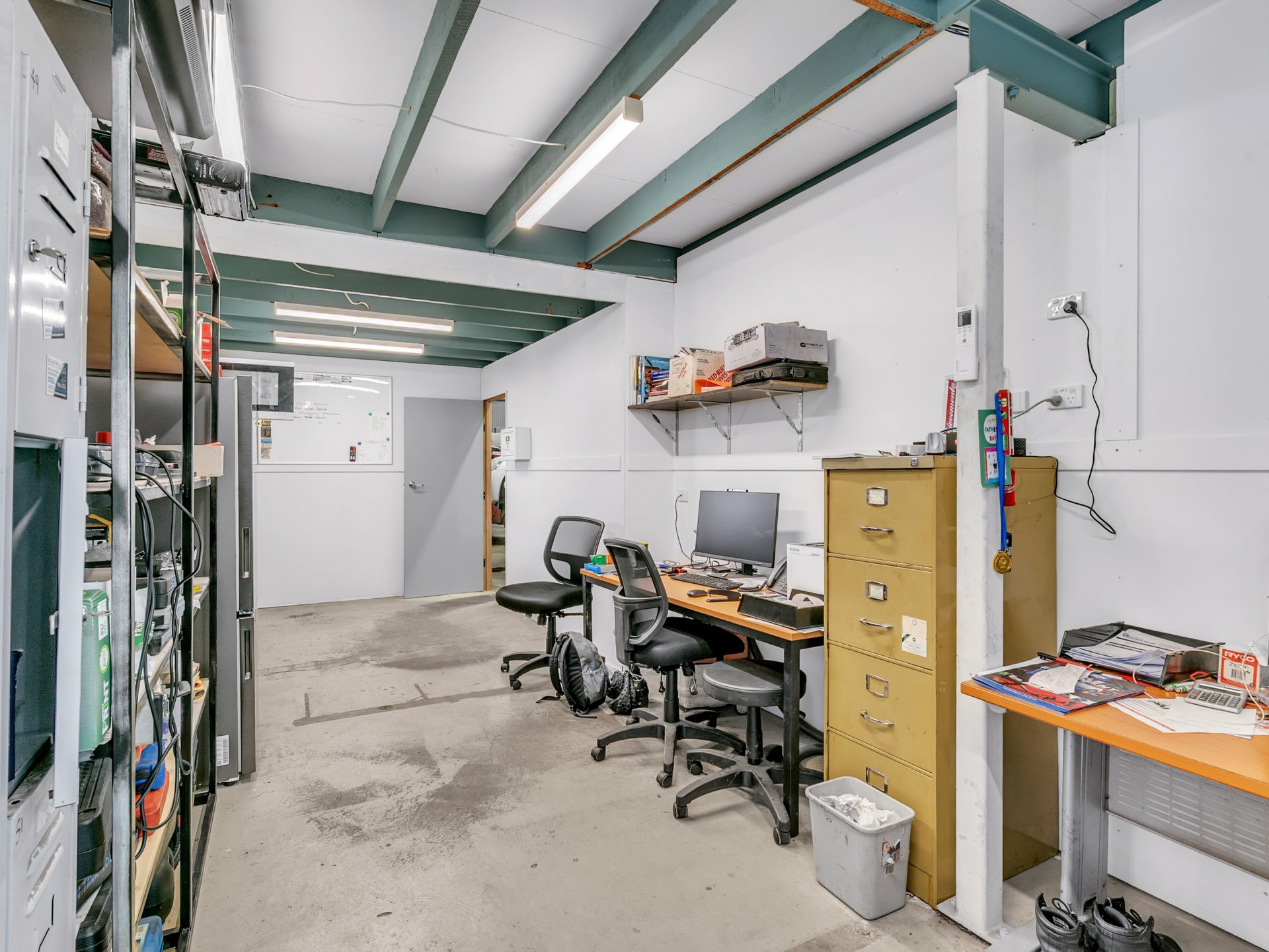- Office and amenities area with dual toilets