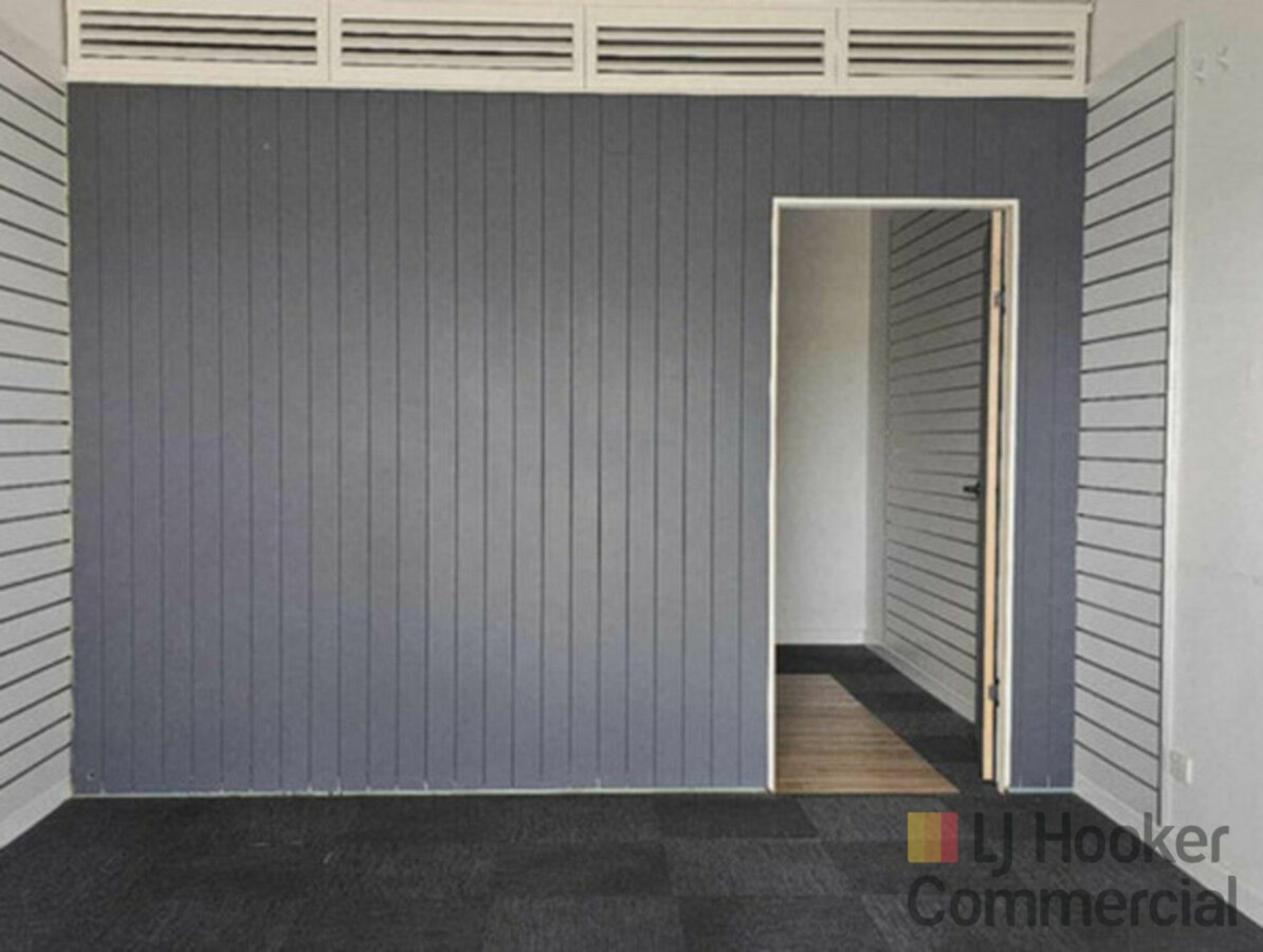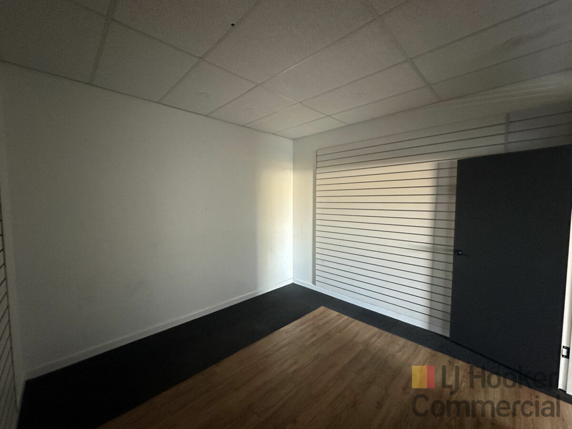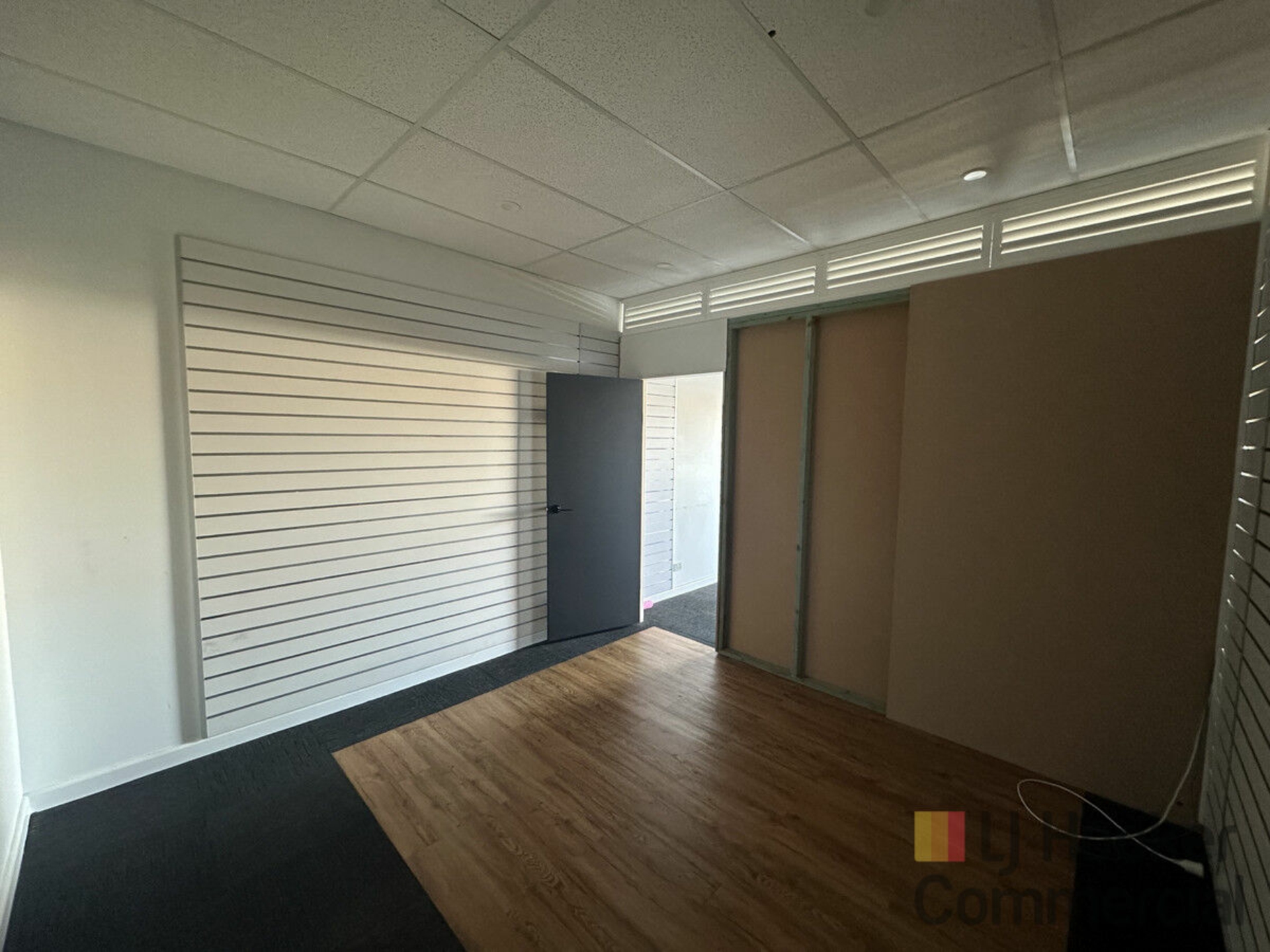 The unit features glass sliding doors at the front, creating a welcoming, light-filled office area ideal for meeting clients. Inside, the space is intelligently configured with a separate back room, perfect for storage, stock, or behind-the-scenes operations. Plantation shutters add a stylish finish while providing privacy when required.