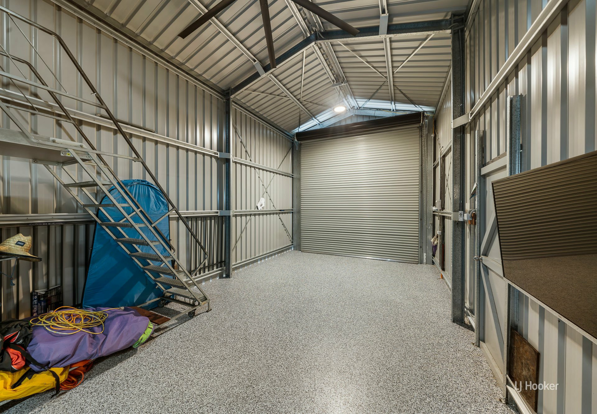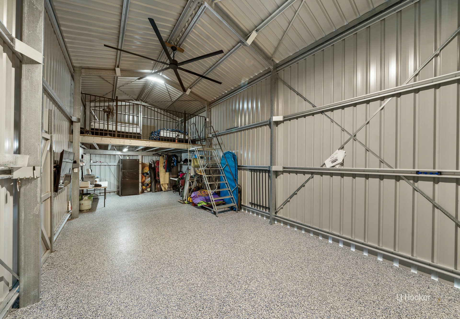 The power and water have been connected and tucked away at the end of the driveway is a 4.5m wide x 10.5m deep shed with a 3.9m high roller door opening. Certainly high enough for your wake/surf boat or caravan, new epoxy flake floor, mezzanine level with mobile stairs, huge industrial ceiling fan to dry out the boat, hot water system, and verandah.