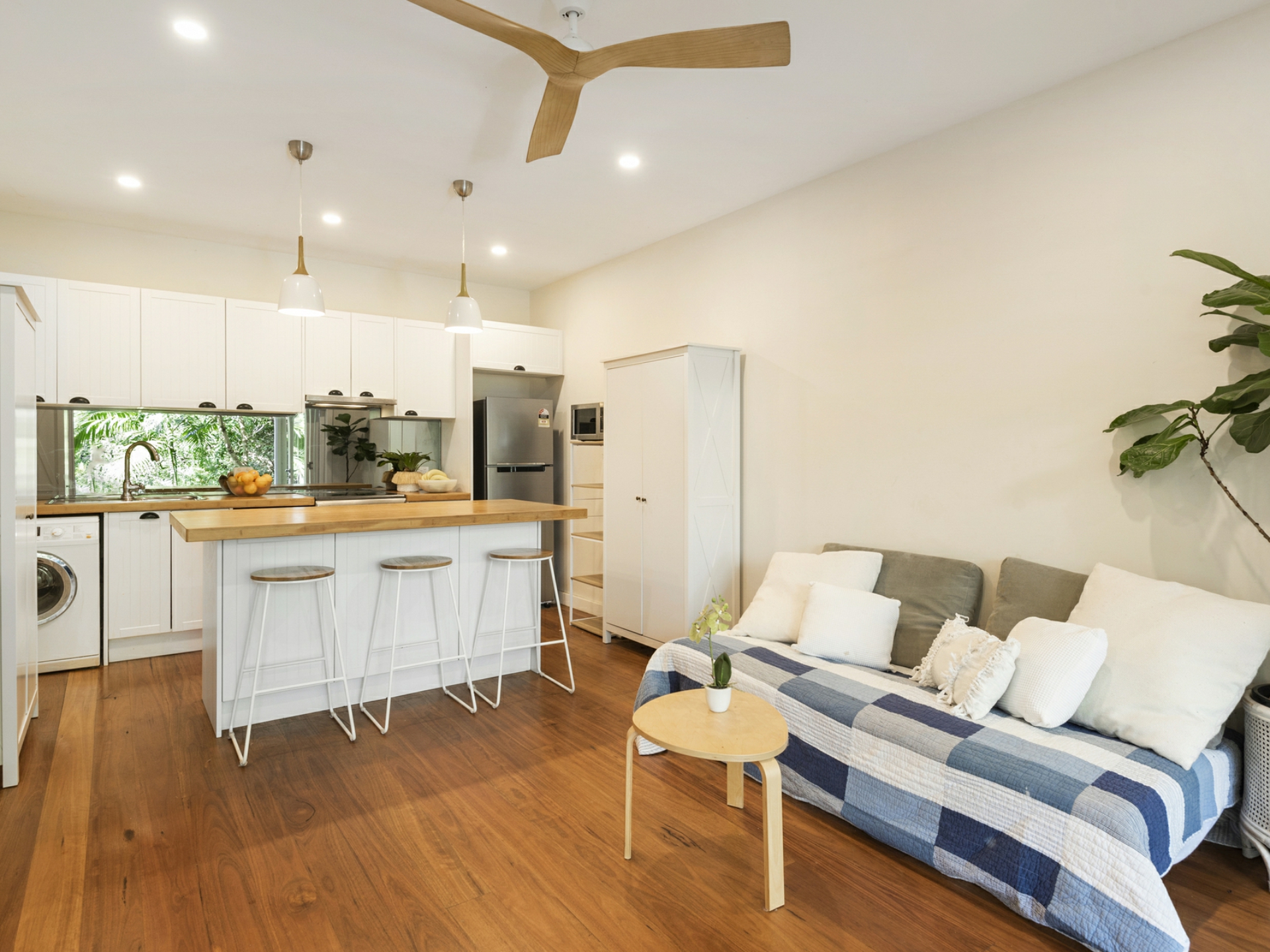 - Open plan living and kitchen area with ceiling fan