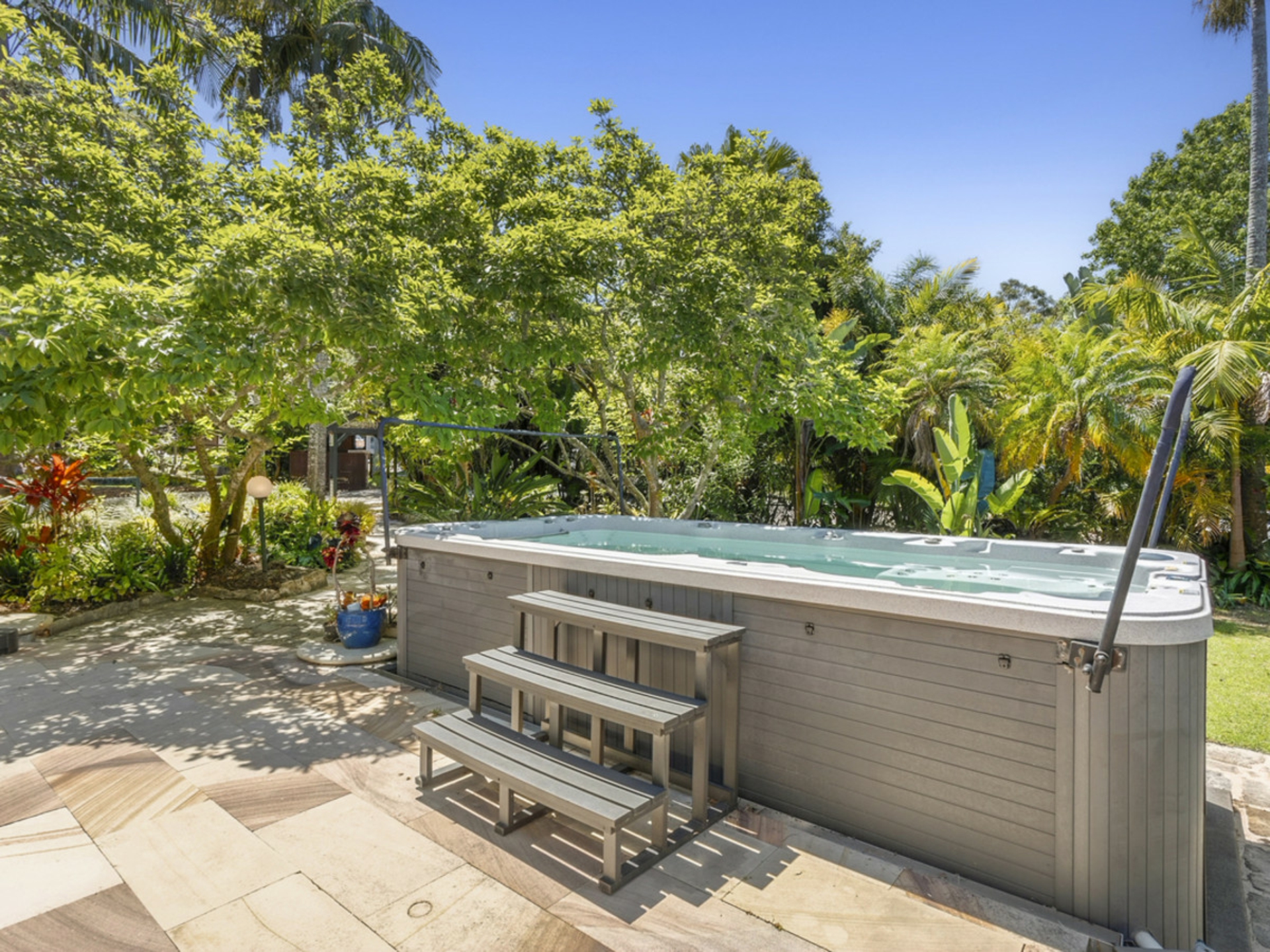Privately set behind gates and framed by lush tropical gardens, including a sun-drenched north-facing front garden, this beautifully maintained sandstone and weatherboard residence delivers generous proportions, flexible living and exceptional privacy - complete with a covered swim spa for year-round enjoyment.