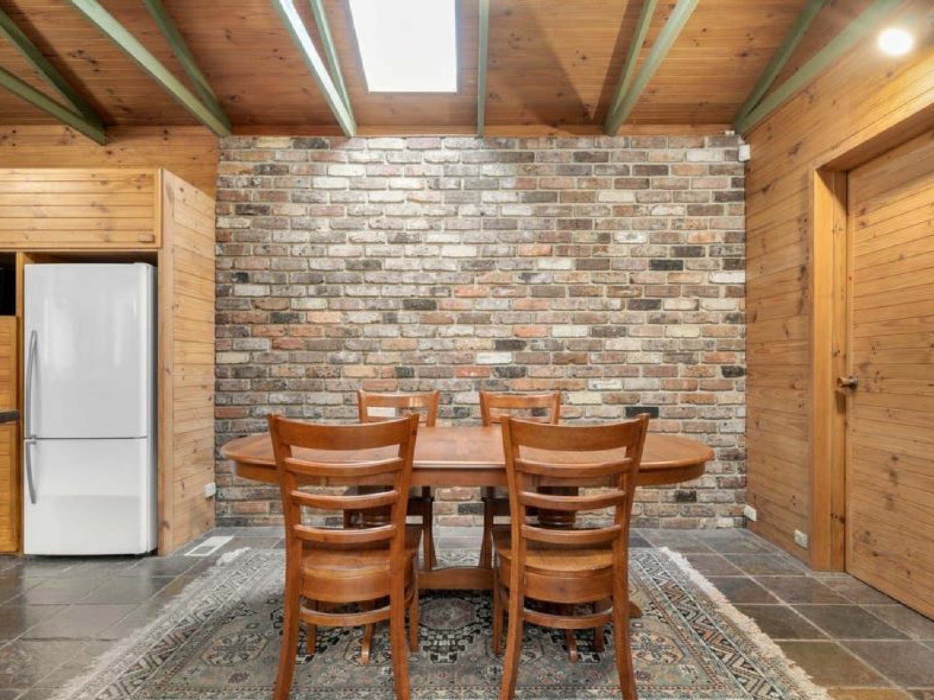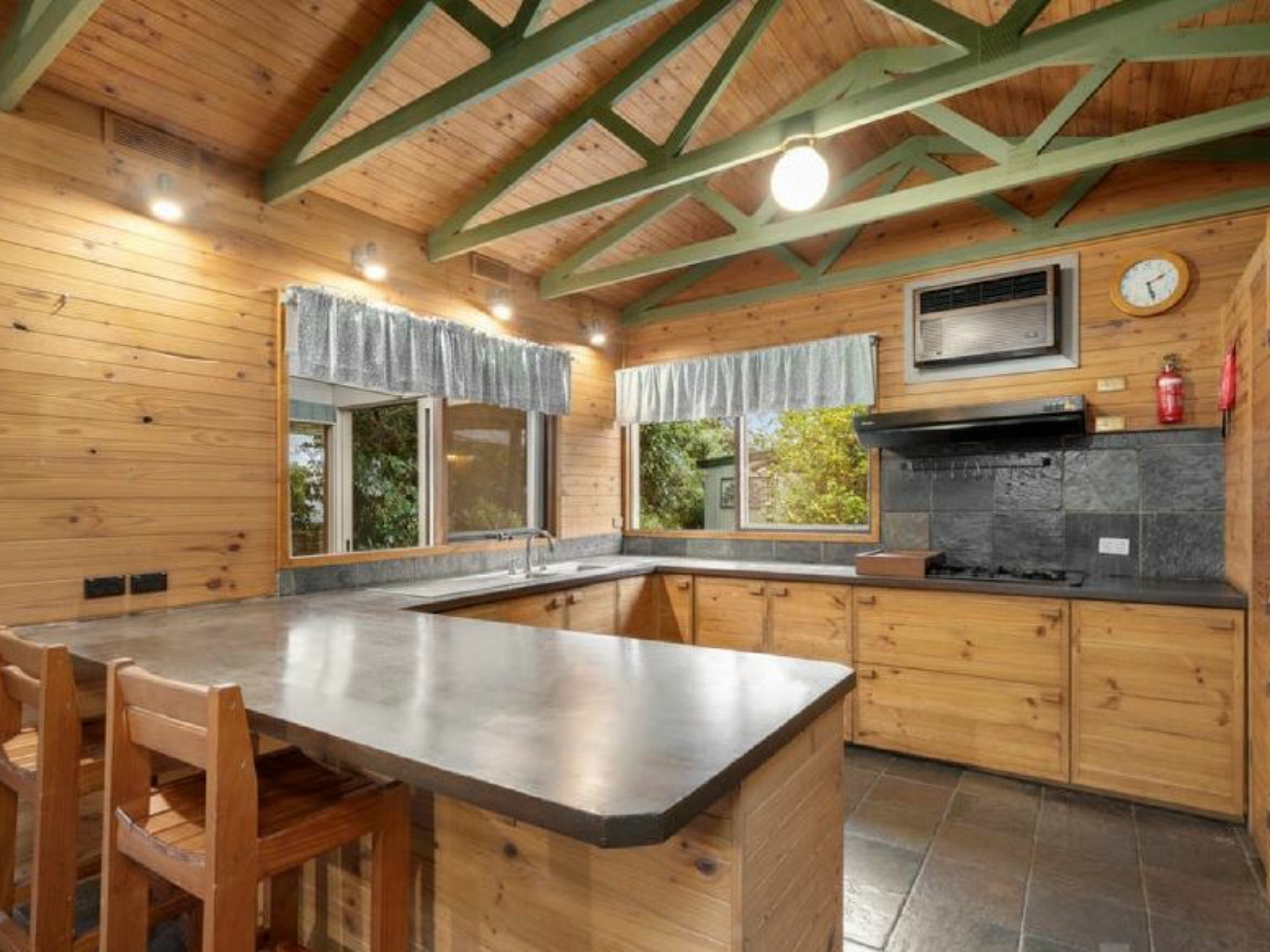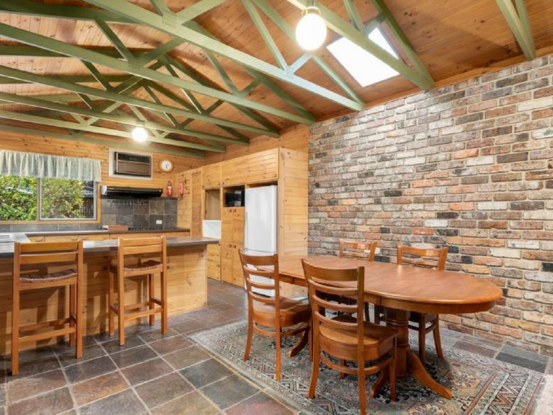 The kitchen and meals area offers high ceilings, slate flooring/splashback, timber benchtops, timber cabinetry, gas cooktop plus a breakfast bench.