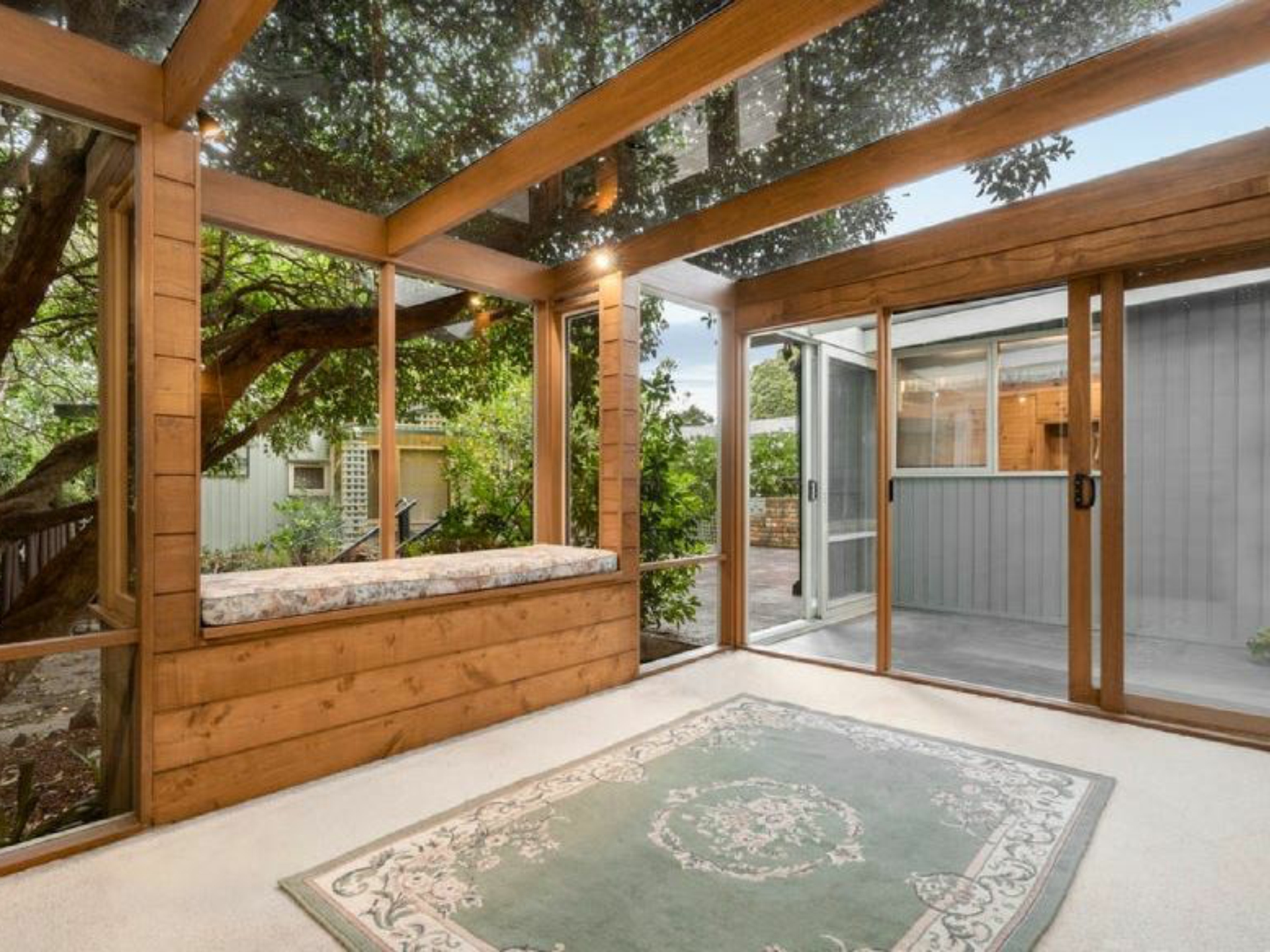 Creating the perfect space for quiet reflection, a lovely, light-filled sunroom is highlighted by window seat and a glass ceiling that draws in gorgeous light, while outside, a large deck with built-in-BBQ overlooks the back garden.