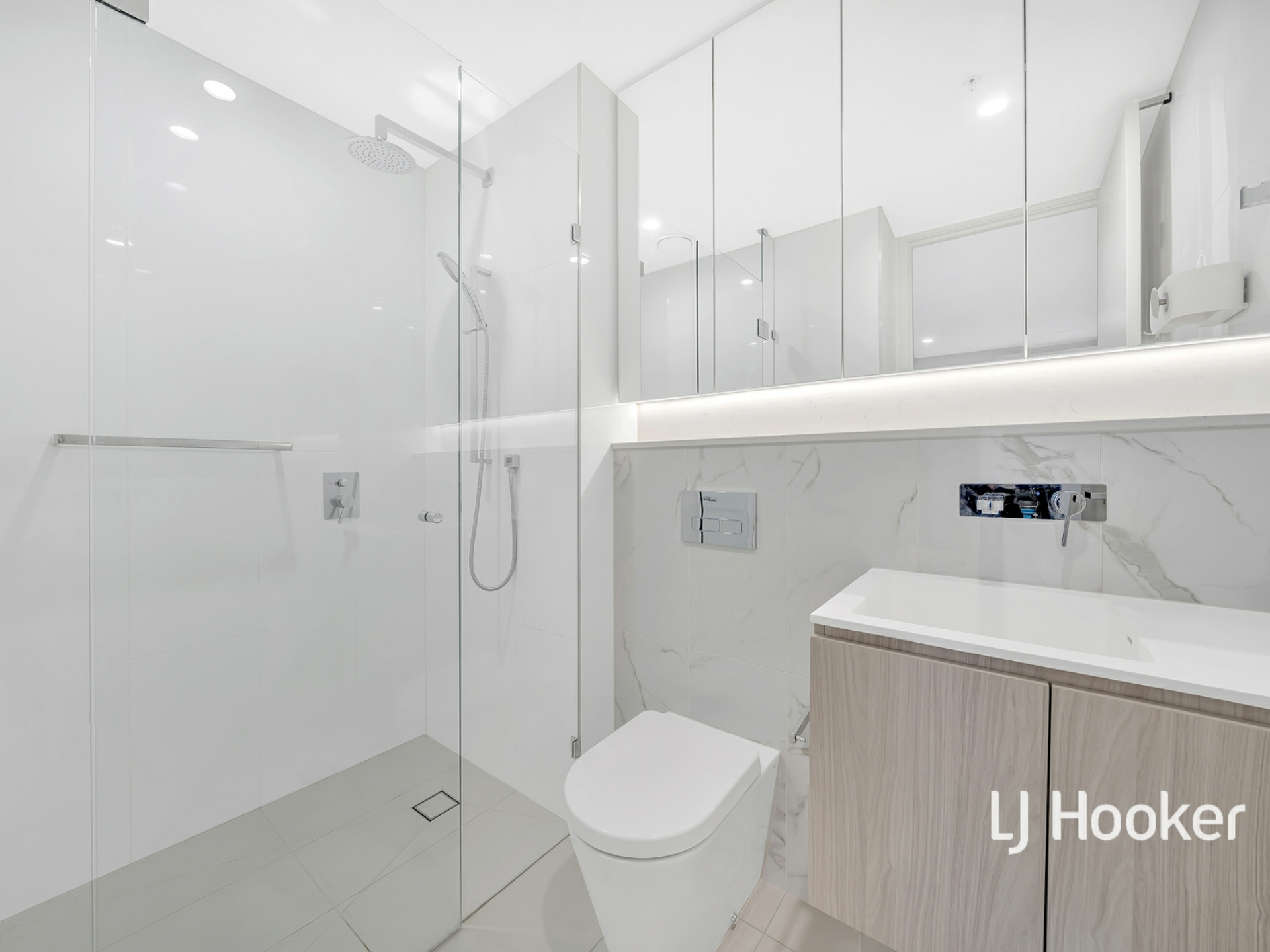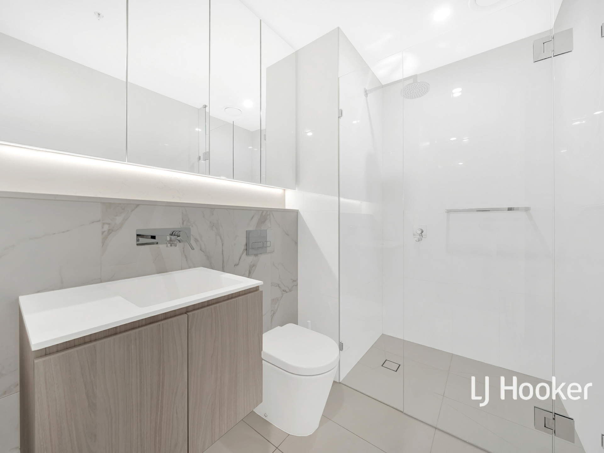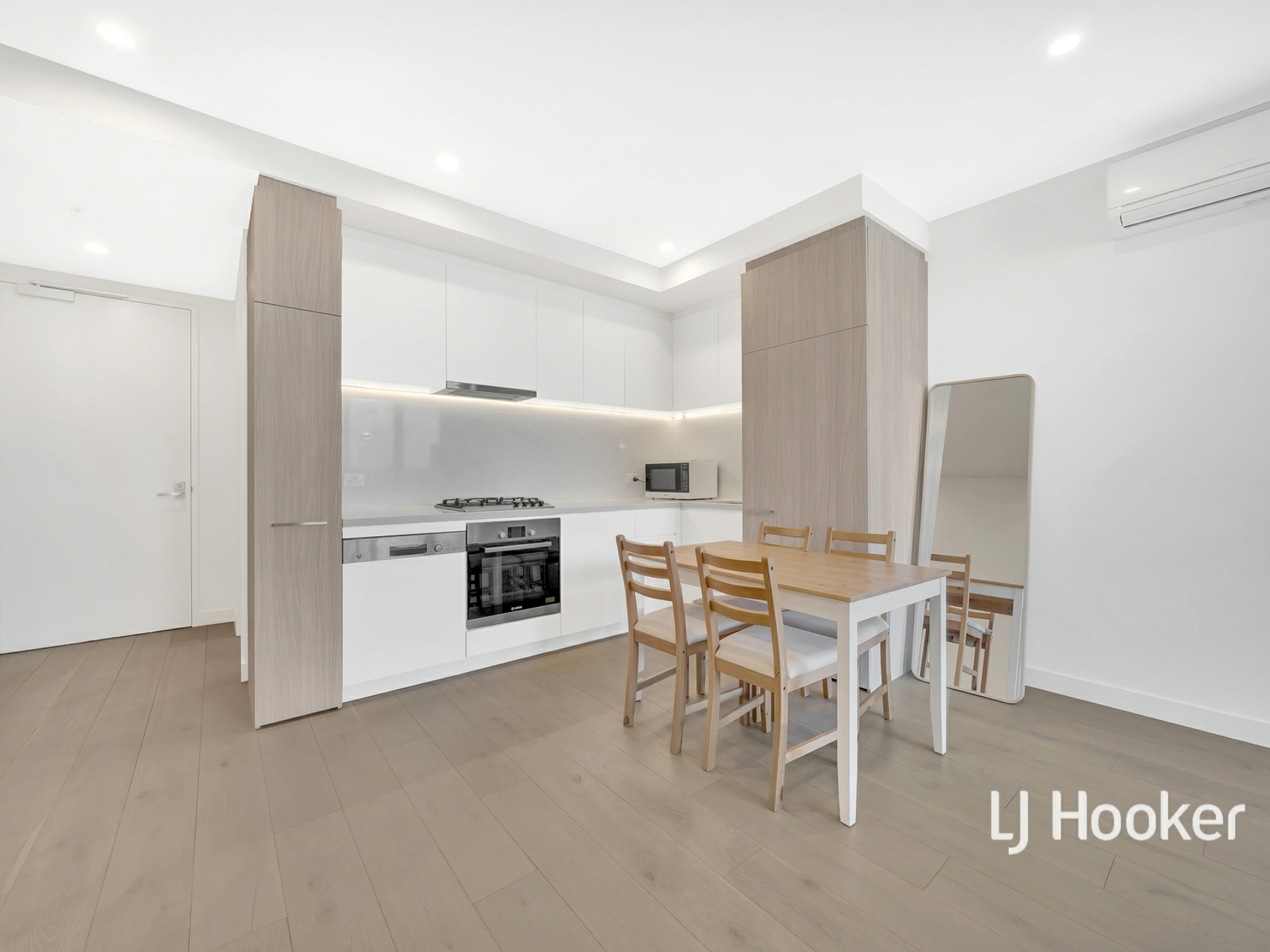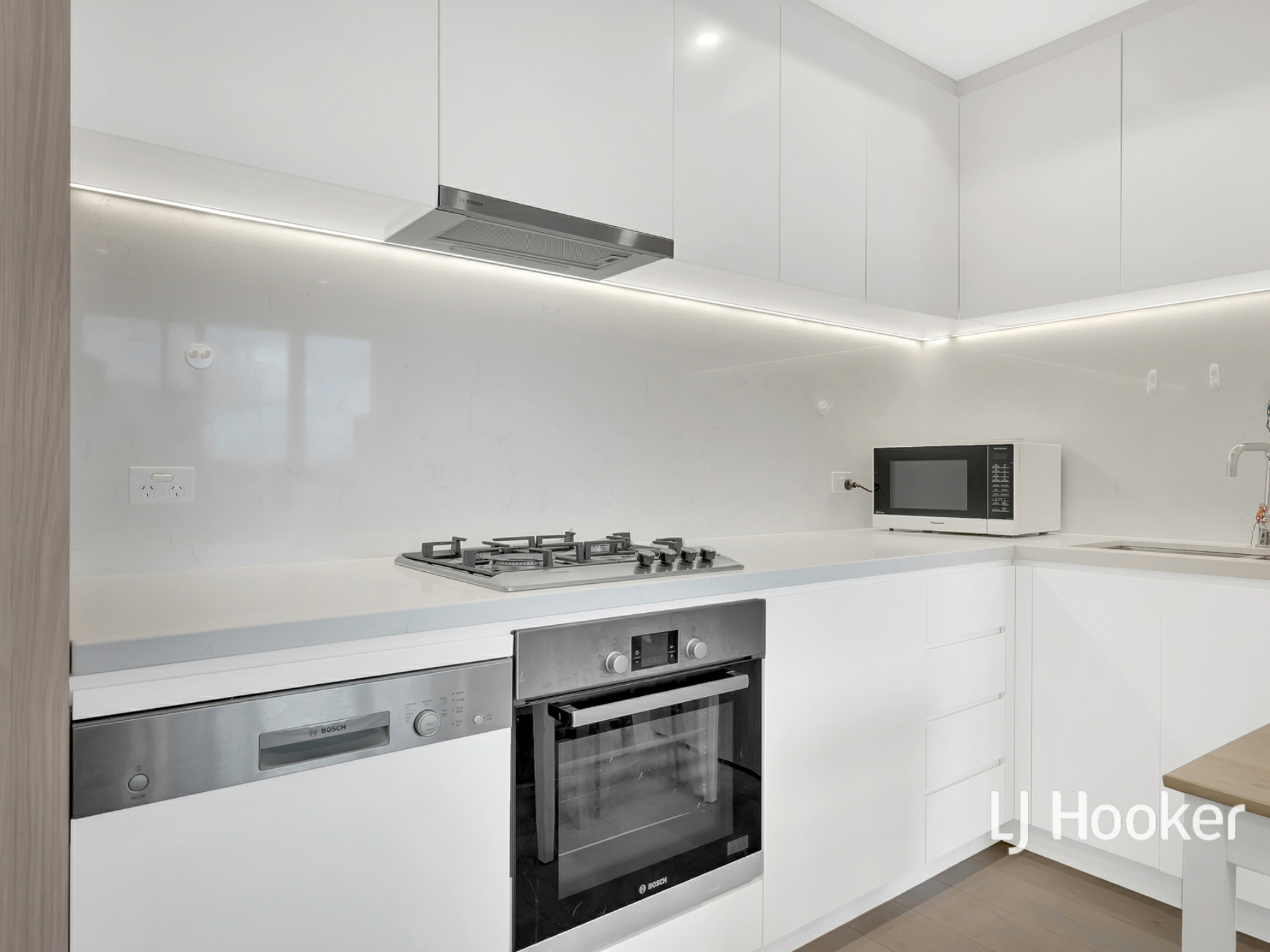 - Modern kitchen finished with high-end stainless-steel appliances and stone benchtops + dishwasher + oven