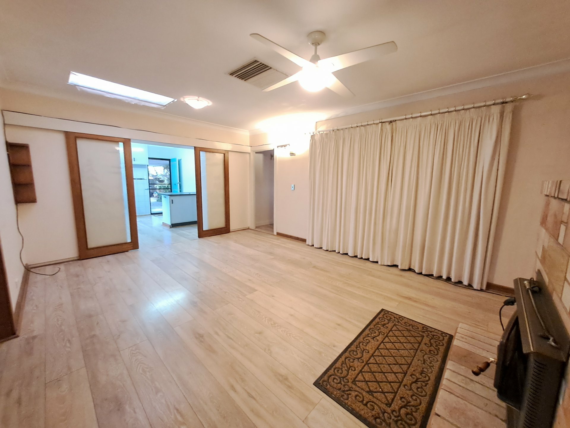 - Open plan living/dining area offering curtains, fan and timber look flooring
