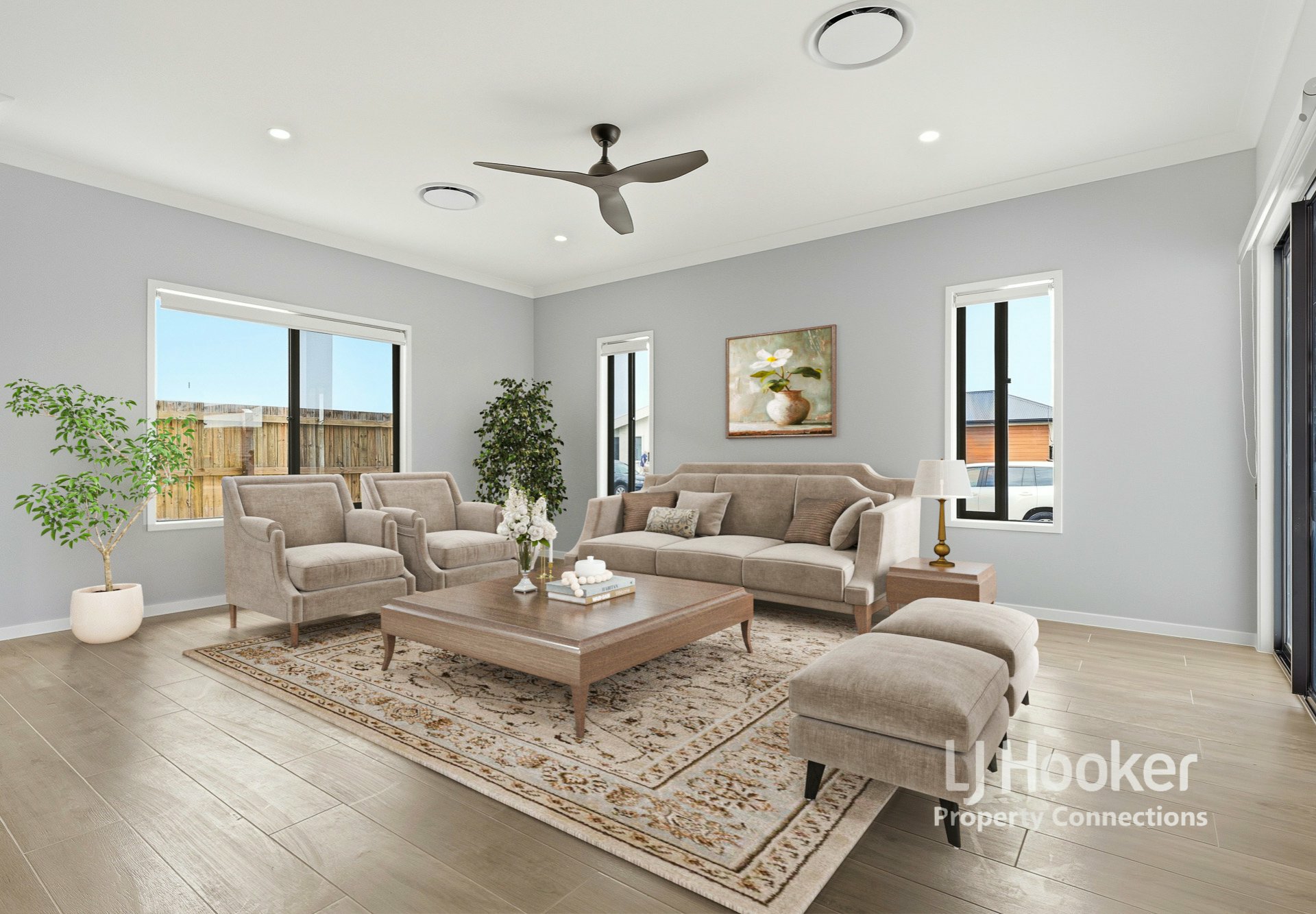 Quality tiling, modern window furnishings and ceiling fans are featured throughout, adding to the home’s stylish appeal.