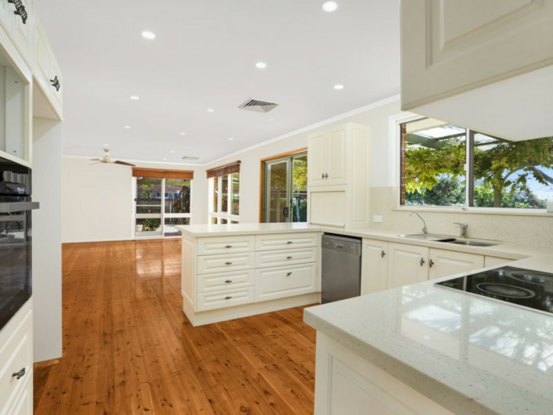 • Open plan modern kitchen with stone bench tops, stainless steel appliances