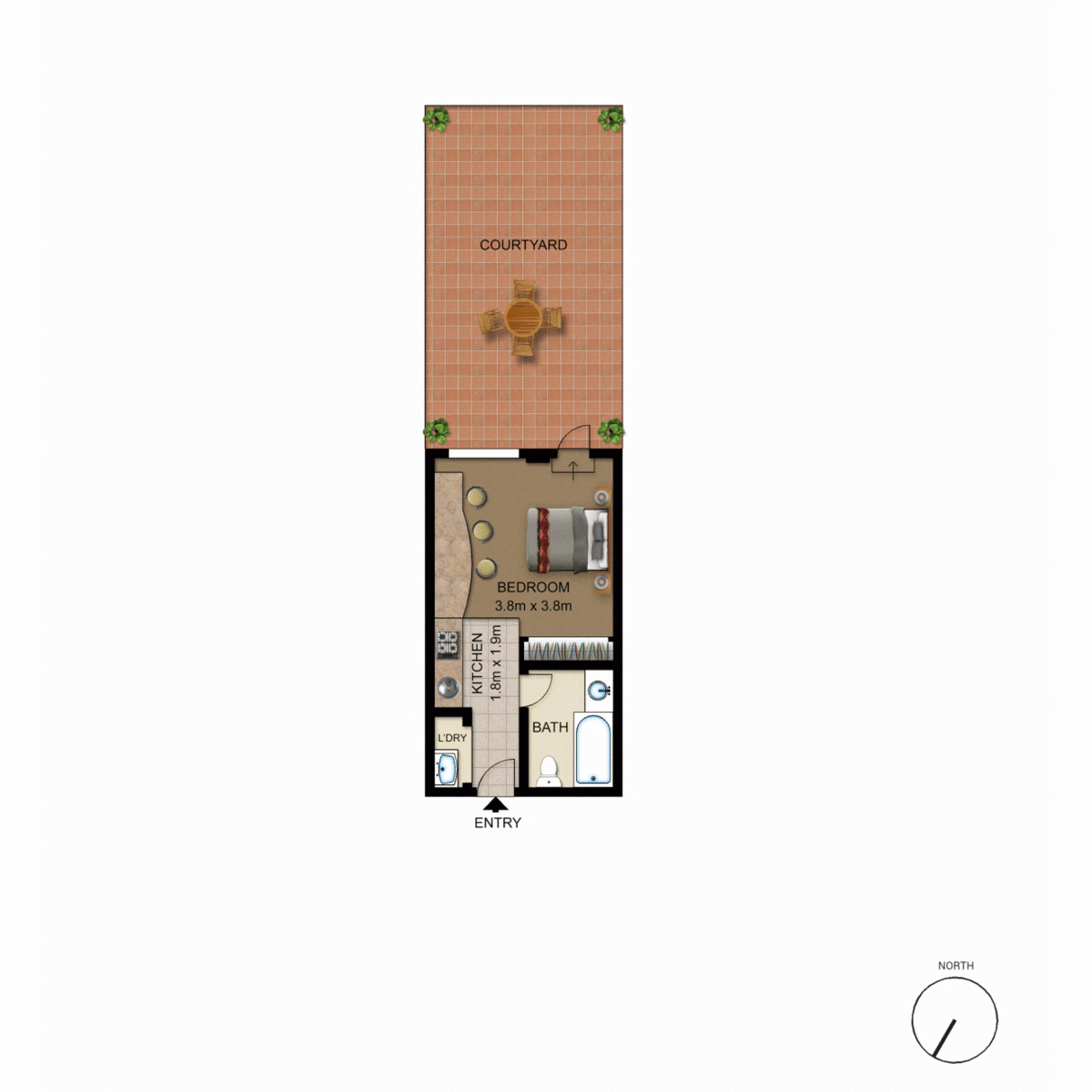 Positioned on Level 8, the apartment features a large private brick-paved courtyard, perfect for relaxing outdoors or enjoying a BBQ with friends.