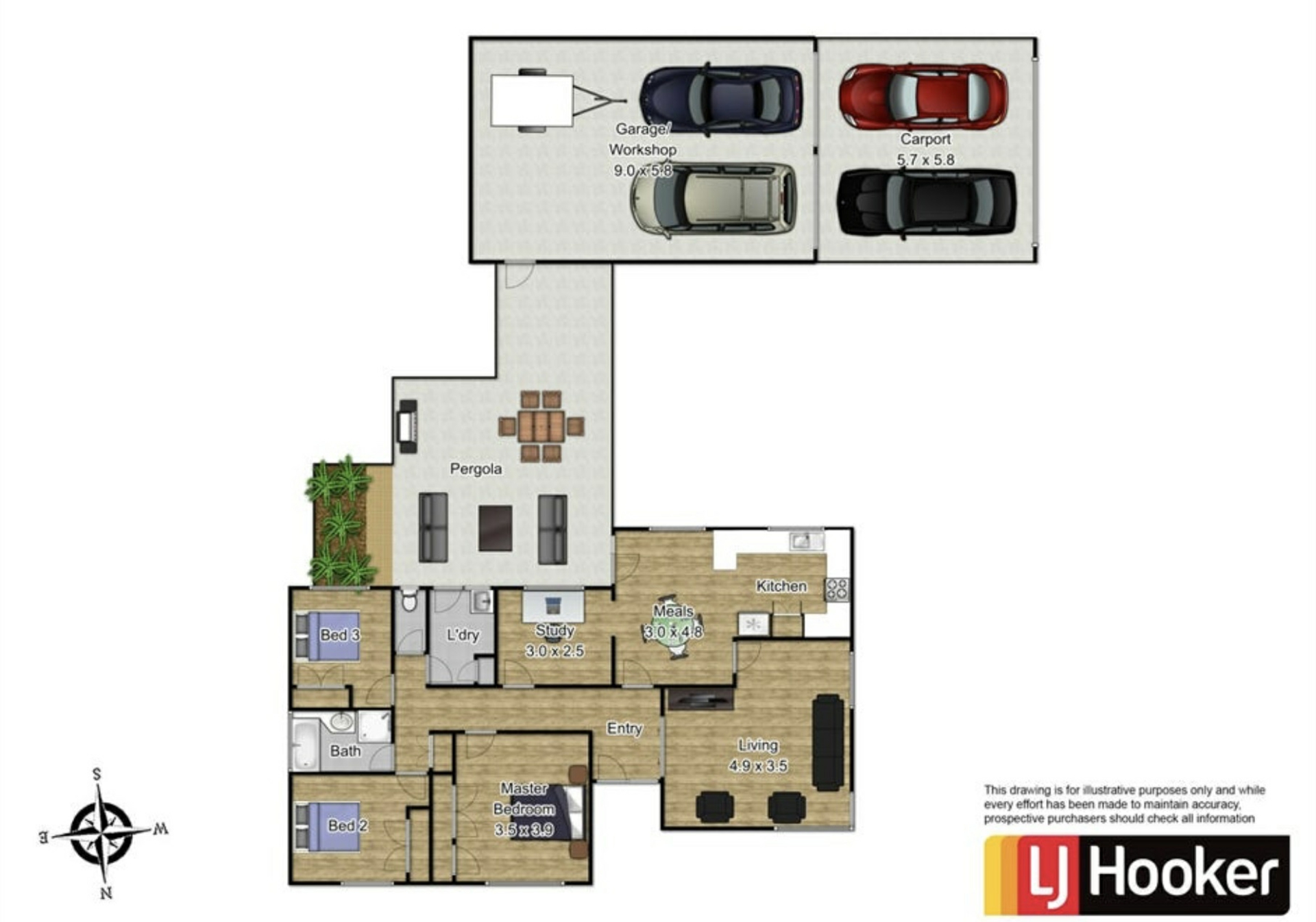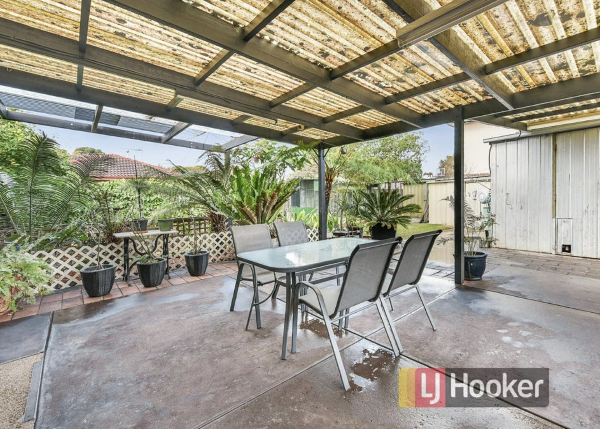 -Outdoor pergola, large garage and workshop with double side gate access.