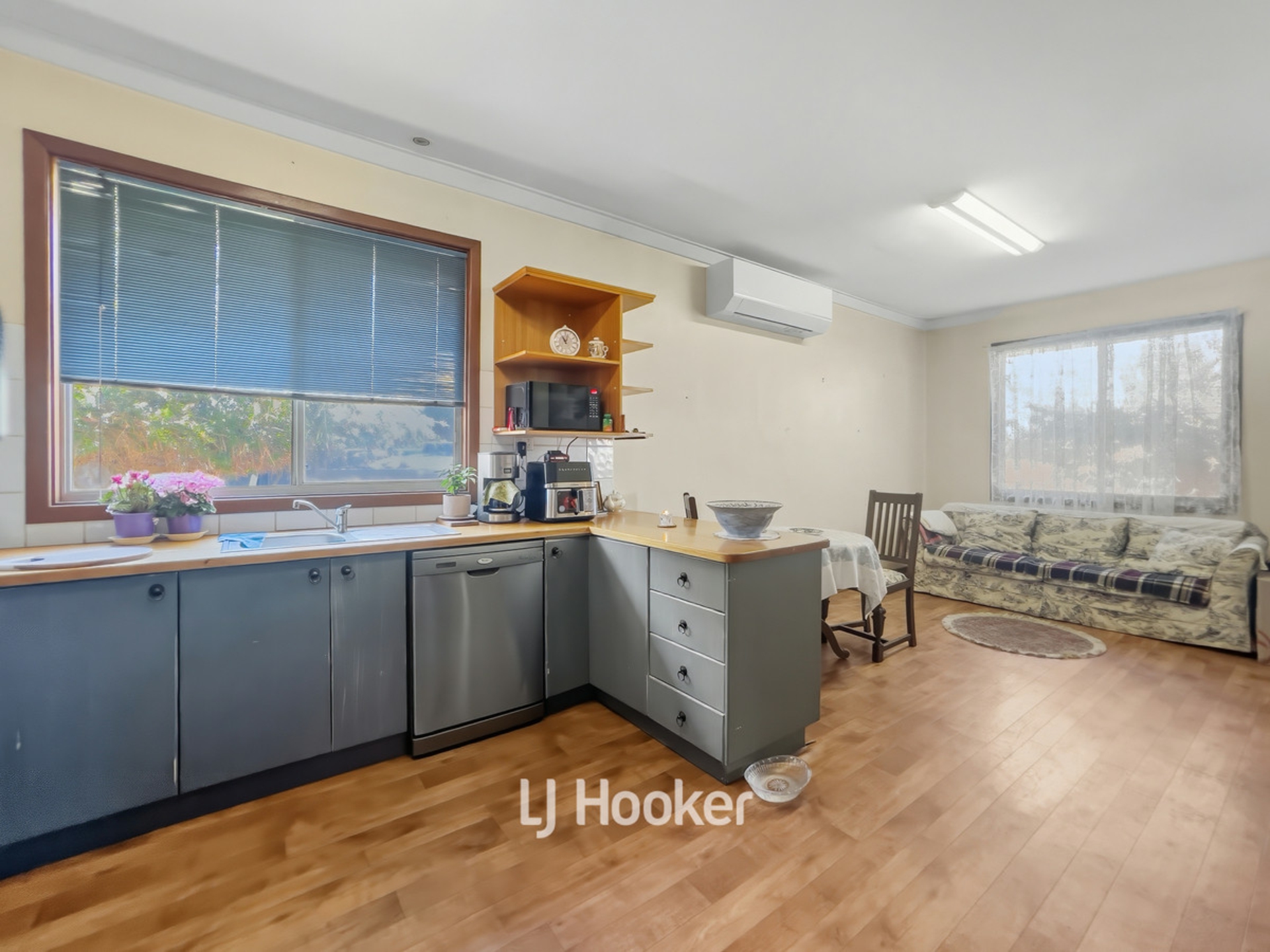 • Open plan kitchen and dining area with split system air conditioning, ample bench space, dishwasher, and shelving