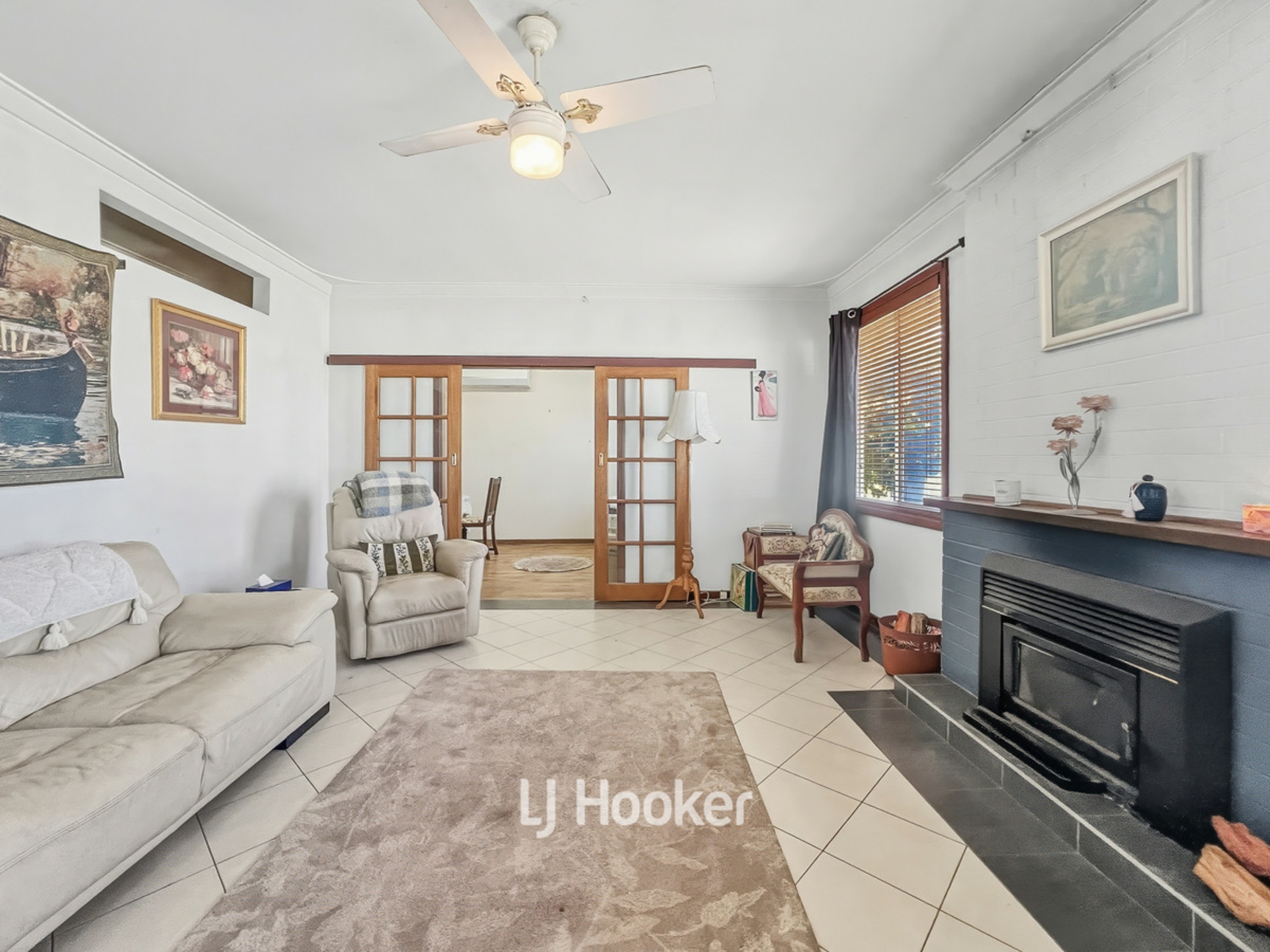 • Cosy living room with fireplace and ceiling fan - the perfect spot to unwind on cooler evenings