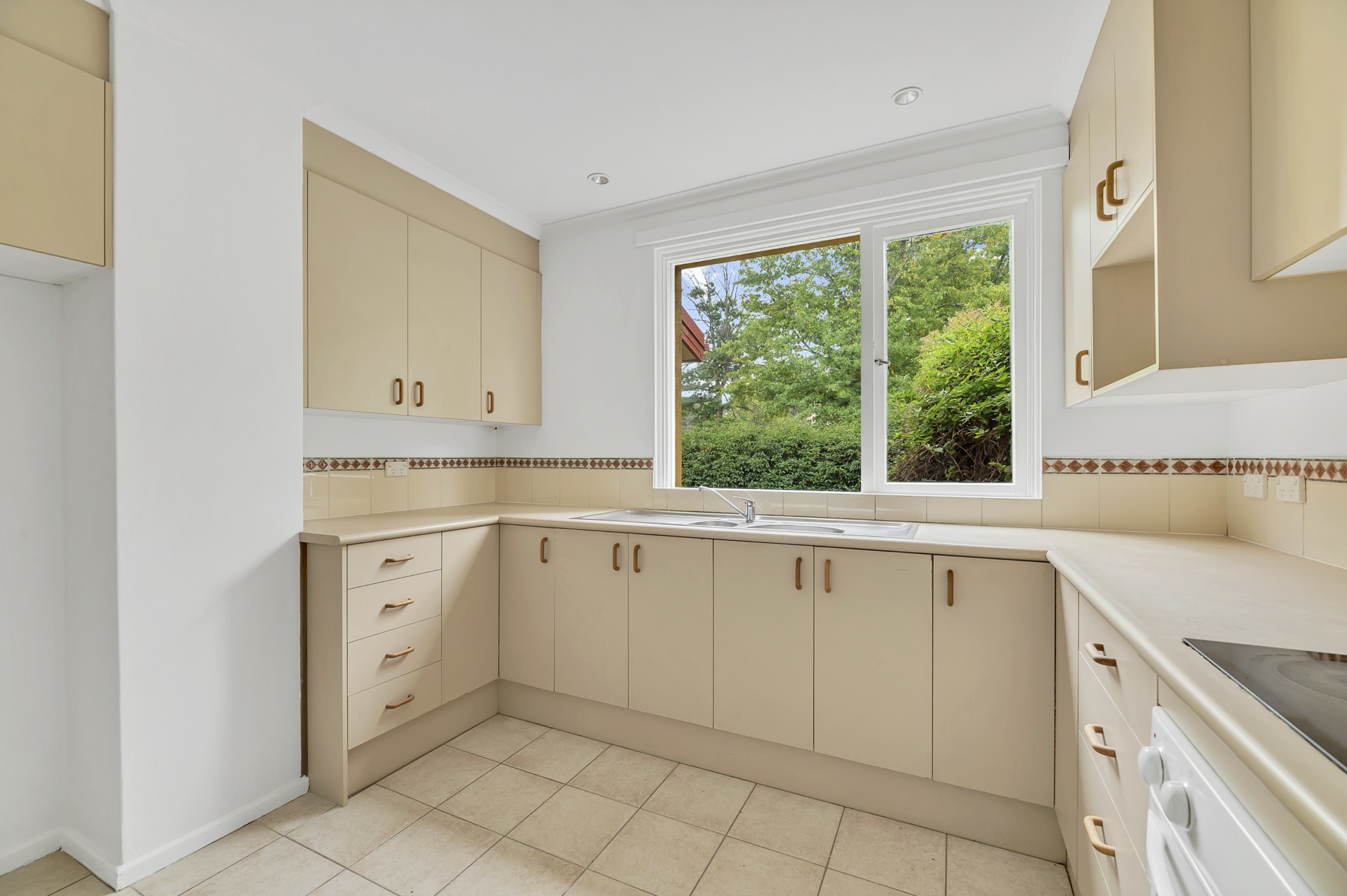 The neat, pretty kitchen with electric cooking has plenty of cupboard space and is adorned with a large window overlooking the front courtyard. Downstairs living areas with split system include a good-sized lounge / dine / sunroom, separate laundry and the third toilet. Modern window treatments throughout compliment this refurbished classy residence.