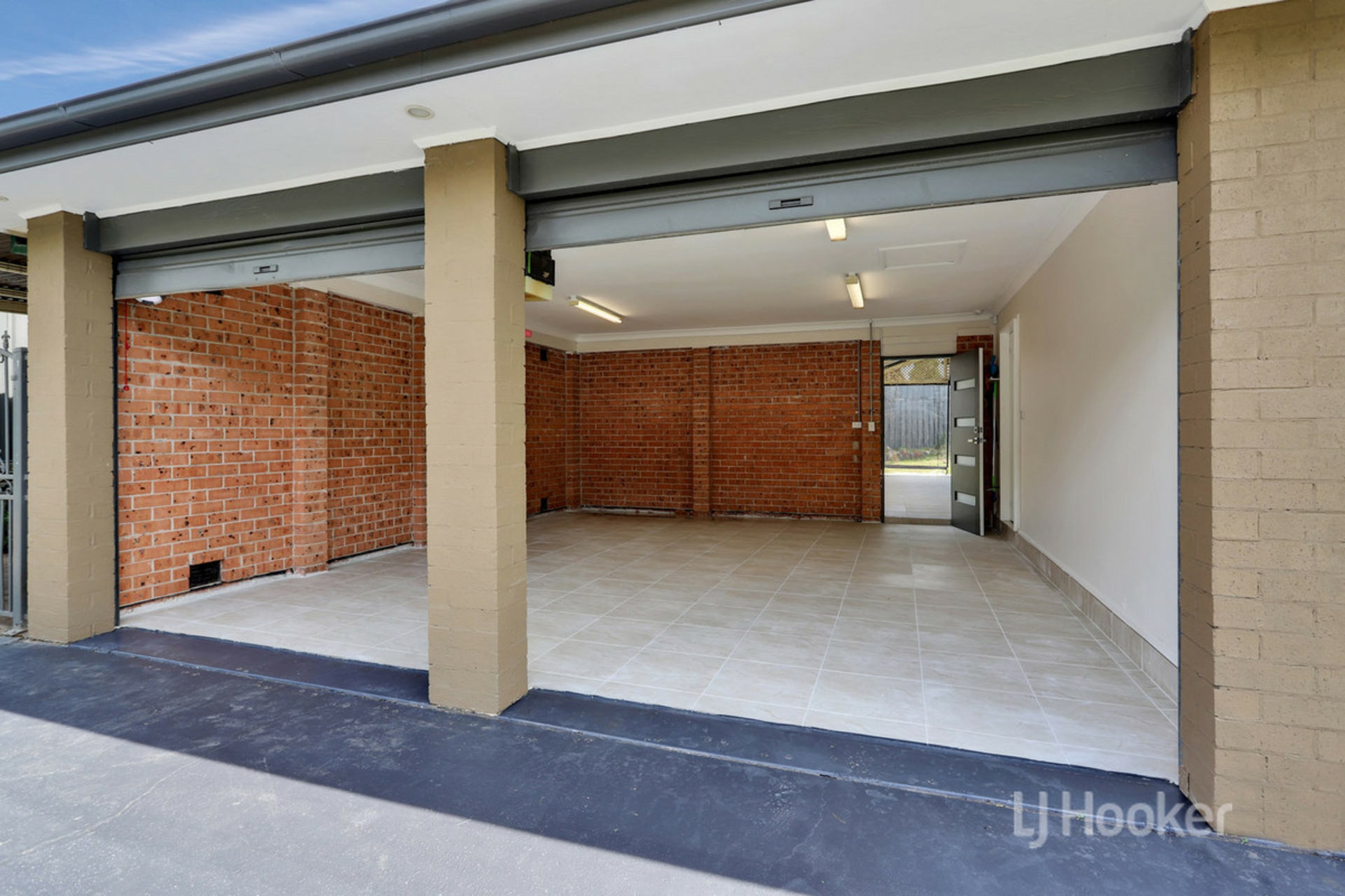 - Double remote-controlled travertine tiled garage with internal and external access