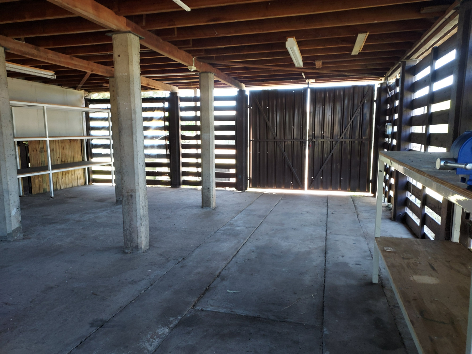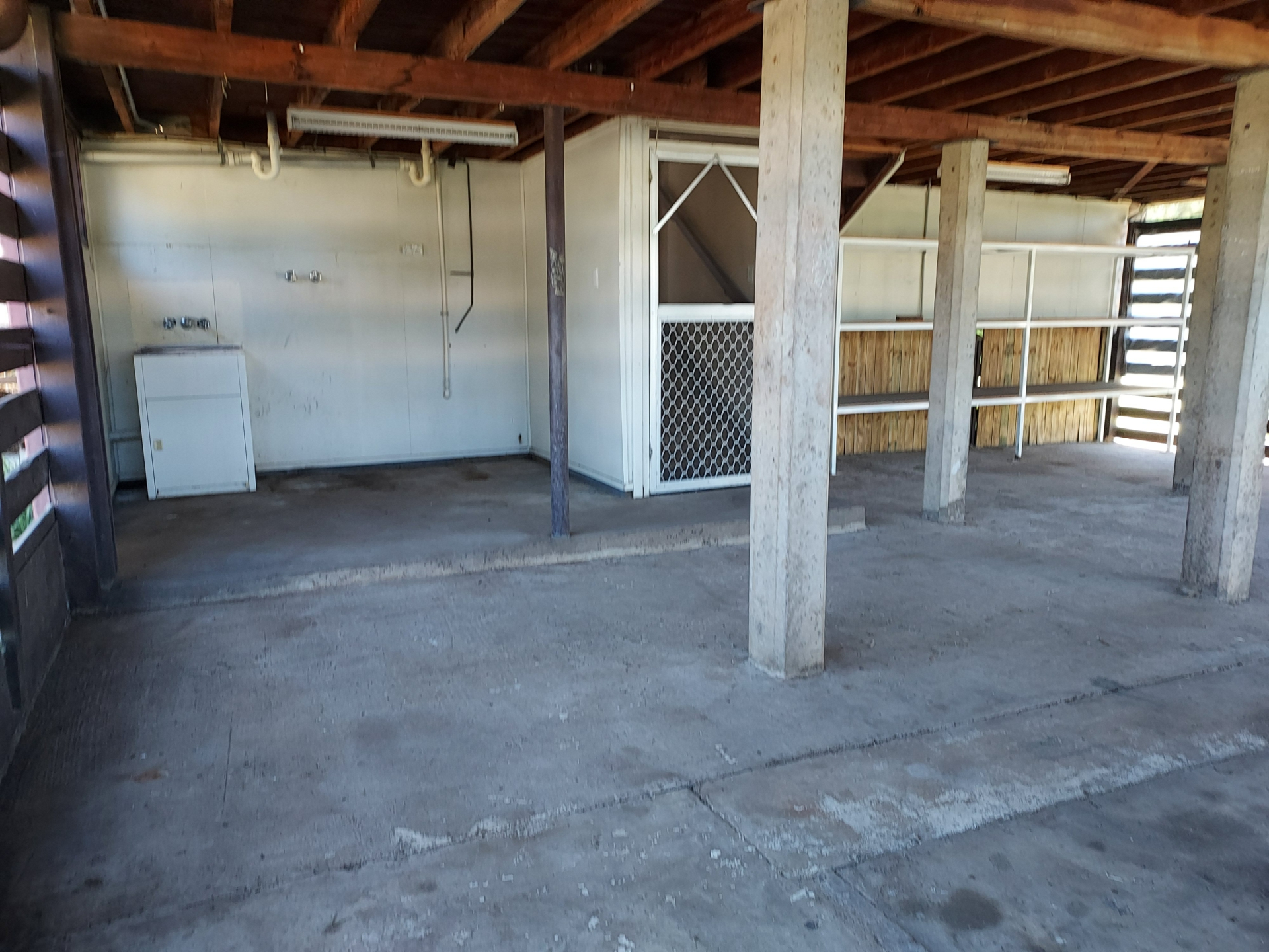 Enclosed underneath with laundry, a large area perfect for a vehicle and storage area.