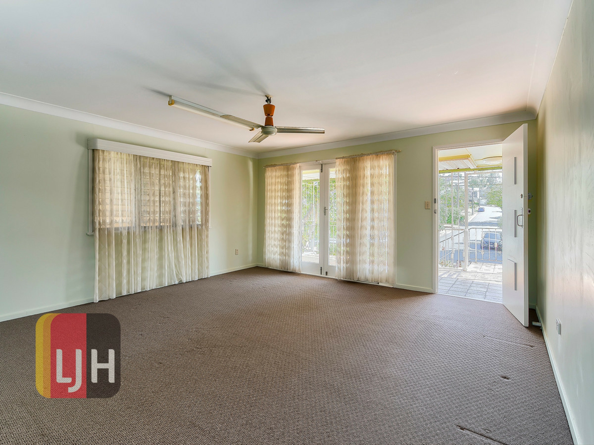 - Large living area with air conditioning and ceiling fan