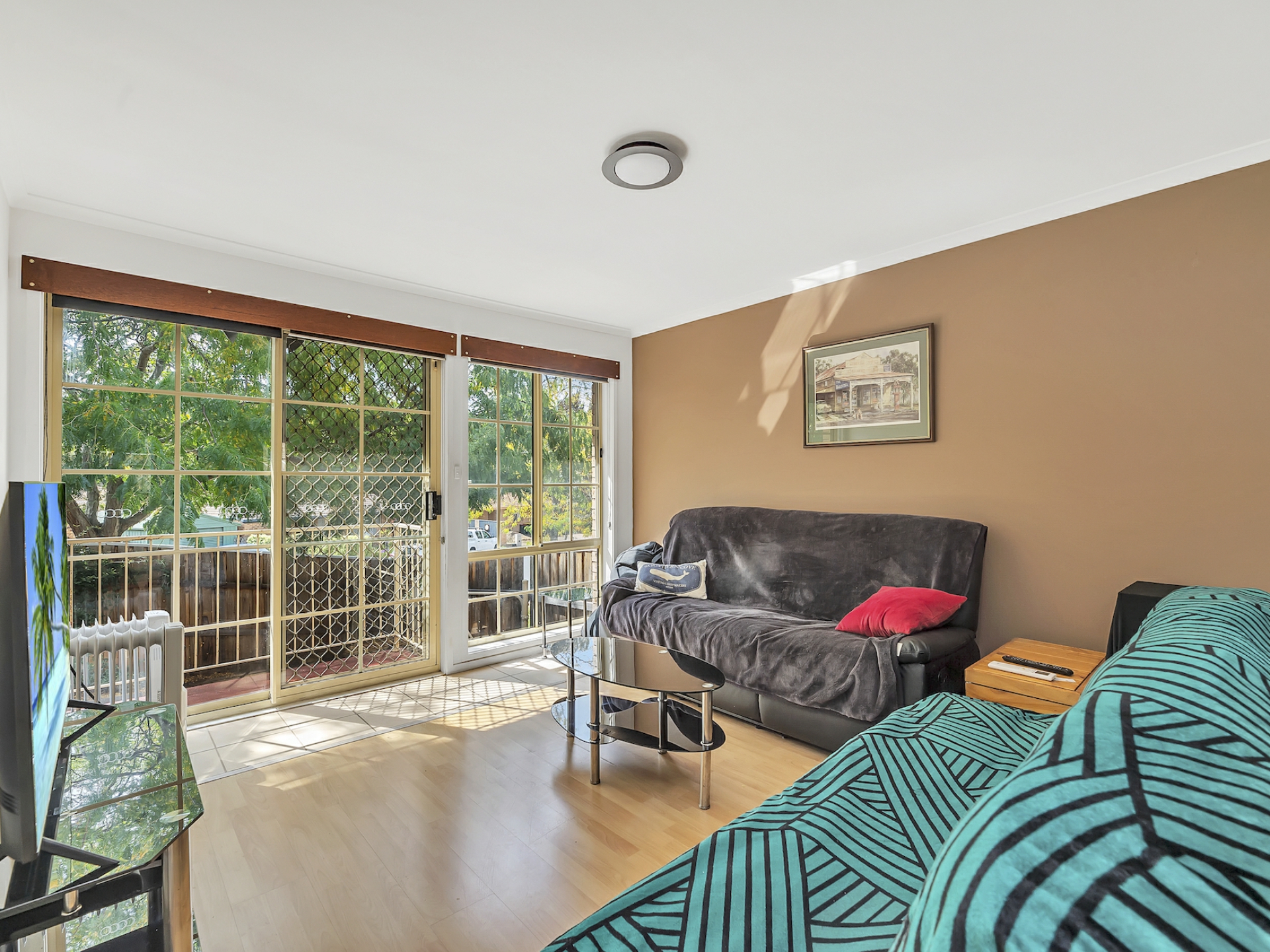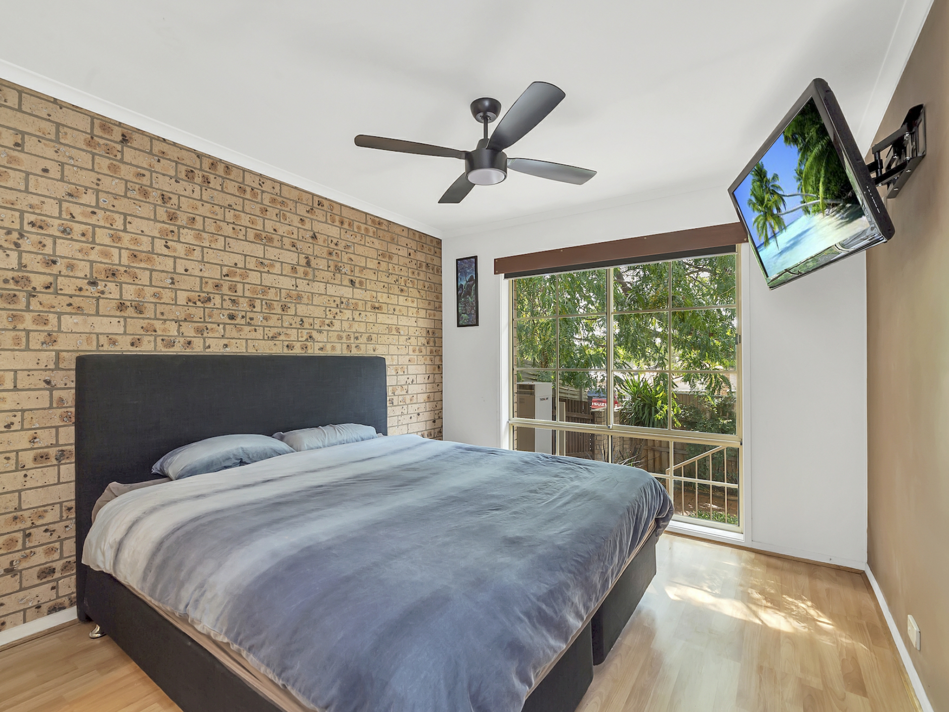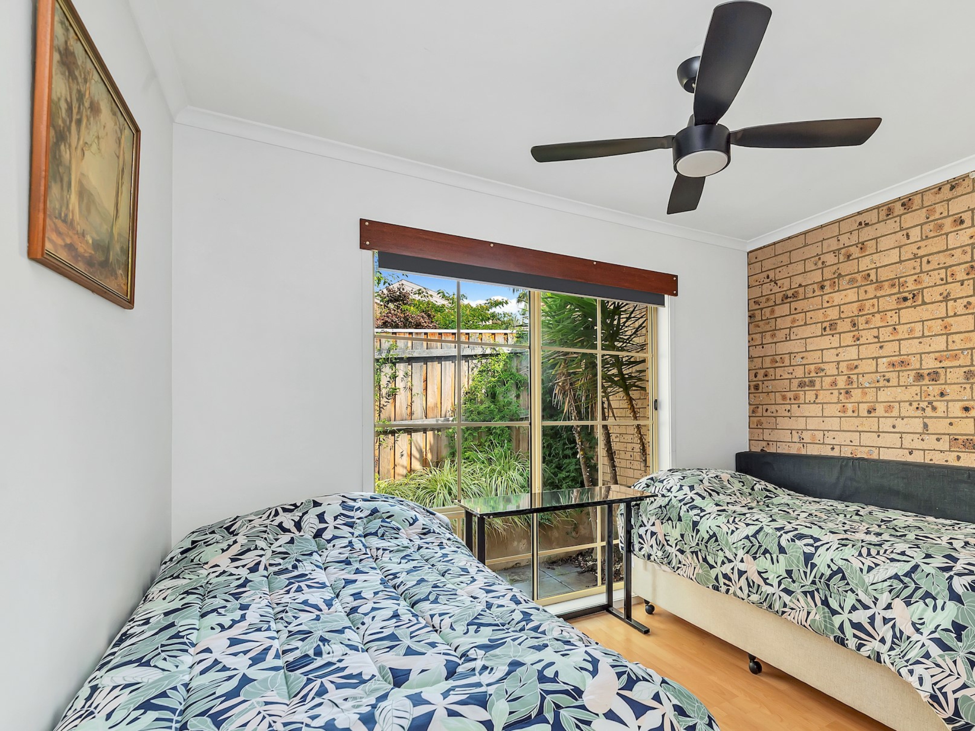 The spacious living room also has a ceiling fan and has ample space for a meals area as well as family room. The kitchen offers a main gas stove and a servery to the meals area with plenty of cupboard and bench space and is placed at the front of the home overlooking a lovely private courtyard. All the living areas have floating timber floors that provides ease of cleaning with a modern feel.