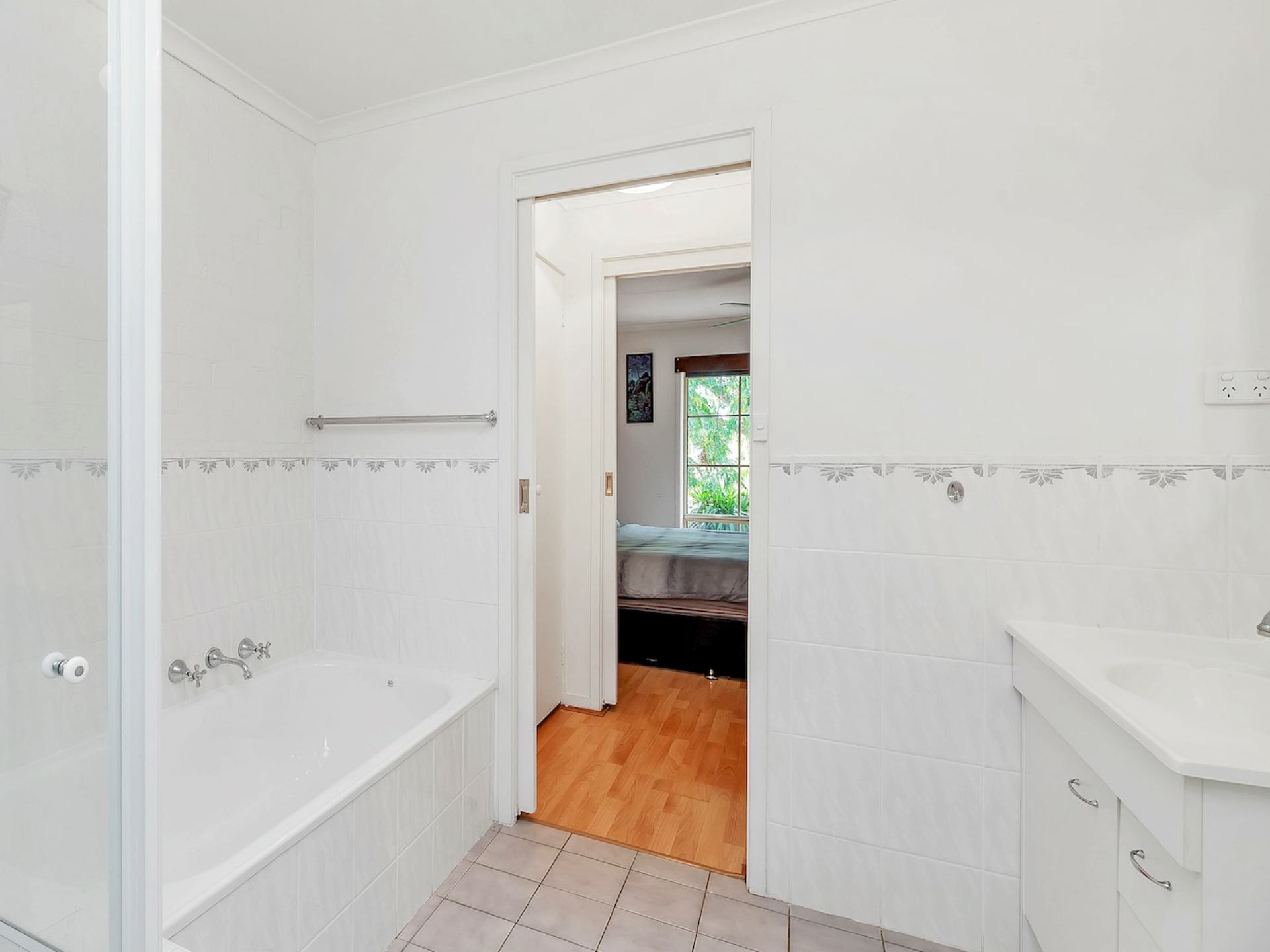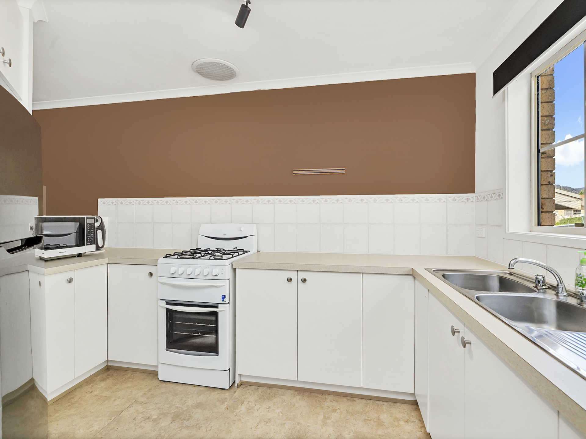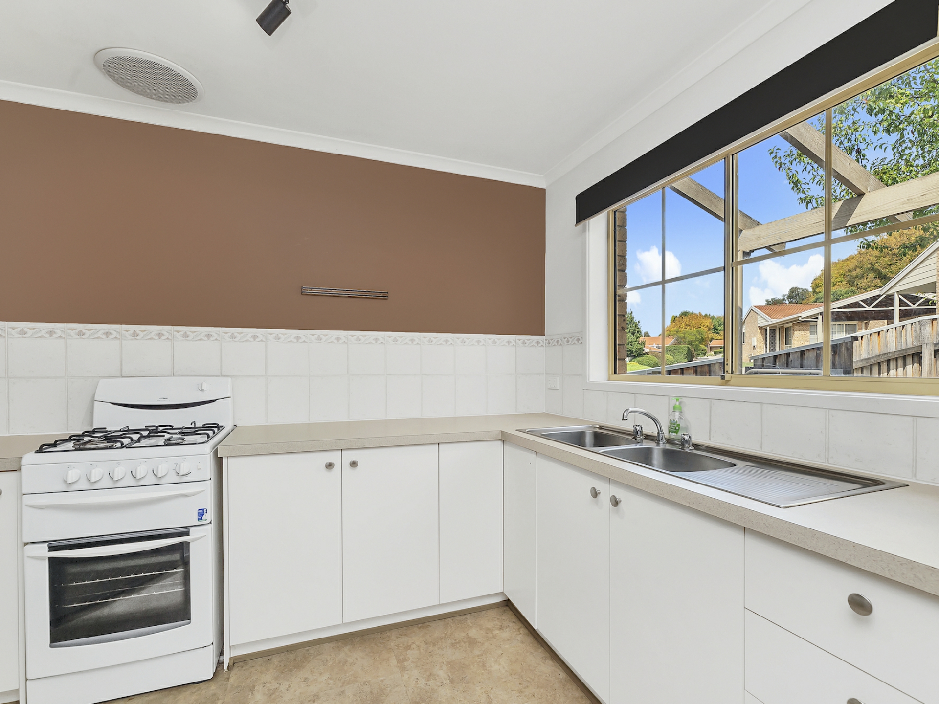 The spacious living room also has a ceiling fan and has ample space for a meals area as well as family room. The kitchen offers a main gas stove and a servery to the meals area with plenty of cupboard and bench space and is placed at the front of the home overlooking a lovely private courtyard. All the living areas have floating timber floors that provides ease of cleaning with a modern feel.
