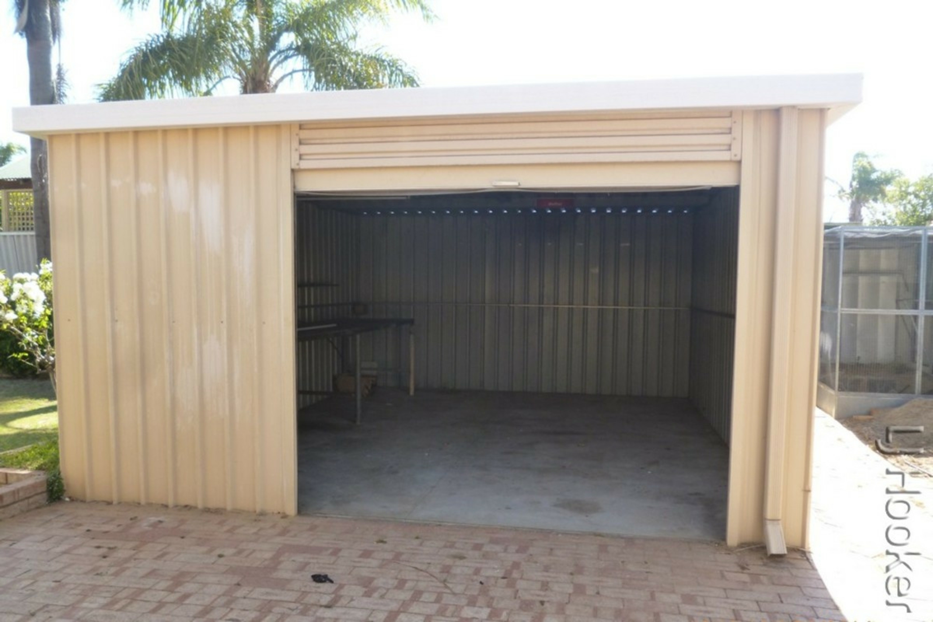 Double-length single carport with manual roller door