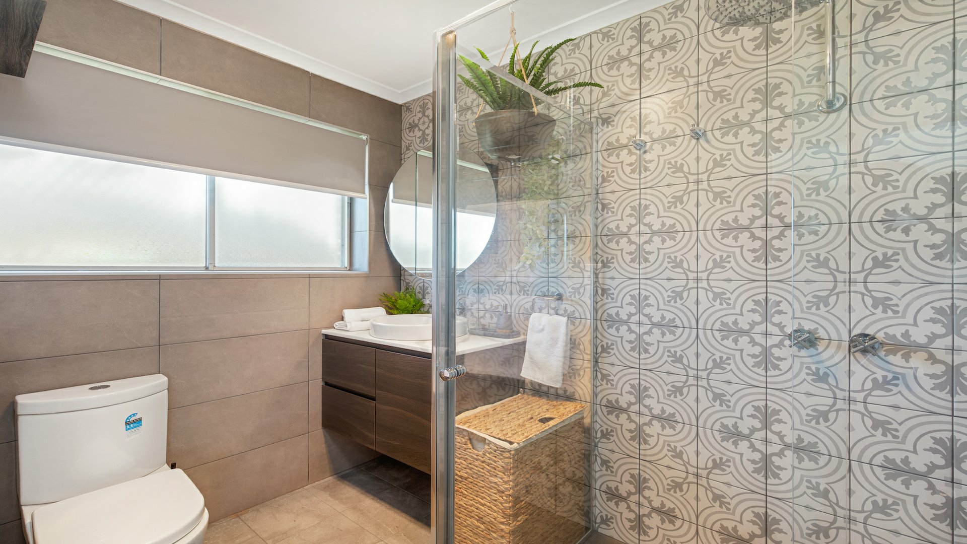 A sleek and stylish bathroom features contemporary fixtures, including a glass-enclosed shower adorned with elegant patterned tiles.
