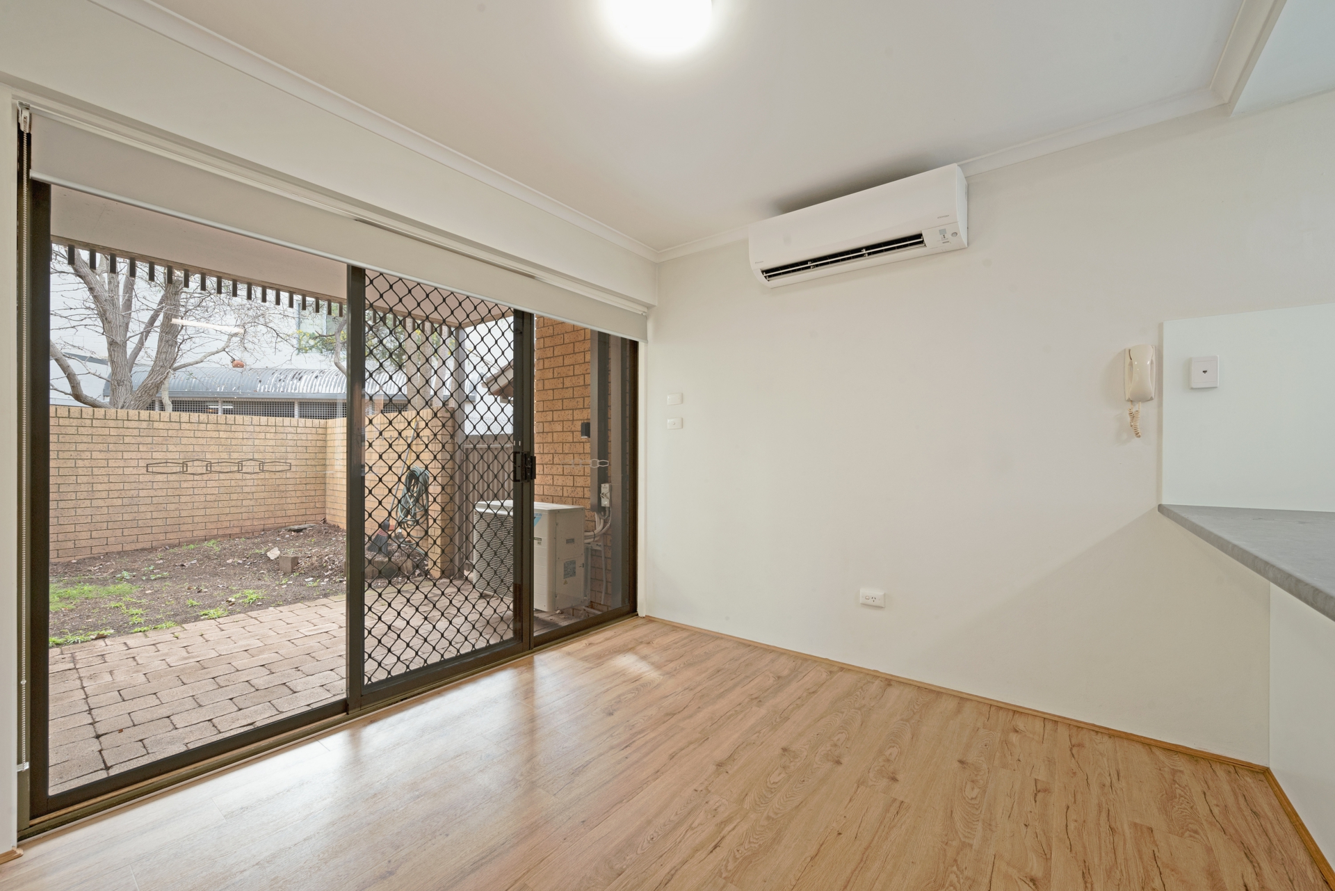 Open plan living and dining room with reverse cycle heating and cooling. Floating timber floors to living and kitchen, carpet to bedrooms.