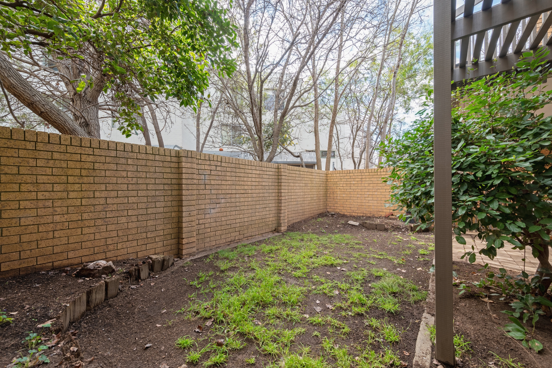 Private courtyard with established gardens and small paved area.