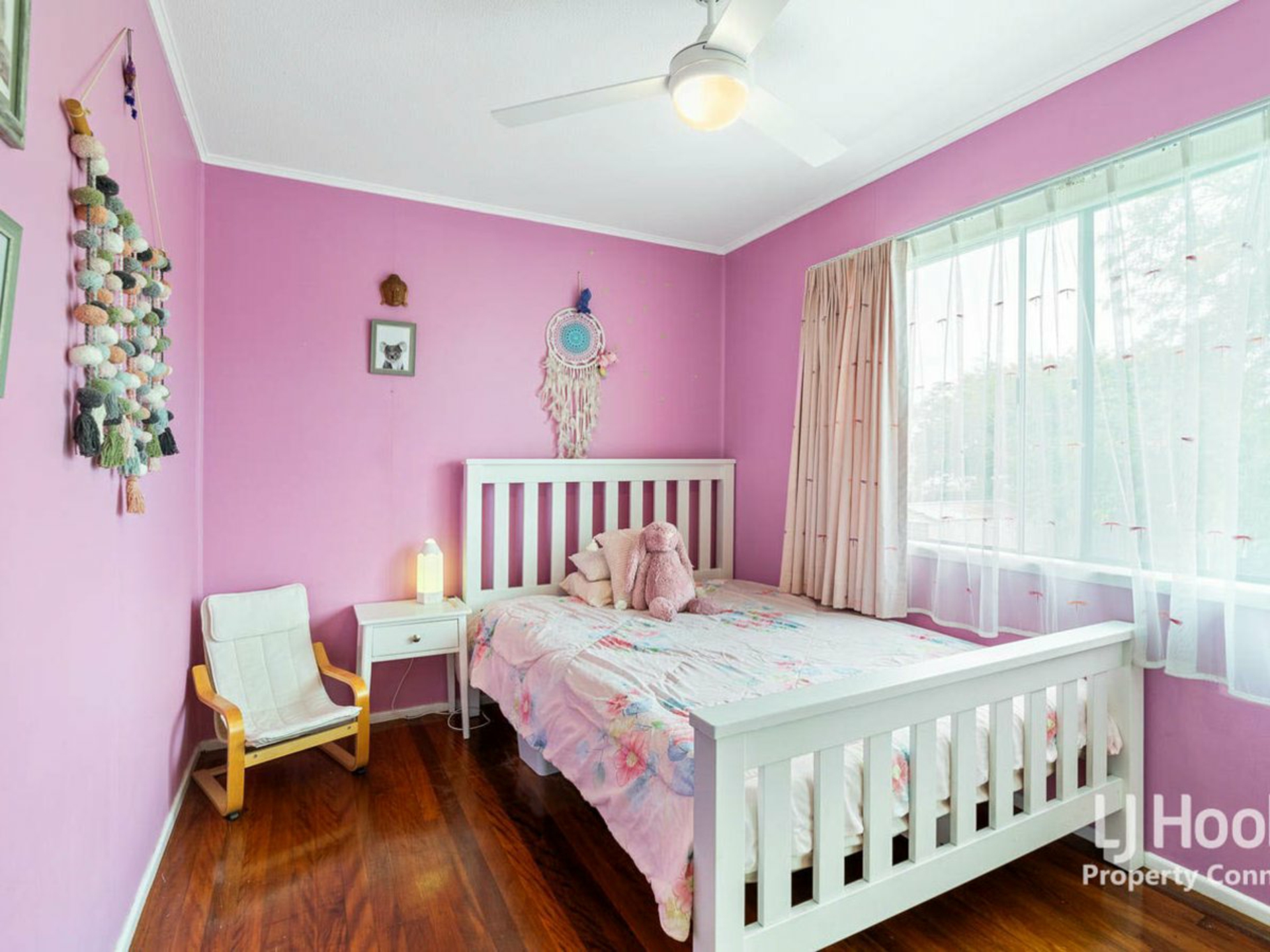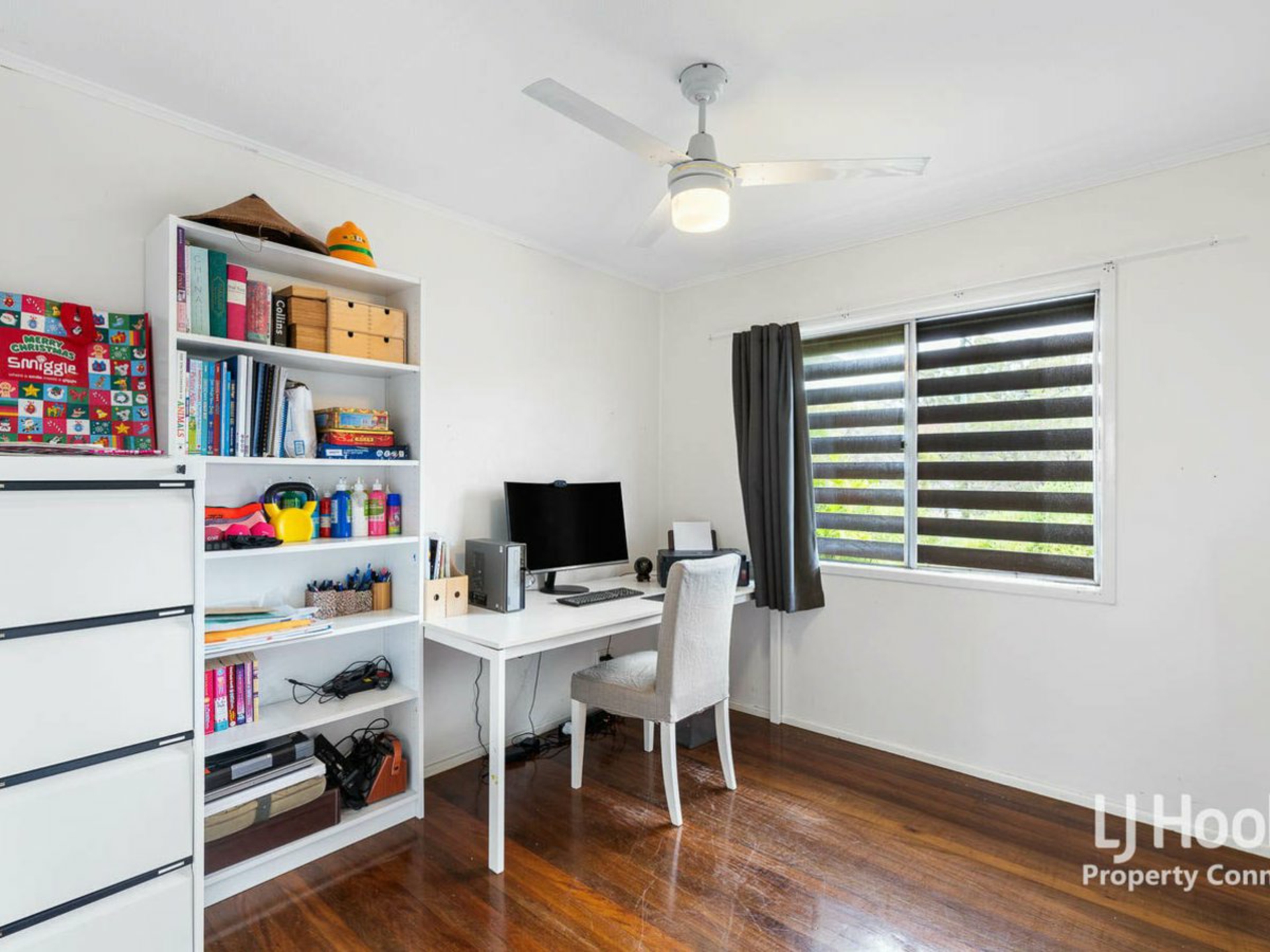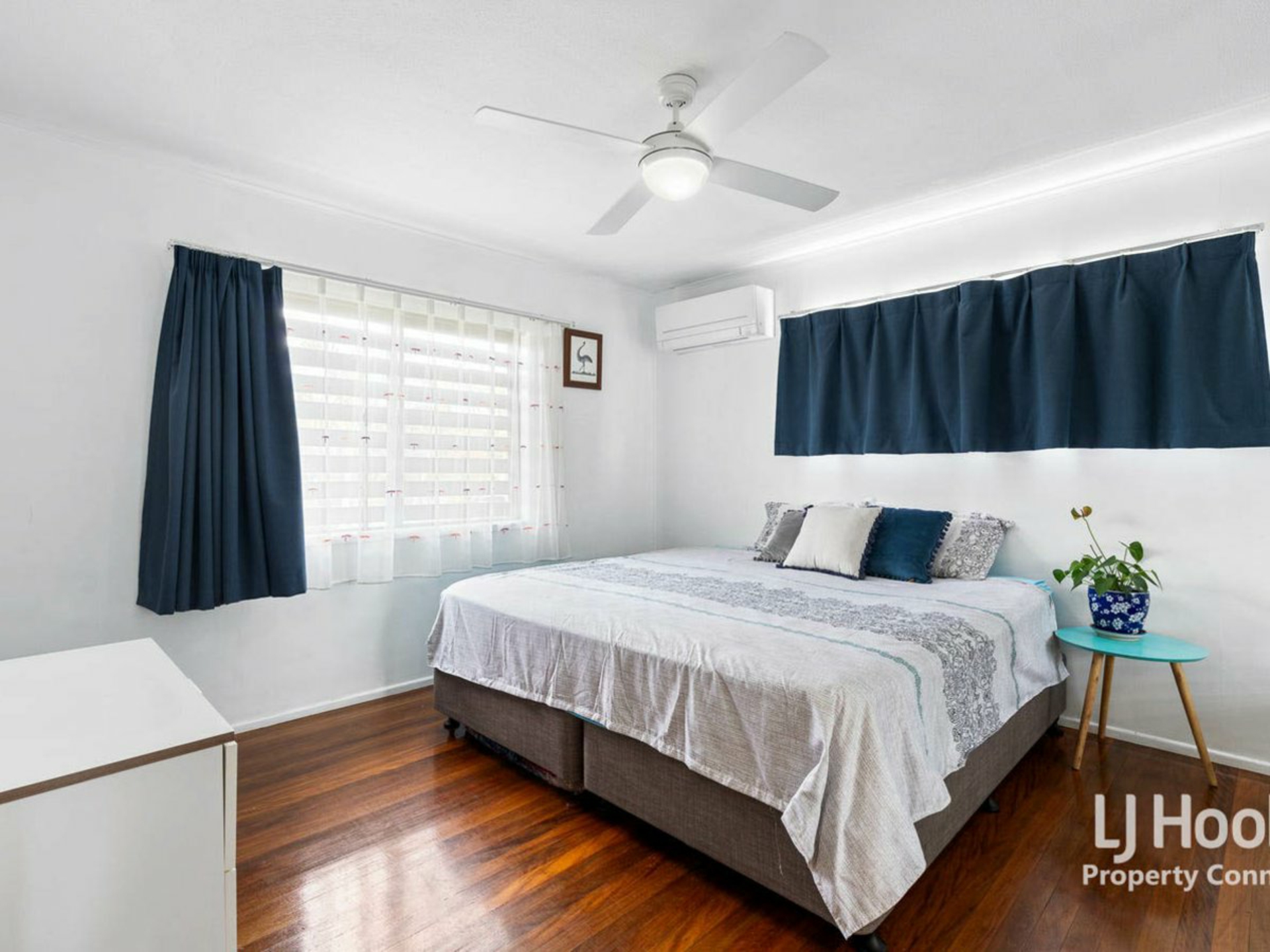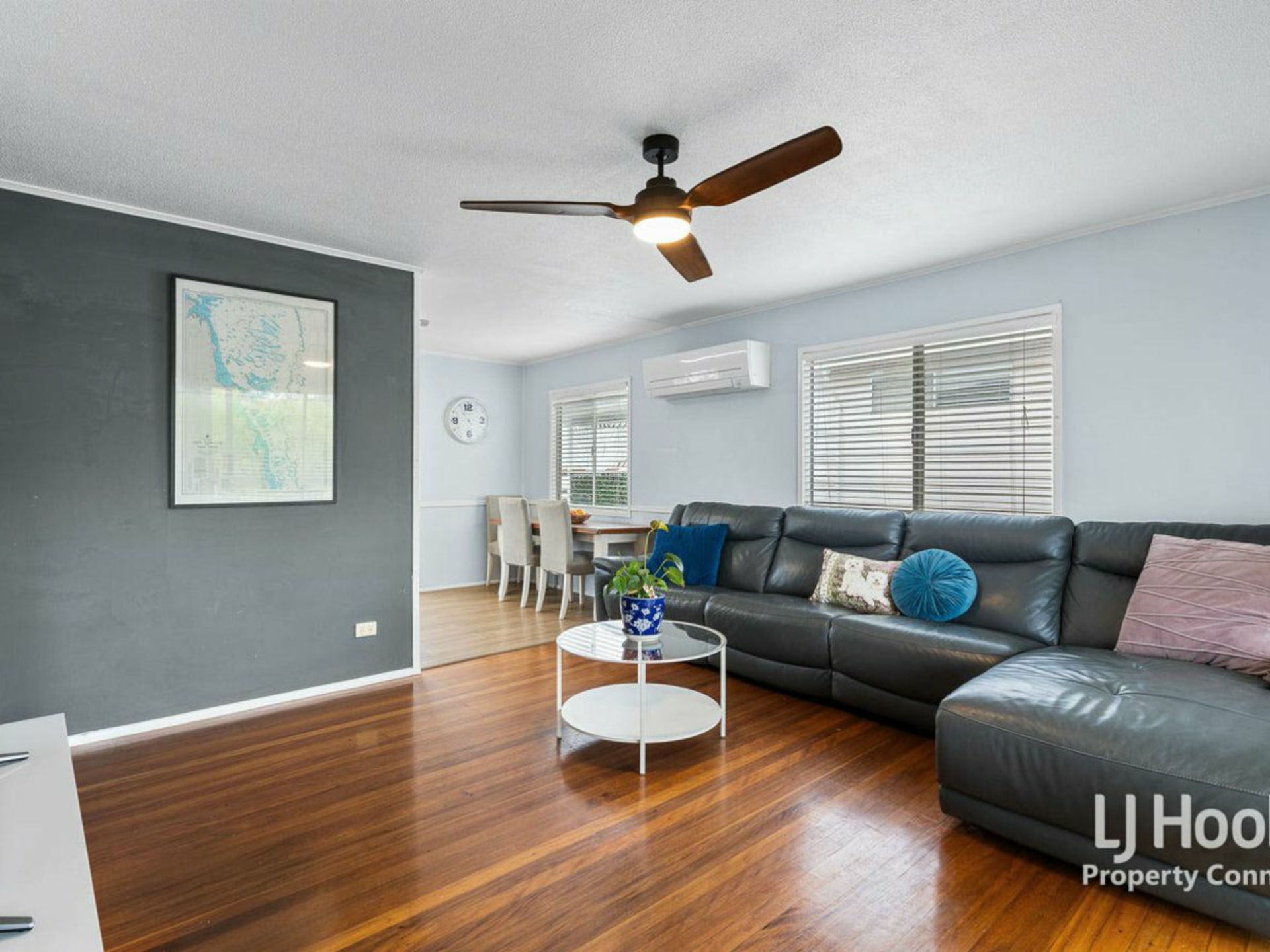 Timber floors upstairs throughout the air conditioned open plan living and dining areas and down the hall to the three good sized bedrooms.
