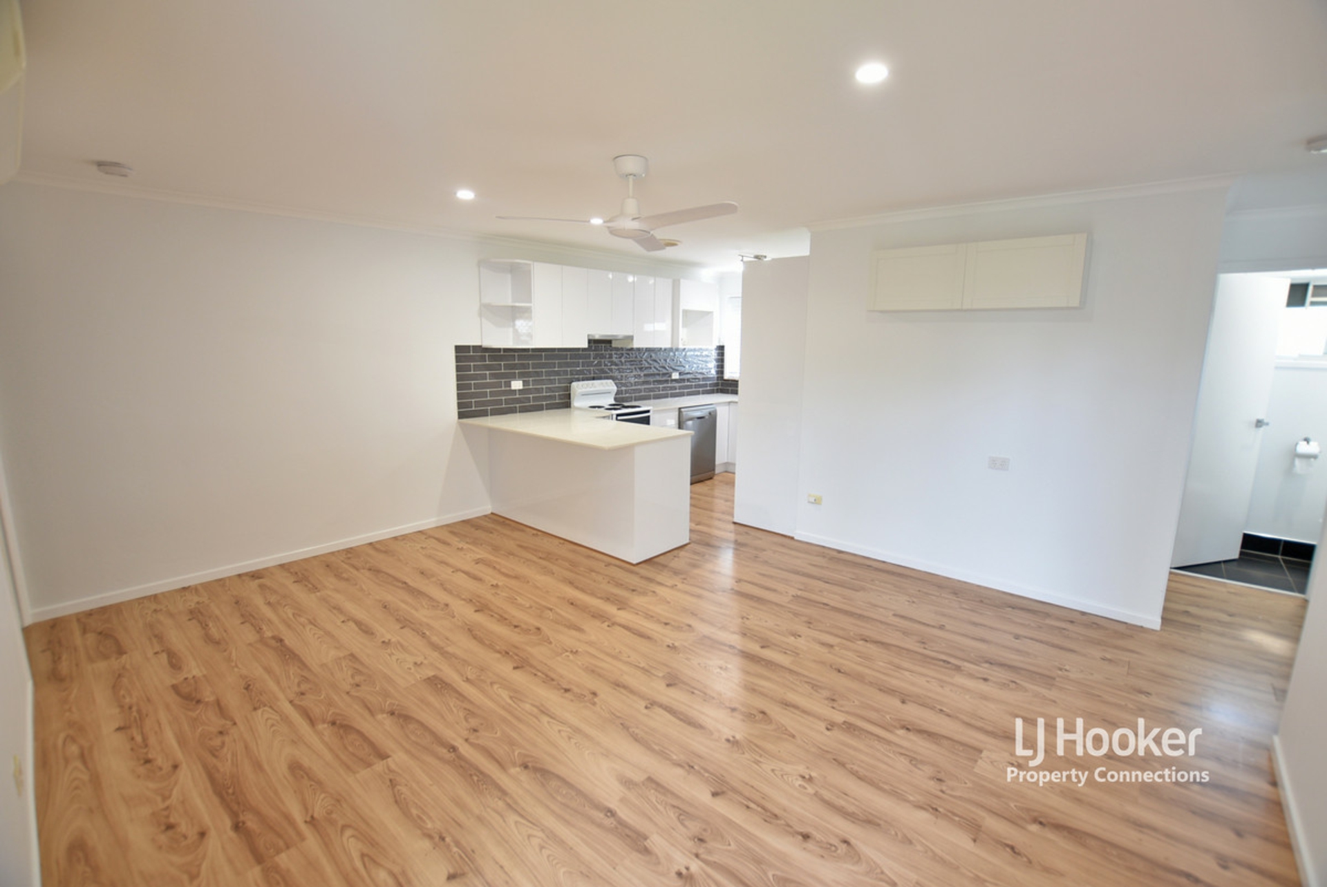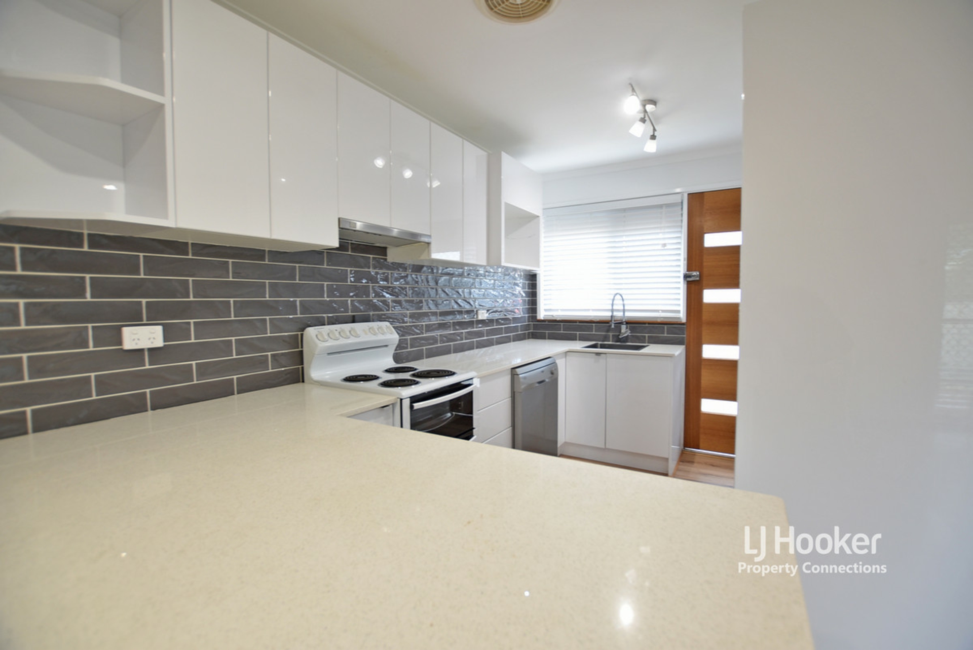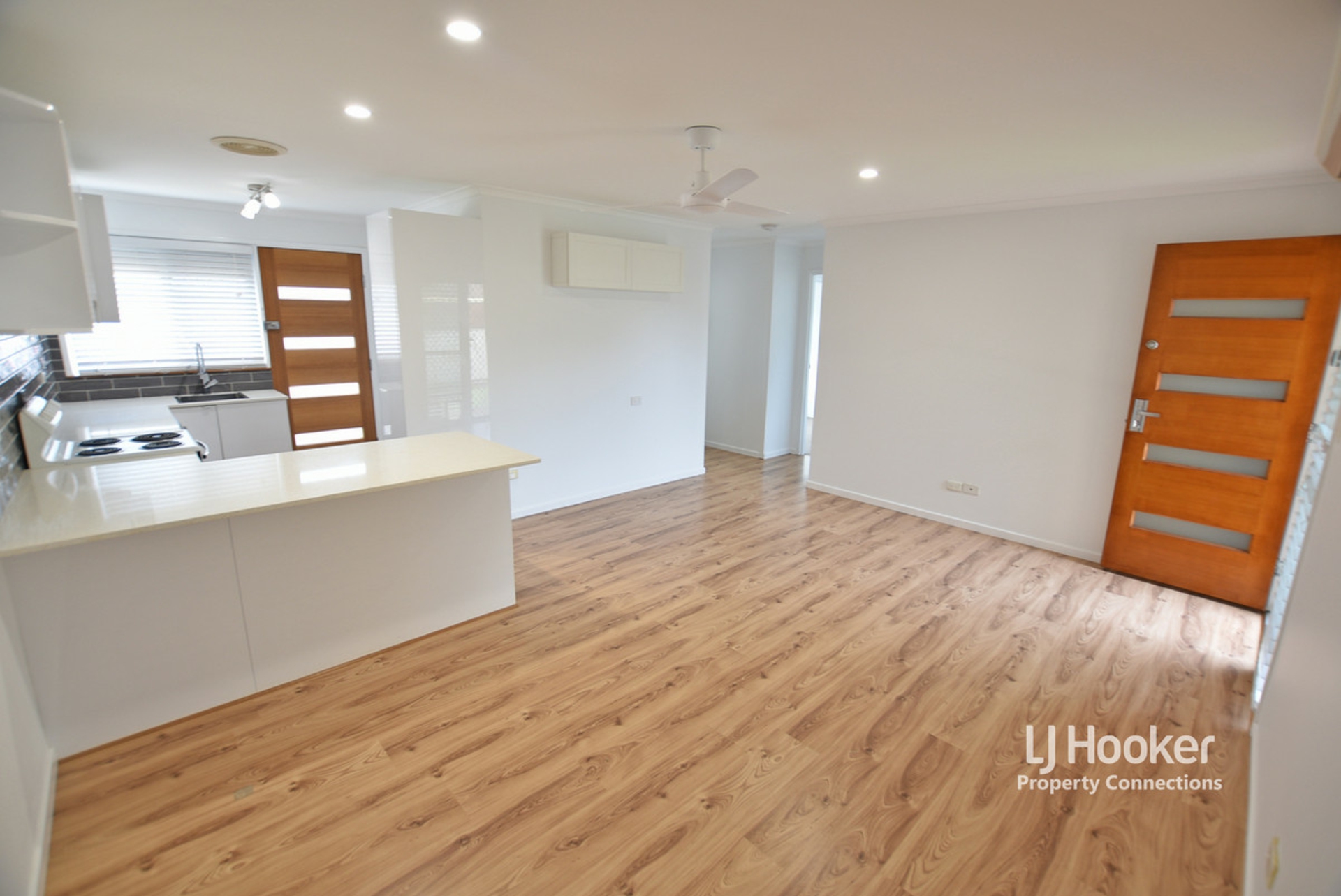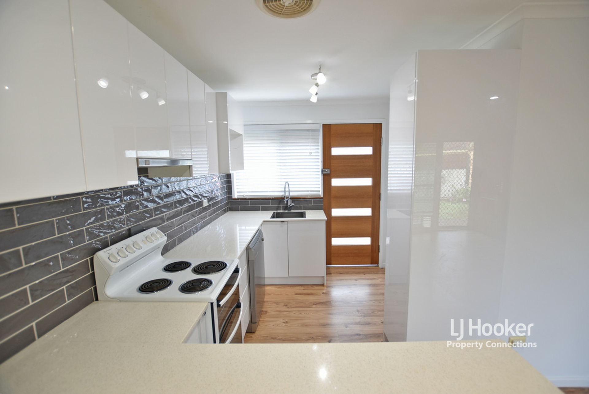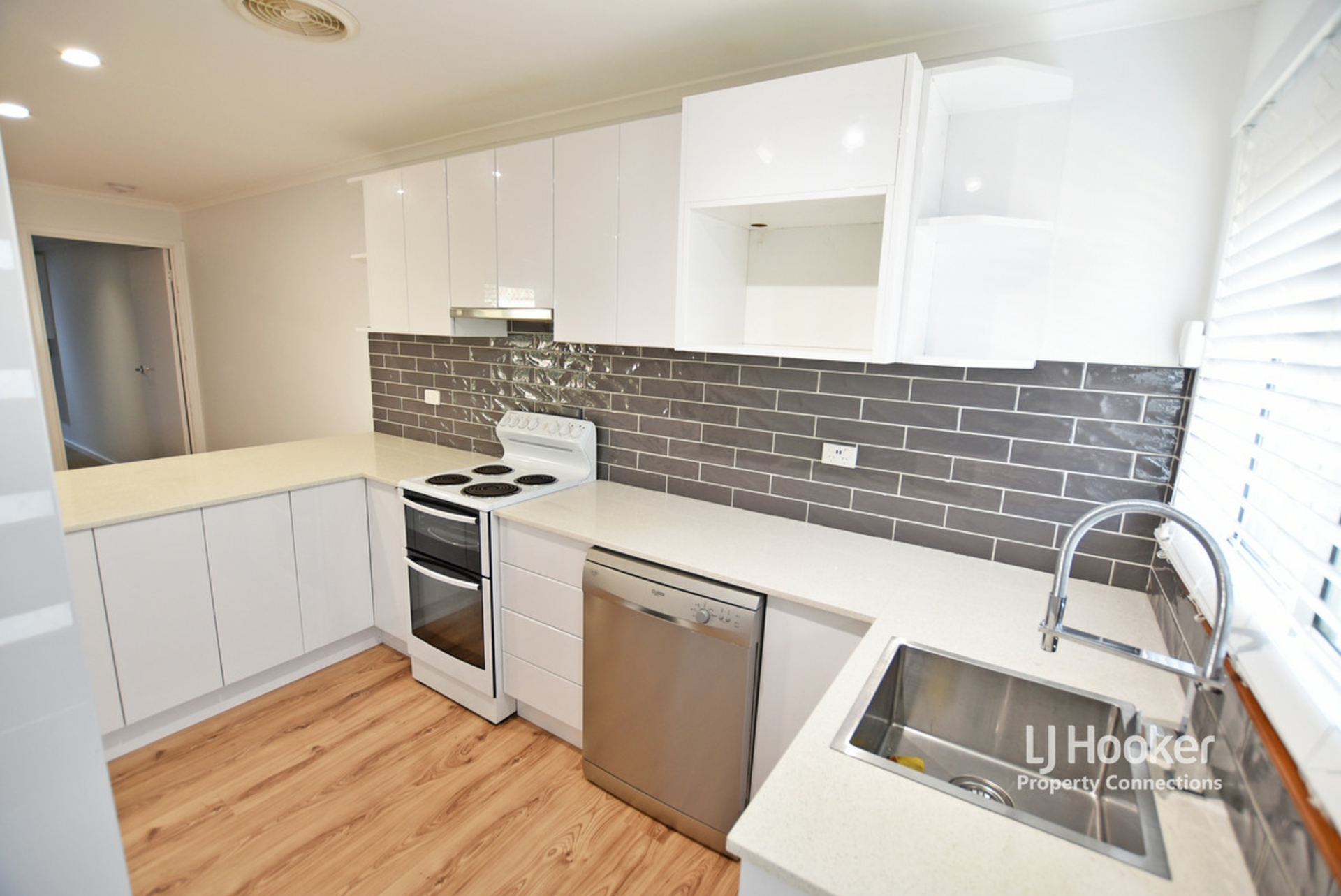 Timber look flooring through the living, dining and kitchen spaces. The kitchen has been replaced and features white gloss cabinet with push to close function, stone bench tops, dishwasher, electric cooking appliances, large pantry and a breakfast bar.