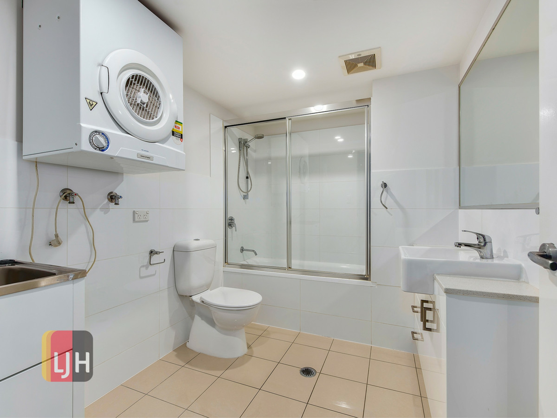 - Main bathroom with shower over bath and laundry area with dryer