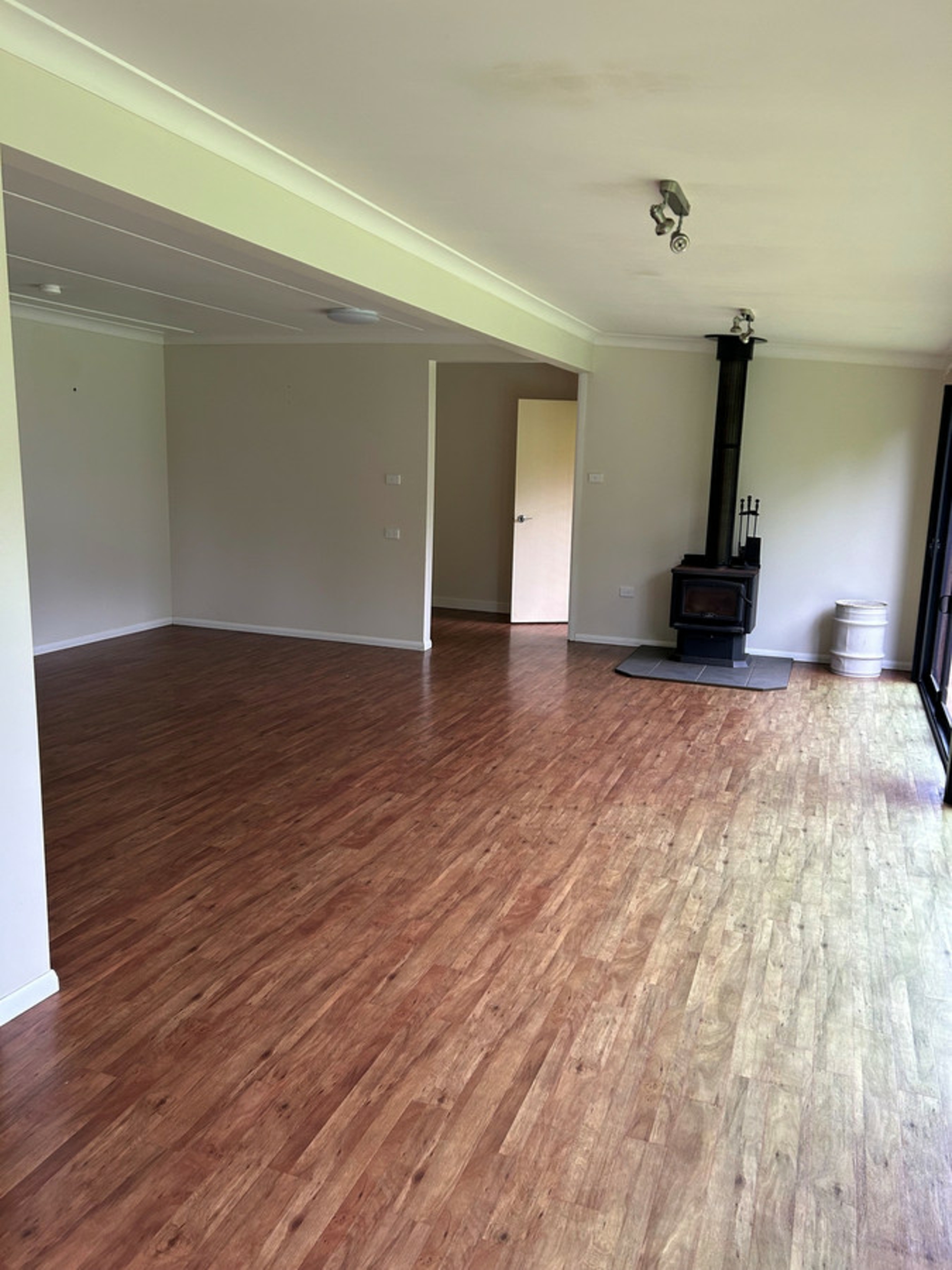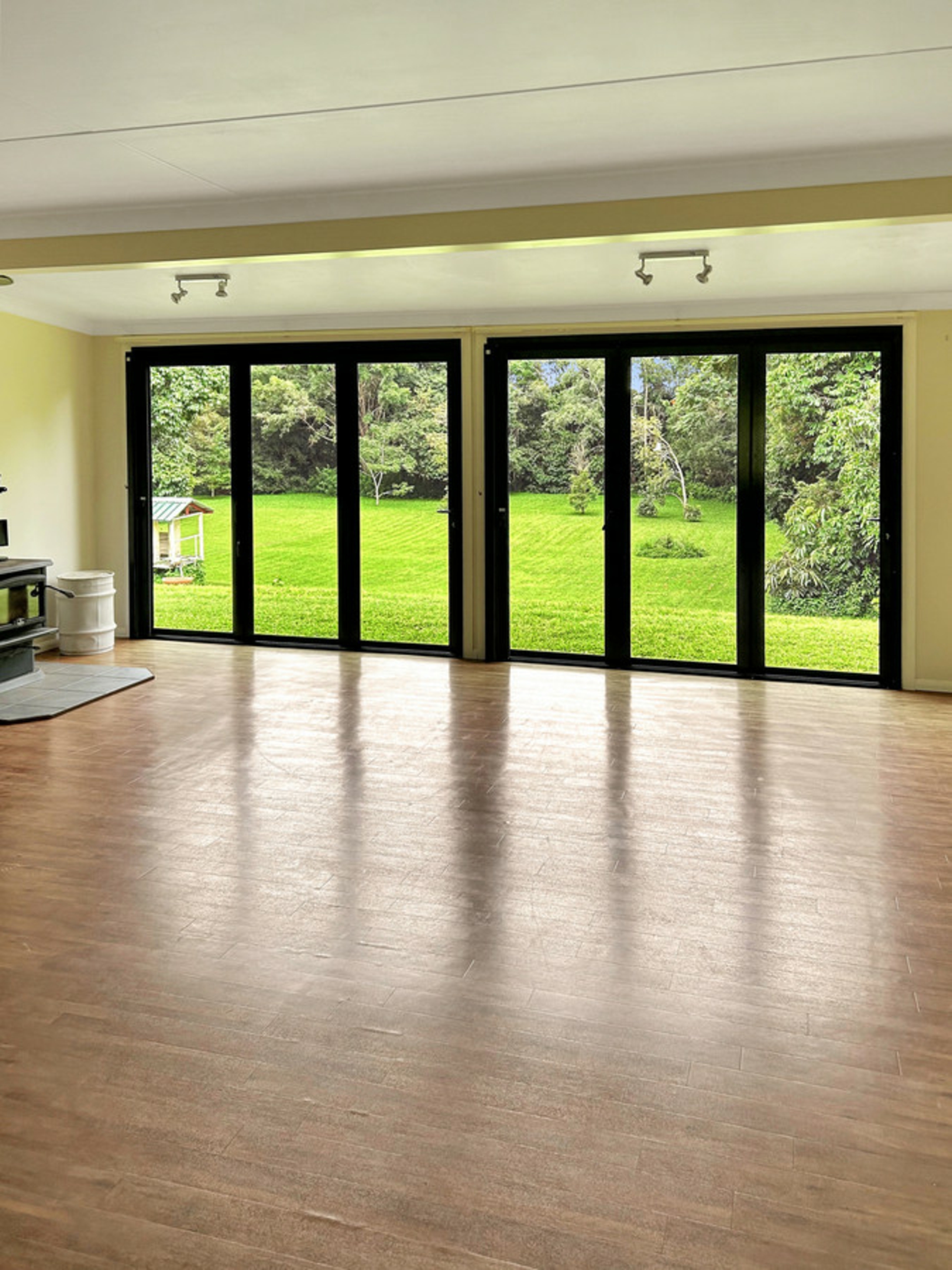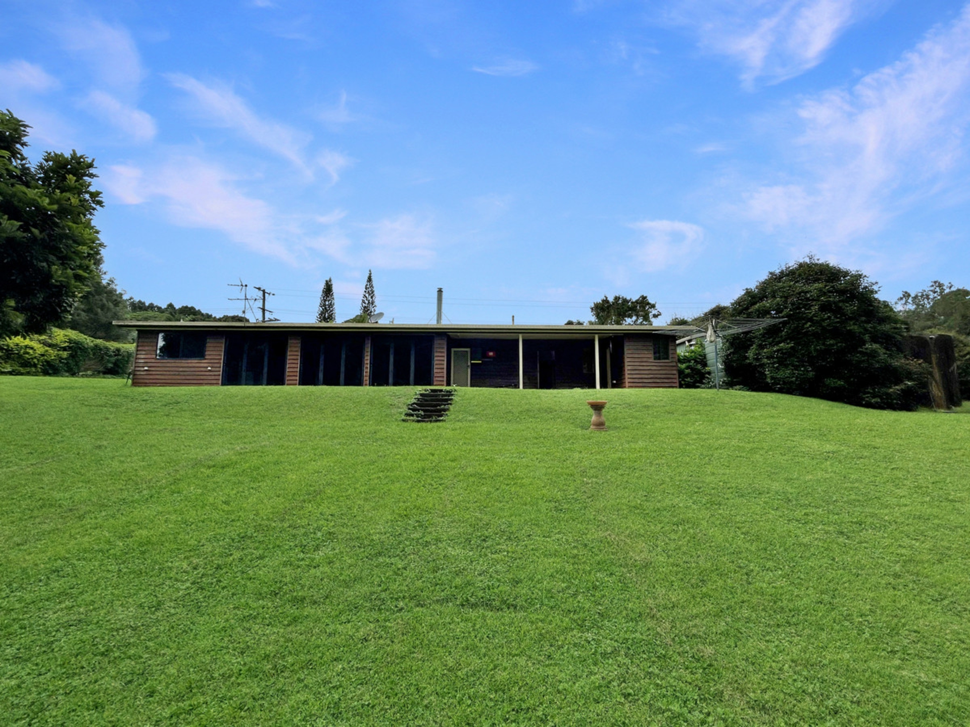The living spaces include a spacious kitchen/dining area and a lounge featuring a wood fire, perfect for cozy evenings. Concertina doors and flyscreens lead from the dining and lounge areas onto a patio, offering access to the beautiful back garden. The property offers access to the North Johnston River, providing opportunities for afternoon swims, fishing, and even platypus viewing, adding a unique and scenic aspect to the home's surroundings.