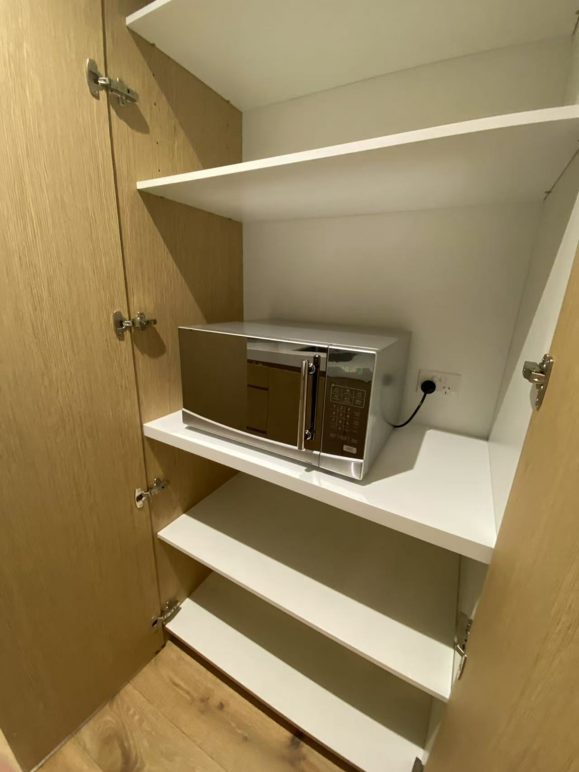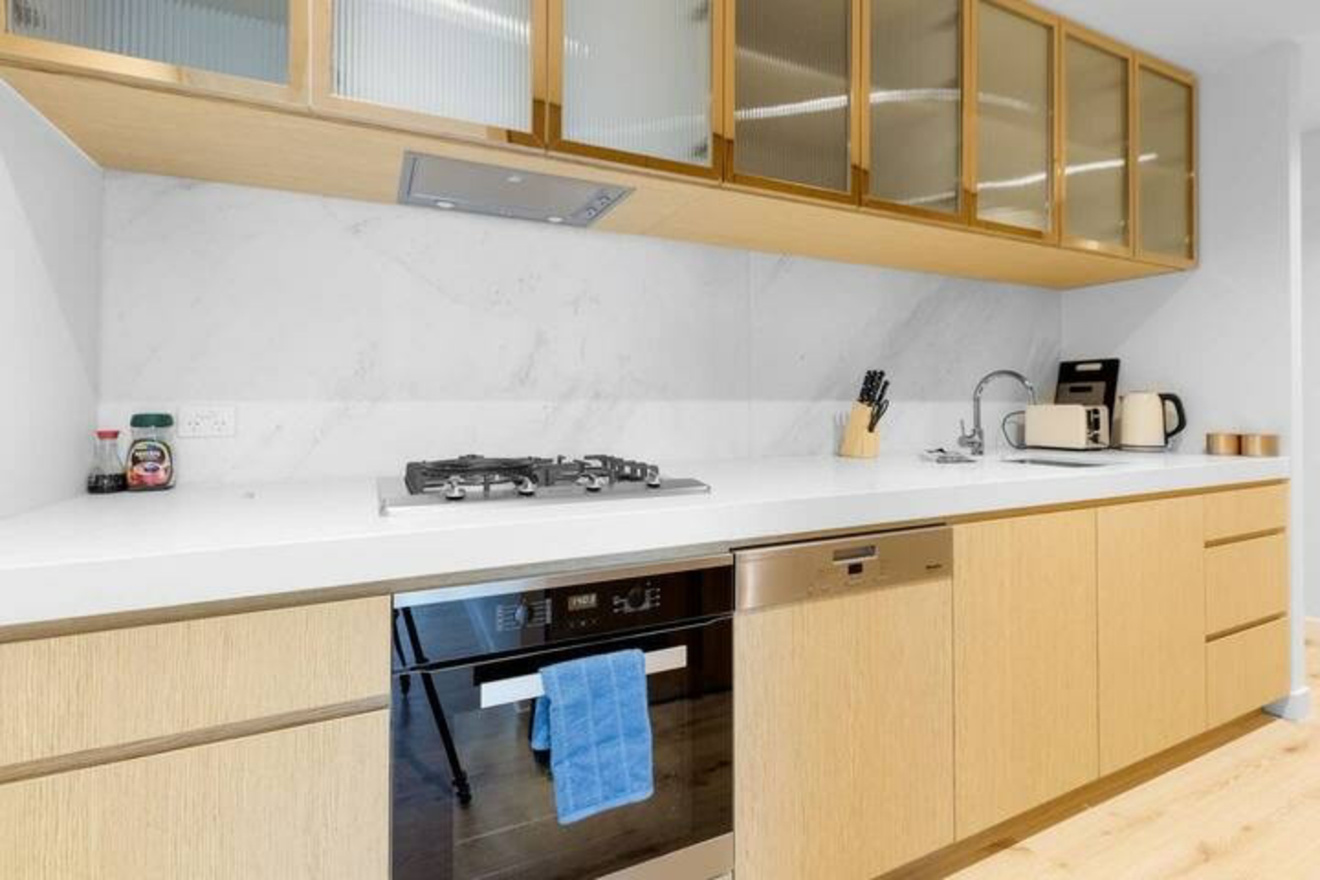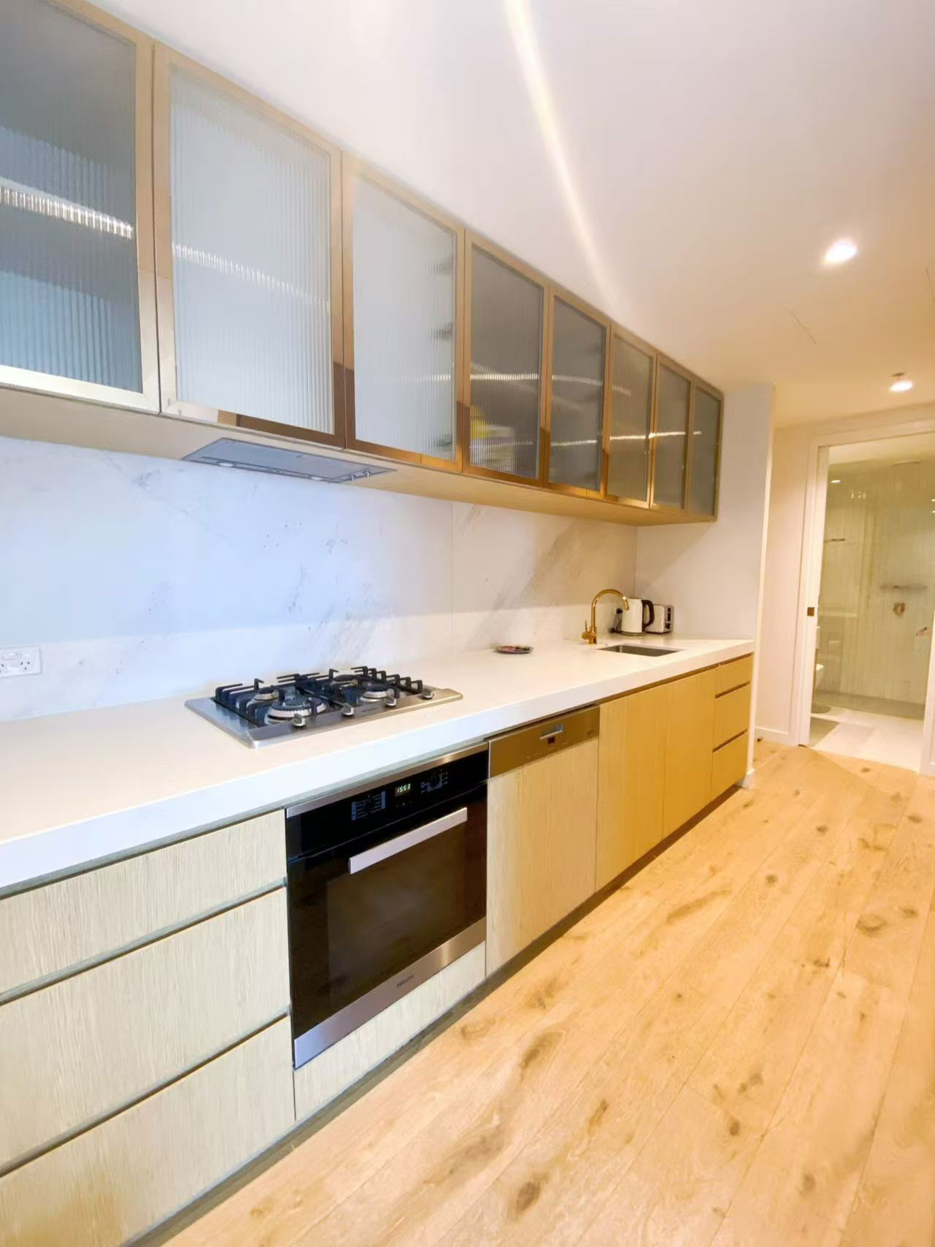 Enter into an expansive open-plan living and dining area adorned with exquisite timber flooring, where floor-to-ceiling windows invite an abundance of natural light to dance across the space, creating an atmosphere of warmth and serenity. The gourmet kitchen is a culinary masterpiece, featuring a stunning gas stove and ample storage space. Retreat to the tranquility of two generously sized bedrooms, each boasting built-in wardrobes and centralized AC with two separate control panels for personalized comfort and convenience.