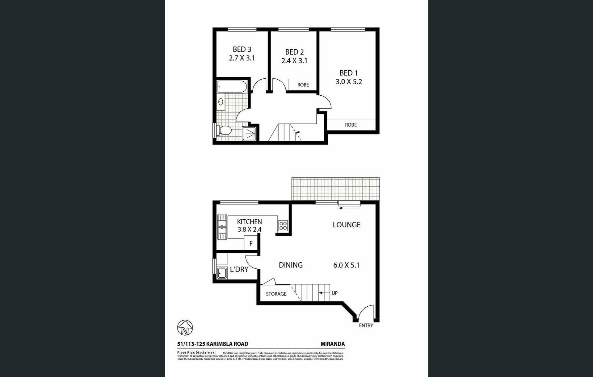 This split level bright North facing three bedroom apartment is located only minutes walk from Miranda Westfields, Miranda train station and Schools and features: