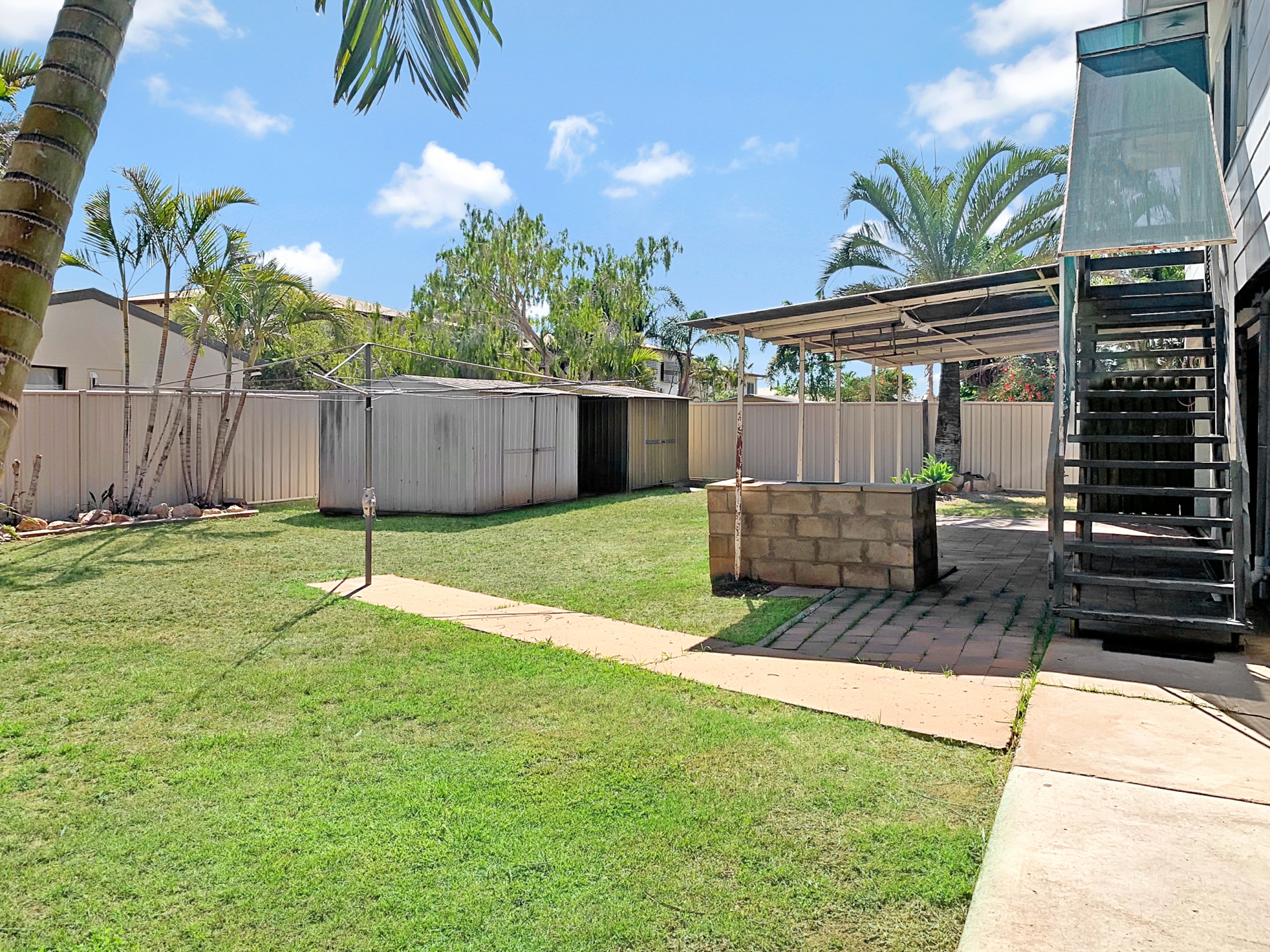 Large fenced yard with garden shed
