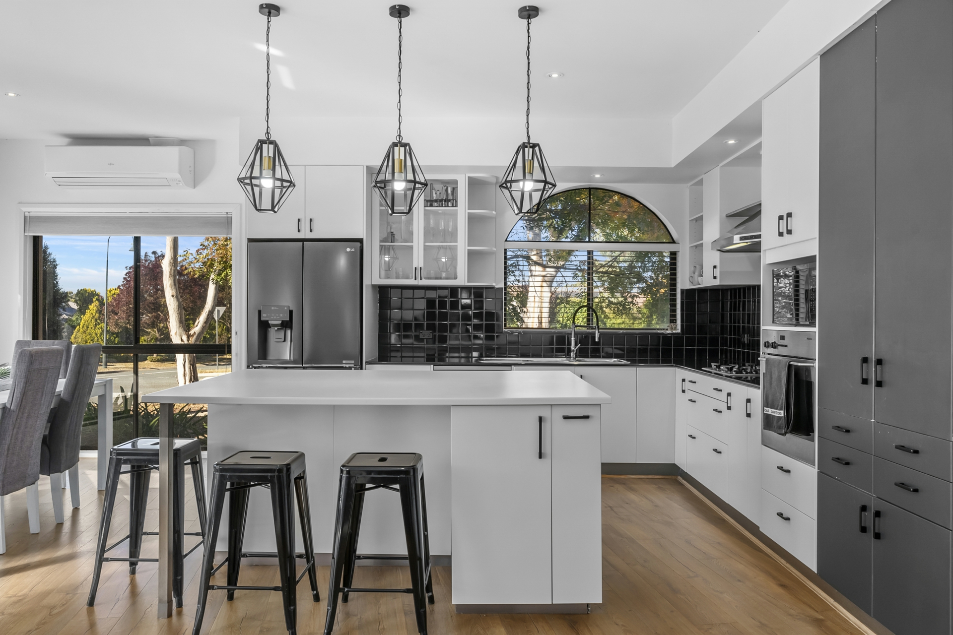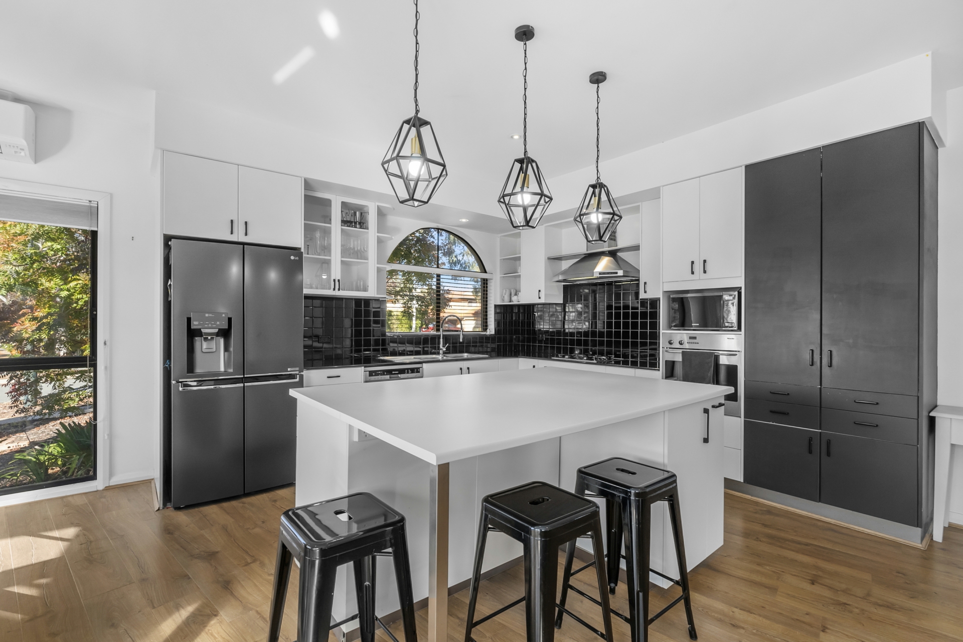 - Impressive kitchen with island, stainless steel appliances, dishwasher and stone benchtops