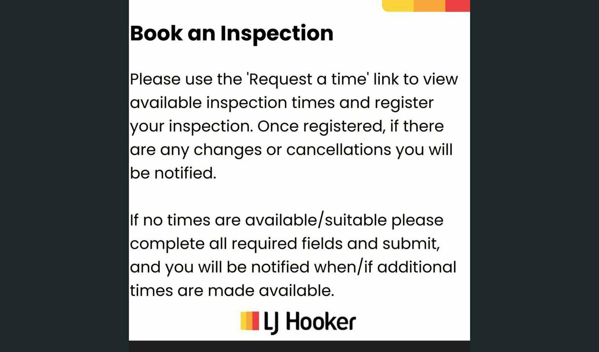 Registration is required to inspect the property. Inspection times may change or be cancelled at short notice; however, registered attendees will be notified via SMS or email. Photo ID is required at all inspections. Photography and video recording are strictly prohibited.