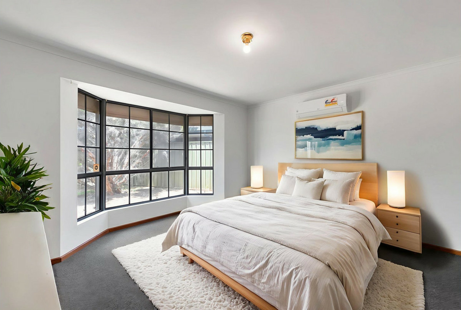 - A charming bay window with an automatic window shutter for privacy and light control.
