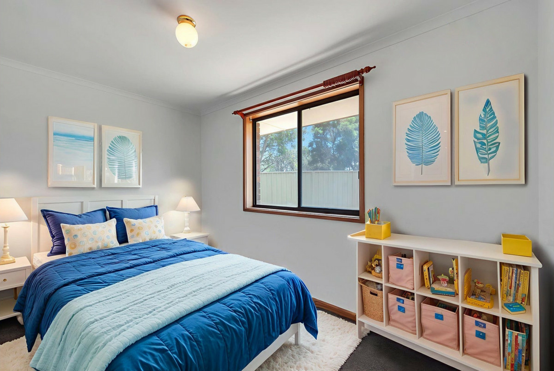 The secondary wing includes three additional well-proportioned bedrooms (one being double-sized!), all featuring soft carpeting. The 3-way main bathroom is a masterclass in practicality, allowing multiple people to get ready at once with a separate toilet and a dedicated bath/shower area.