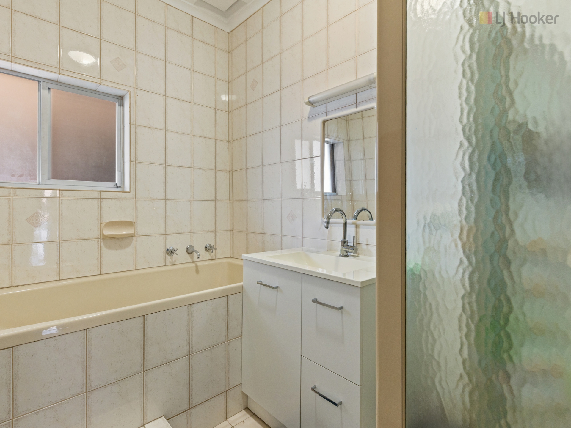 • Fully tiled family bathroom with bath, wide vanity and corner shower