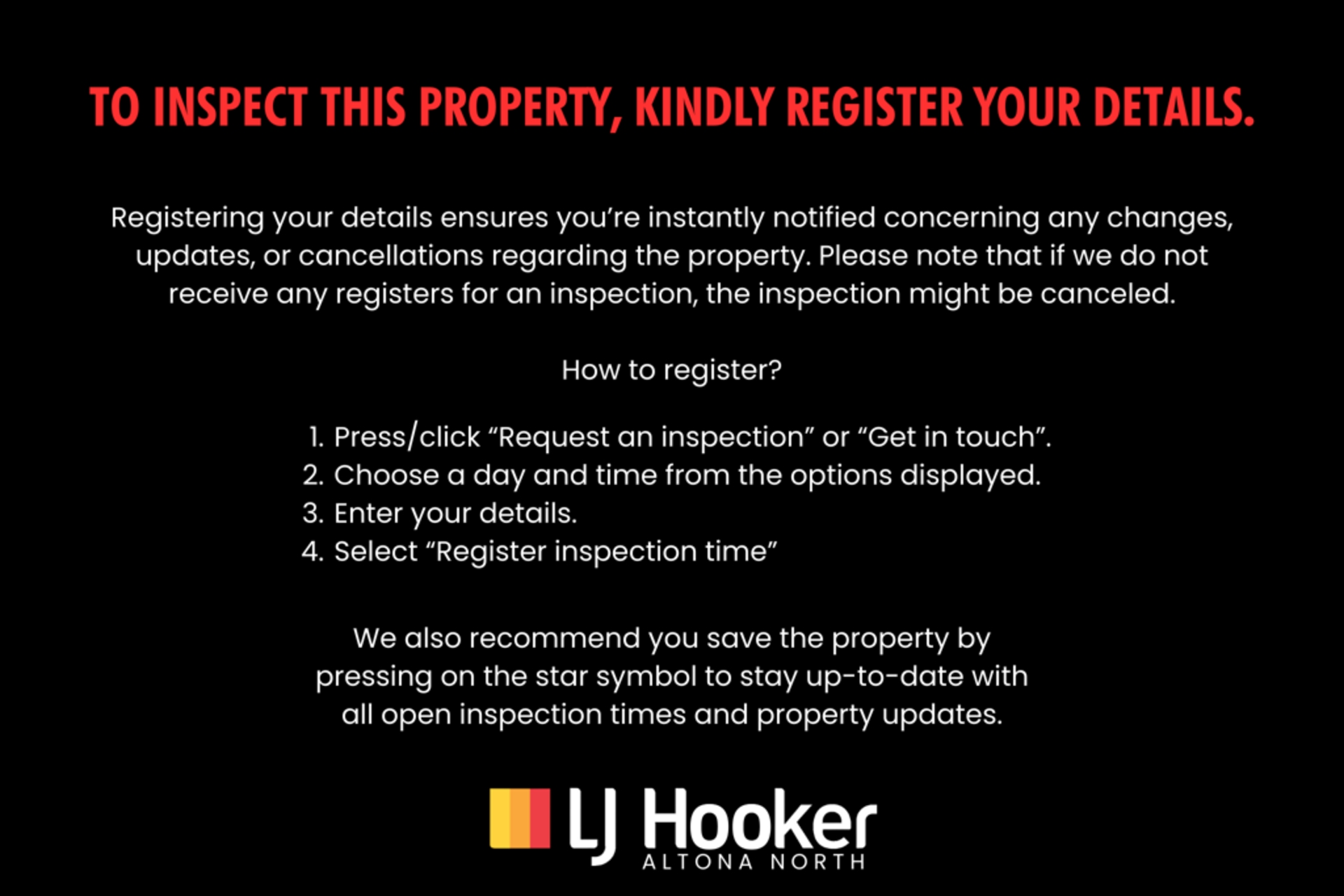 We encourage you to get your application ready for submission. LJ Hooker Altona North adheres to a policy requiring either yourself or an authorised representative to personally view the property before application approval. We make an effort to regularly schedule open inspections for all available properties each week. You must register to receive information about the viewing times. In cases where no inspection is currently scheduled, the property may be pending applications, and you will be notified if an open time becomes available.