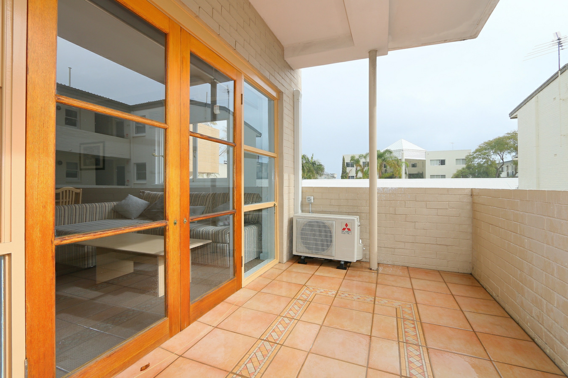 The living area is open plan, comprising of the kitchen, a dining area, and the living room all serviced by a split system air conditioner. The neutrally decorated kitchen has polished floorboards, plenty of cupboard space and a functional breakfast bar area that overlooks the living space. The living room opens out through charming French doors to your private balcony - undercover and partially enclosed; this space is perfect for alfresco dining or just enjoying a peaceful morning coffee.