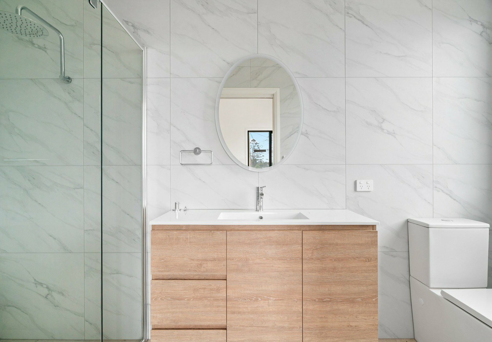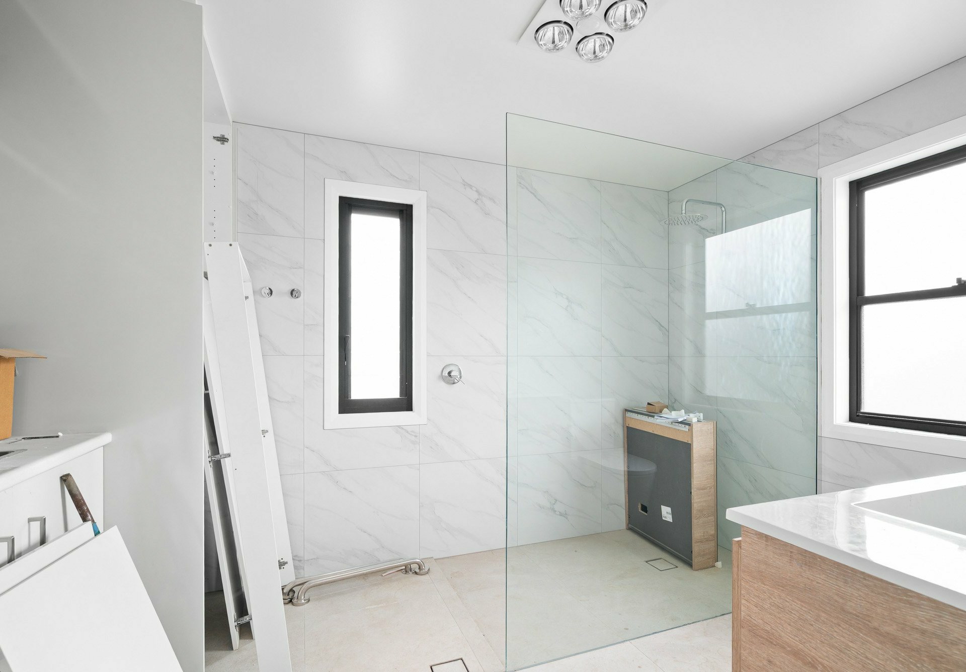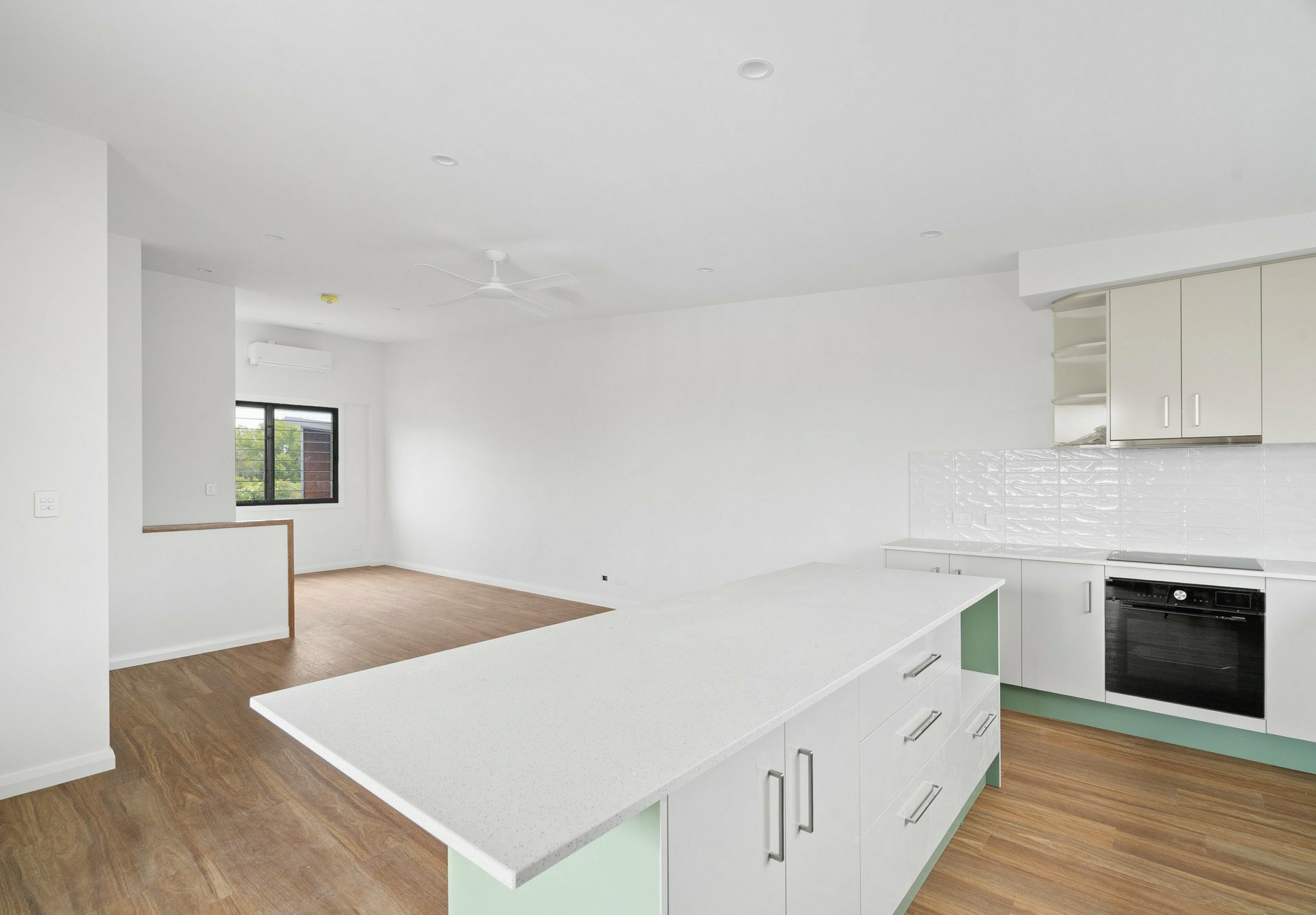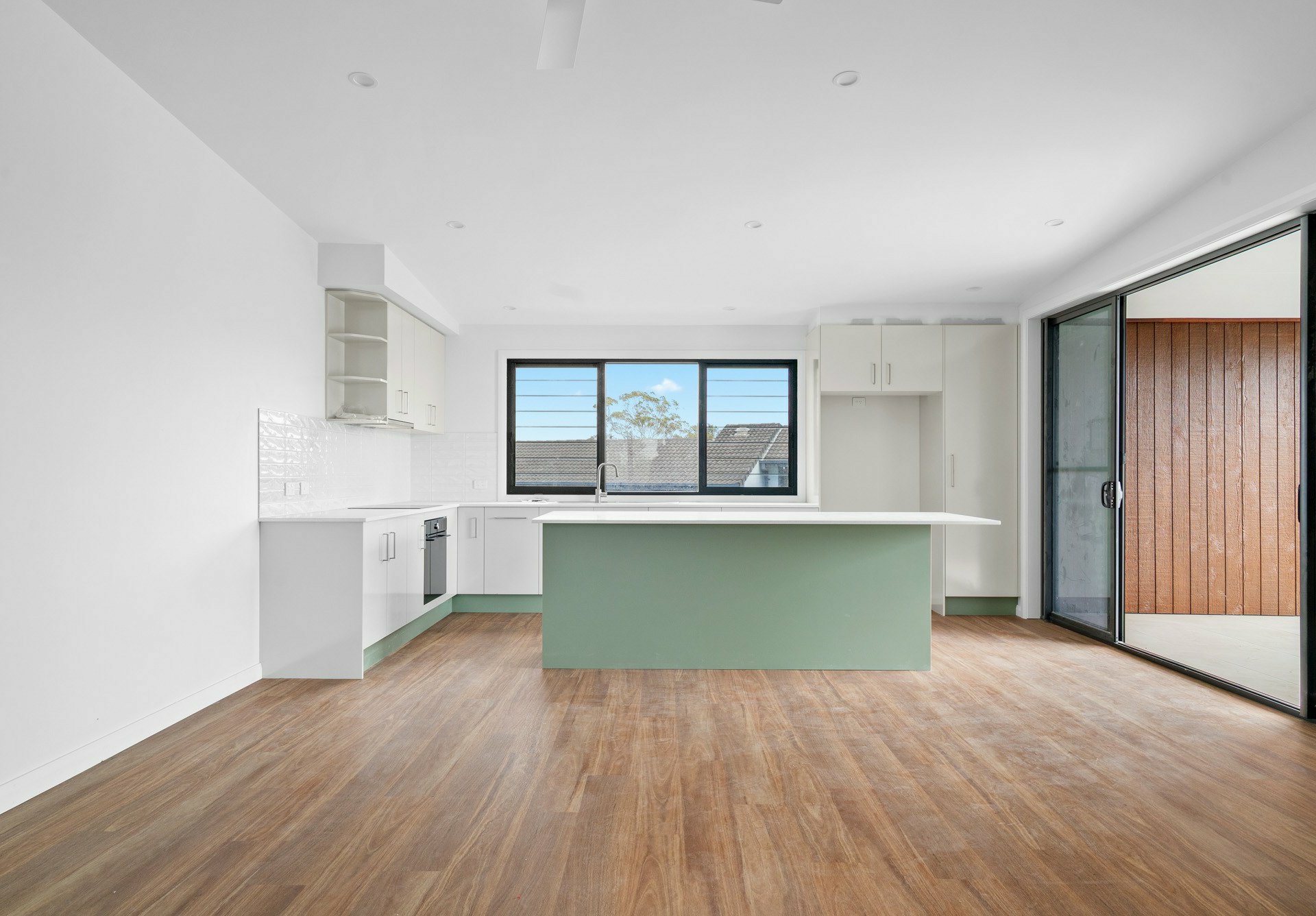 The kitchen is being finished with quality in mind, featuring an induction cooktop, electric oven, dishwasher, and European appliances that deliver sleek performance and a clean modern look. Roller blinds complete the finish, offering privacy and light control in every room.