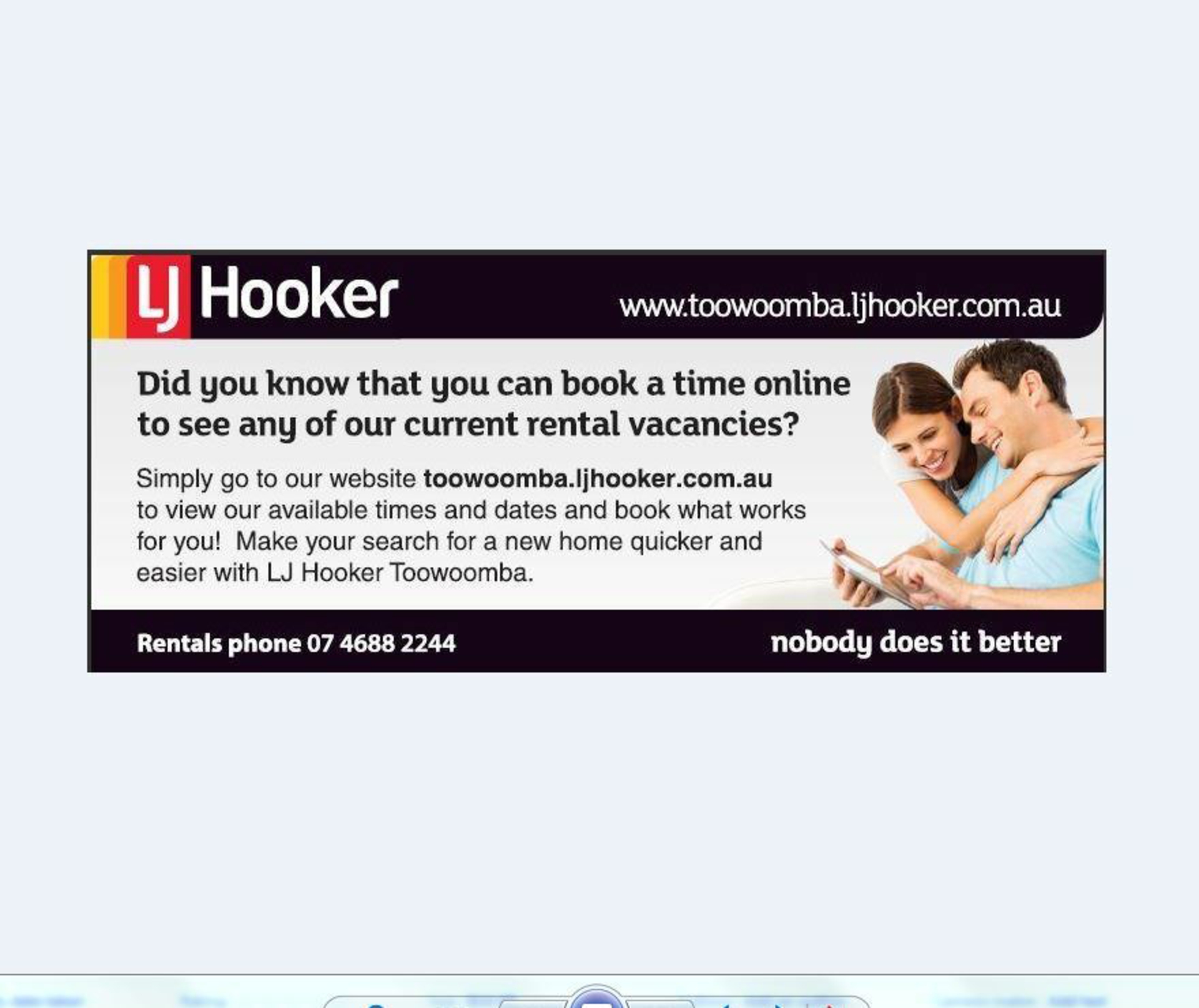 Please Note: It is the tenant/s responsibility to research the availability of NBN for this property. All costs associated with phone and internet connection and access are at cost to the tenant/s. The tenant/s may make an application to have Pay TV installed at this property through LJ Hooker Toowoomba. All approvals are at the landlord / owners discretion.