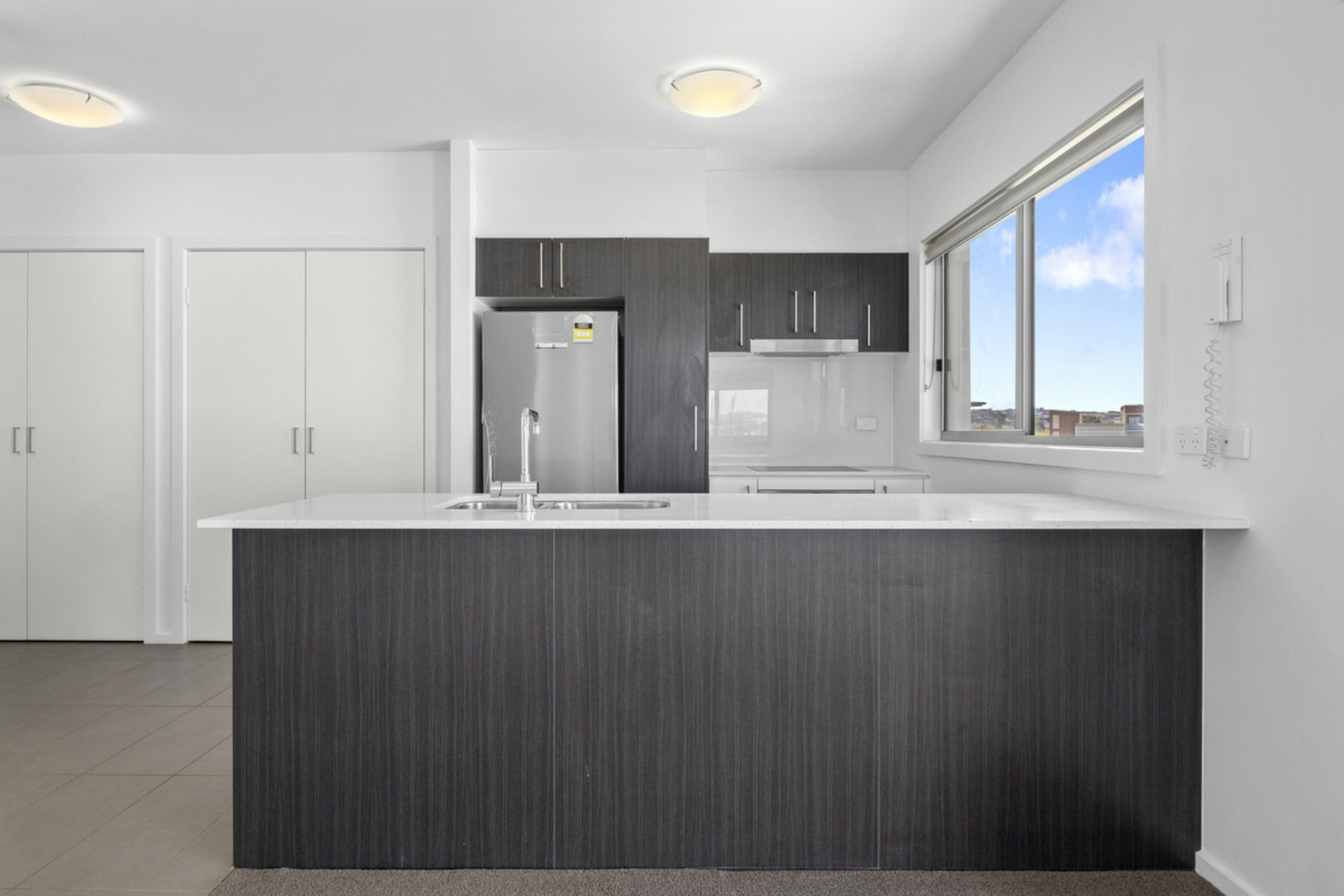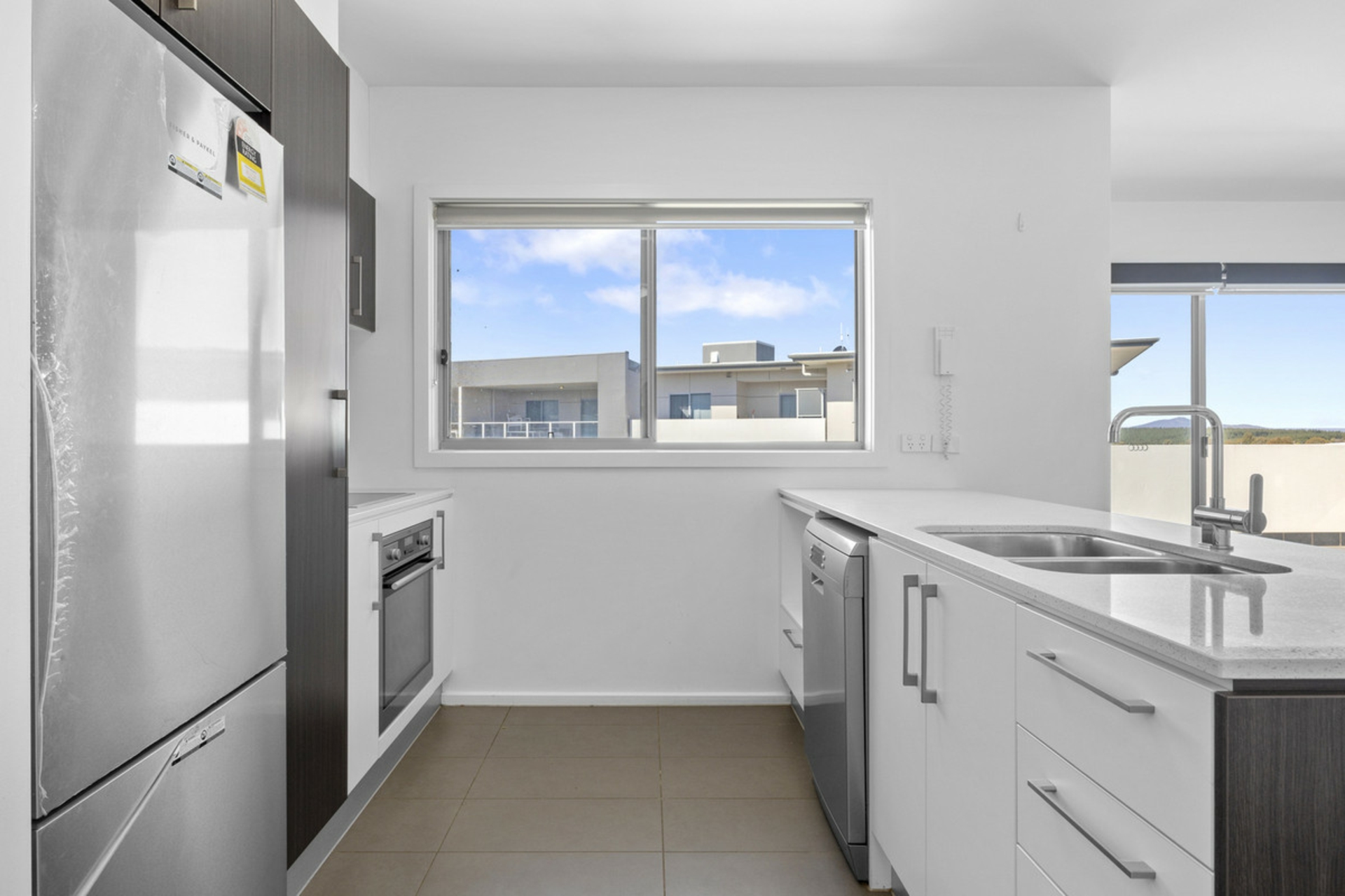 - Modern kitchen with stone benchtops and fridge