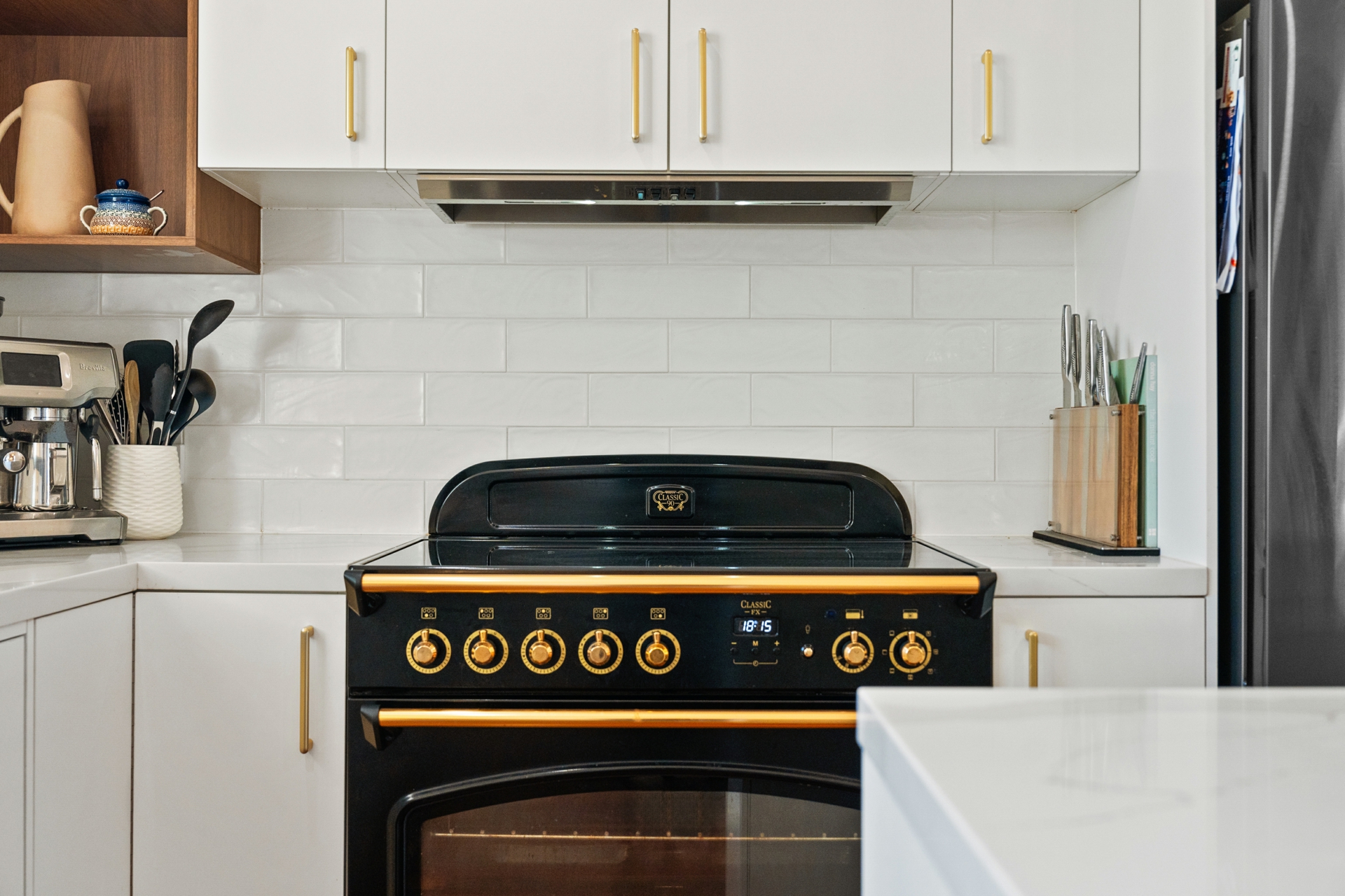 At the heart of the home sits the kitchen, reimagined with contemporary style that honours the home's character. A generous island bench anchors the space, inviting morning coffees, after-school snacks, and late-night conversations. The striking black 900mm induction cooktop and oven stands ready for everything from slow Sunday roasts to dinner parties with friends. From here, life flows effortlessly into the dining area, where garden views create a cosy, connected atmosphere.