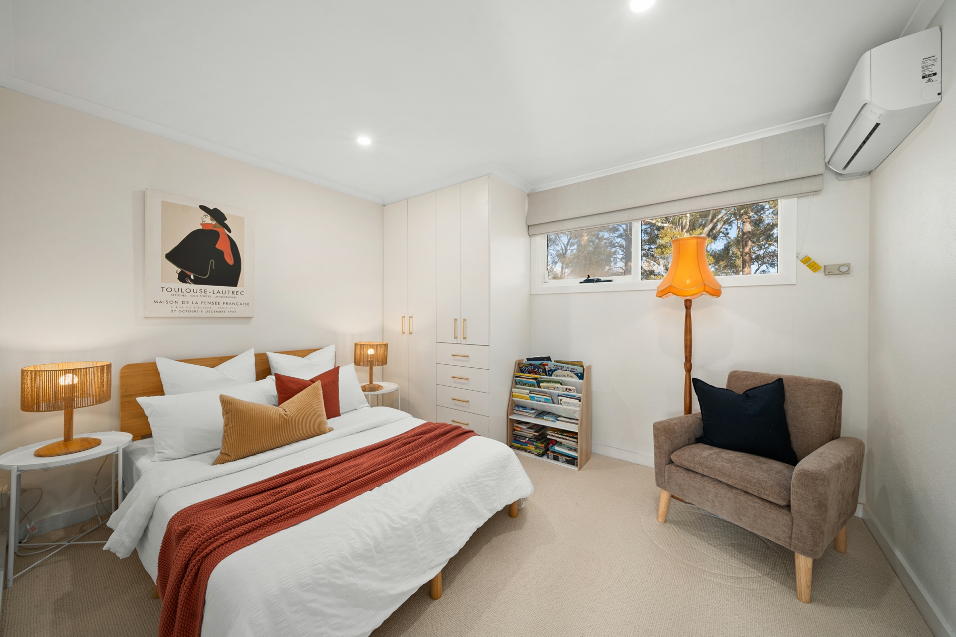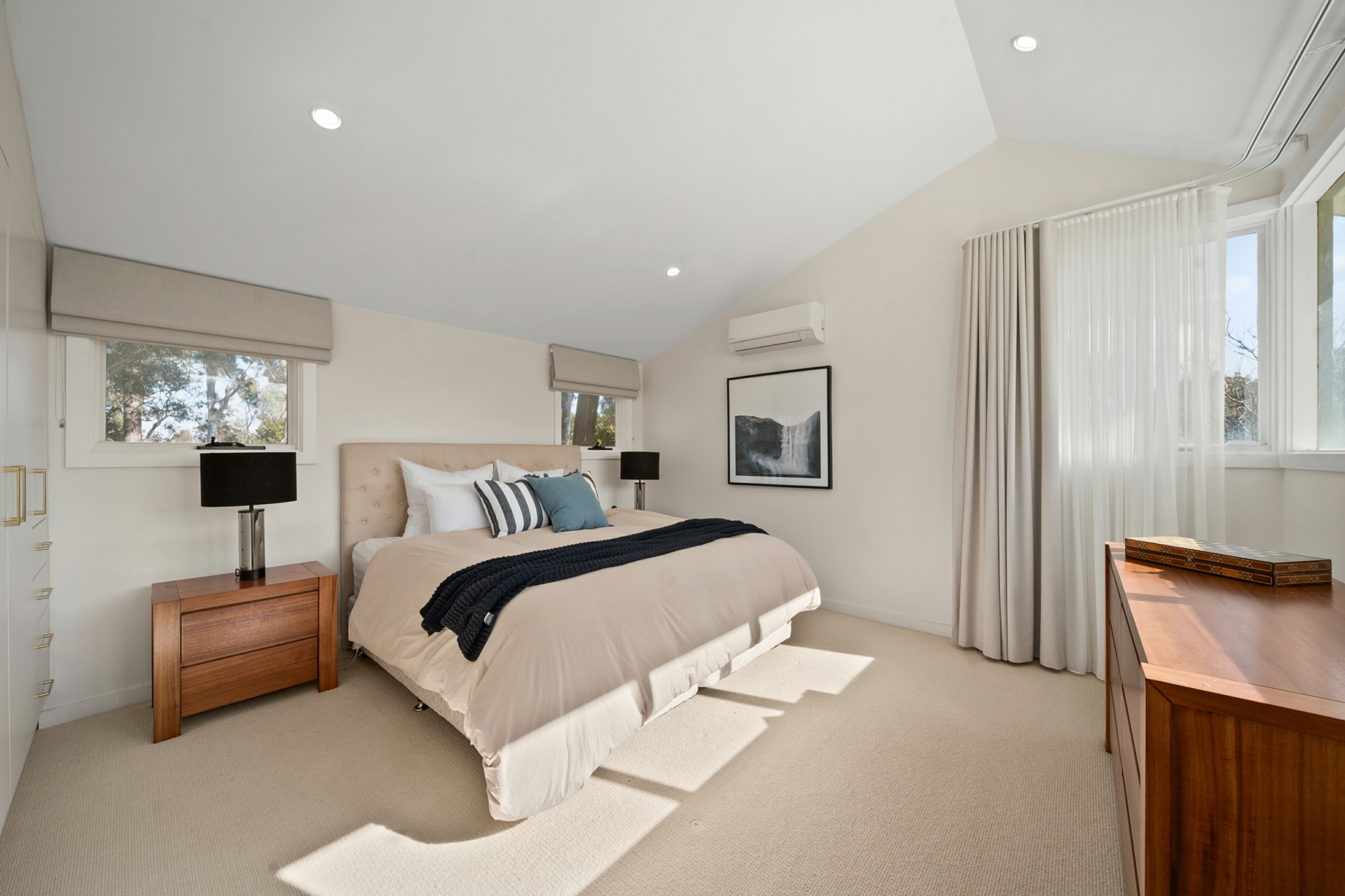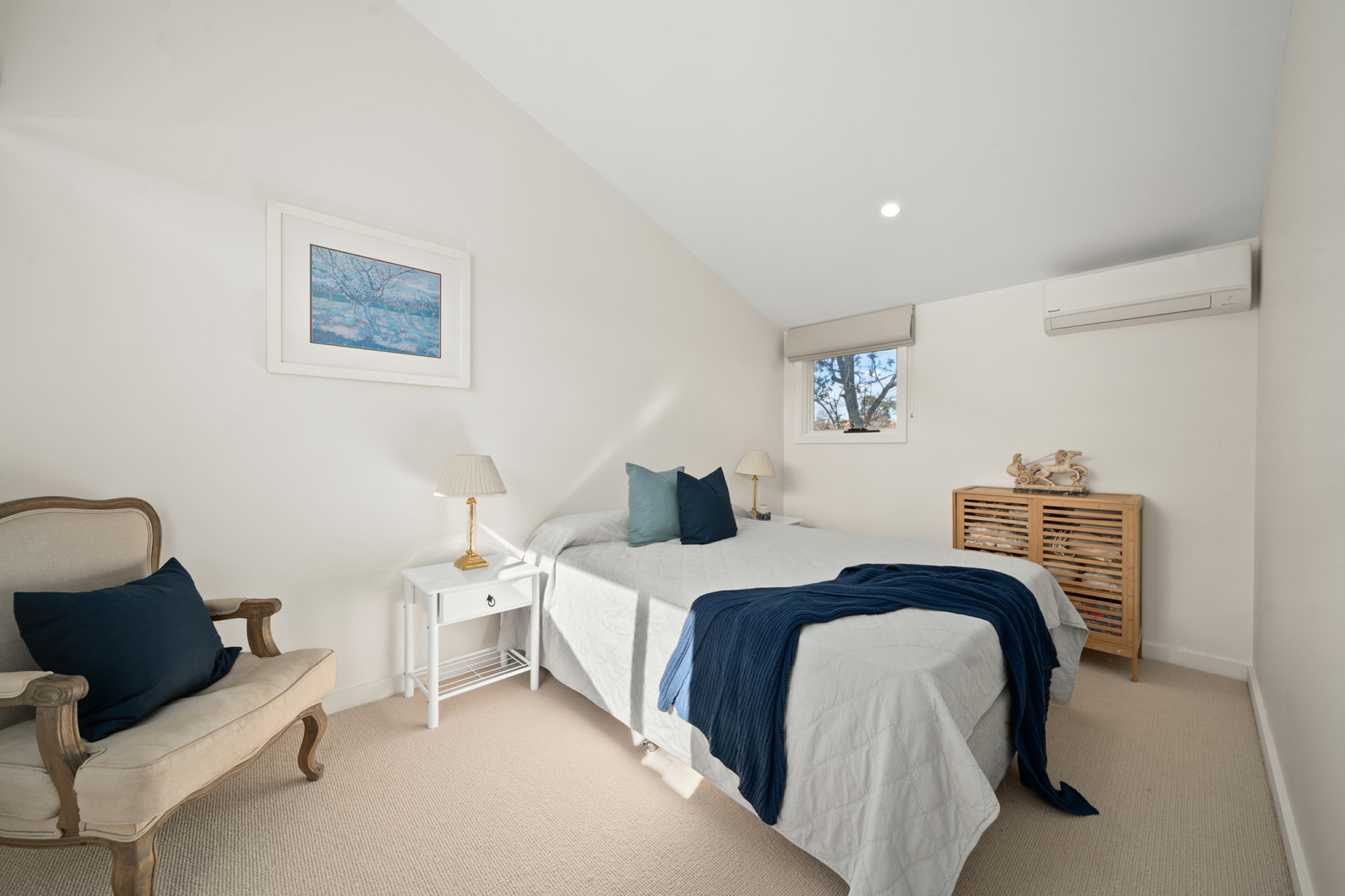 Three of the home's five bedrooms are located on the ground floor, including a bedroom with its own private ensuite and walk in-robe. Two additional bedrooms on this level feature built-in robes and are serviced by the beautifully renovated main bathroom and separate powder room. Upstairs, you'll find two light-filled bedrooms adjoined by a modern, elegant bathroom. This upper level offers excellent flexibility, ideal as a spacious primary sanctuary, teenagers retreat or separate guest bedrooms. All five bedrooms include reverse-cycle air conditioning for year-round comfort.