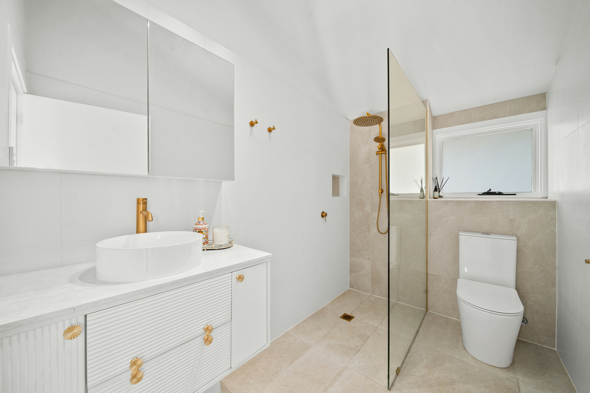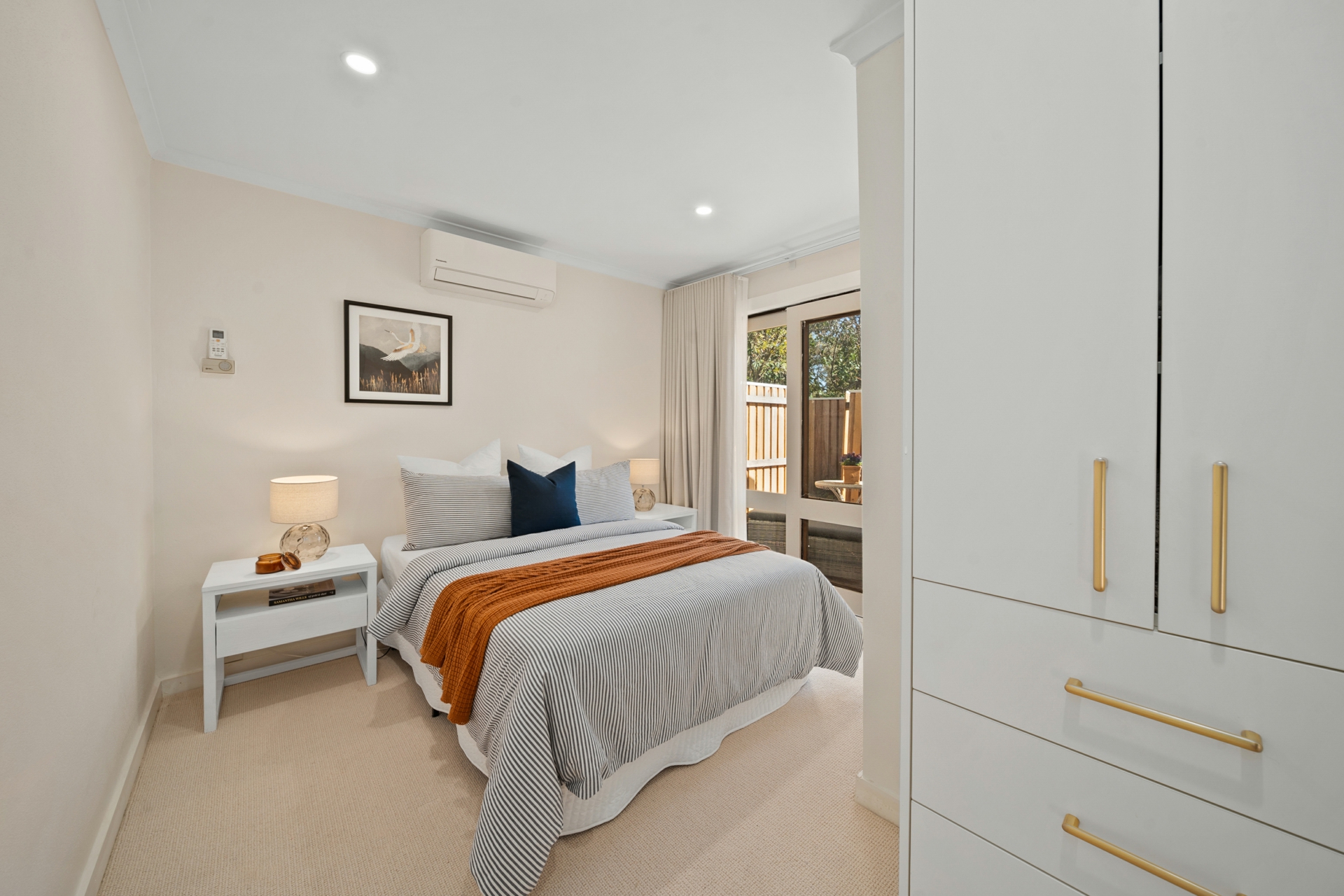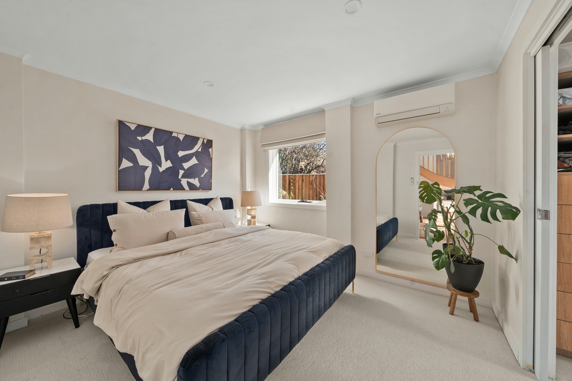 Three of the home's five bedrooms are located on the ground floor, including a bedroom with its own private ensuite and walk in-robe. Two additional bedrooms on this level feature built-in robes and are serviced by the beautifully renovated main bathroom and separate powder room. Upstairs, you'll find two light-filled bedrooms adjoined by a modern, elegant bathroom. This upper level offers excellent flexibility, ideal as a spacious primary sanctuary, teenagers retreat or separate guest bedrooms. All five bedrooms include reverse-cycle air conditioning for year-round comfort.