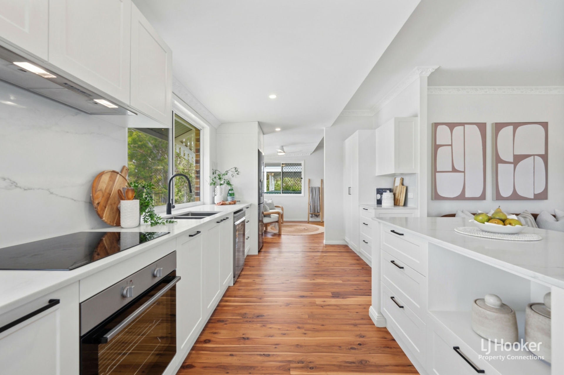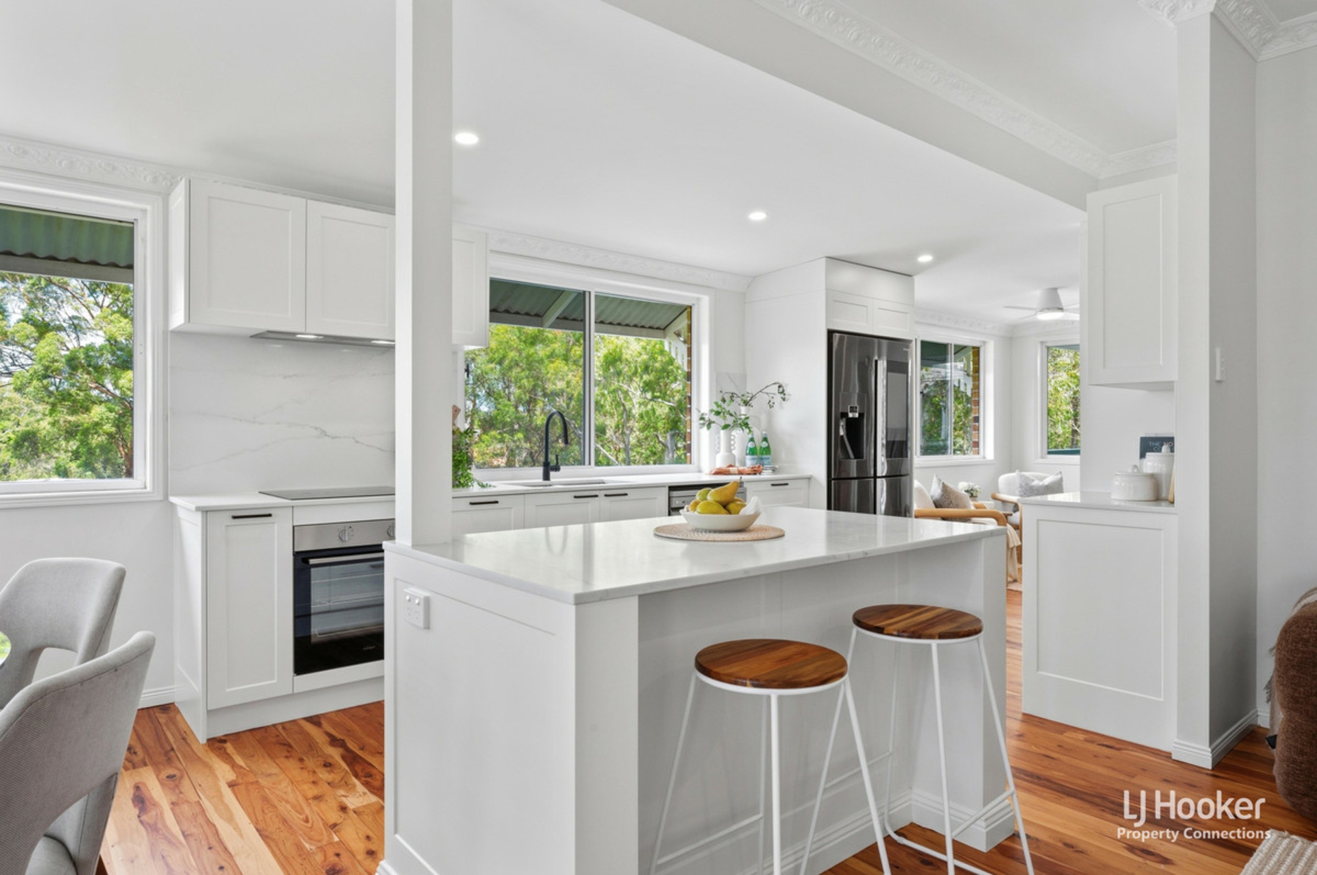 At the heart of the home is the beautifully renovated kitchen, perfectly positioned to overlook the main living and dining areas while taking full advantage of the elevated outlook. Large windows invite in natural light and frame the leafy views beyond, enhancing the sense of space and connection to the outdoors. From here, the home flows effortlessly out to the expansive entertainer's deck-an ideal setting for hosting guests or relaxing while enjoying the breezes and serene backdrop. Whether entertaining or unwinding, this space delivers both comfort and appeal.